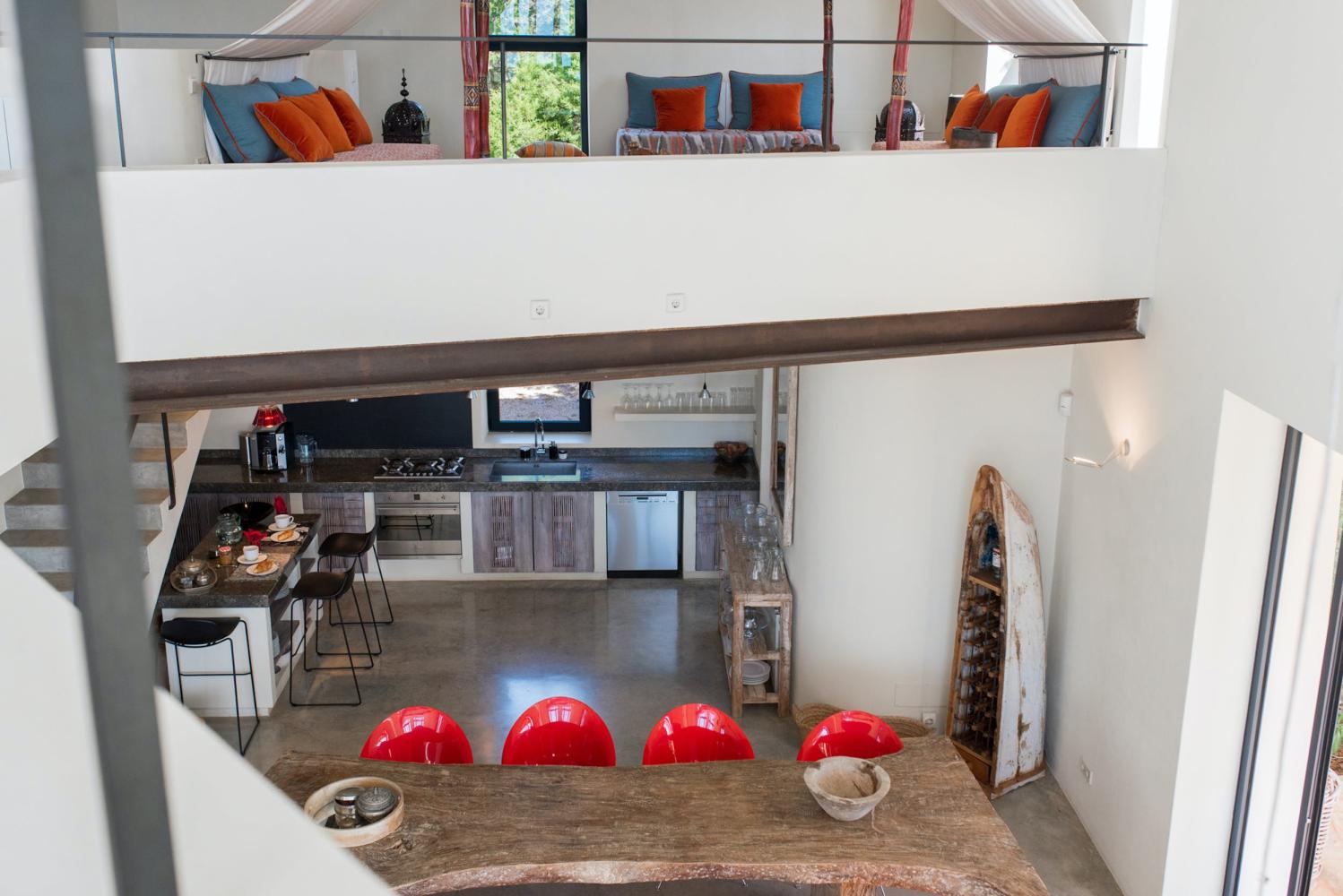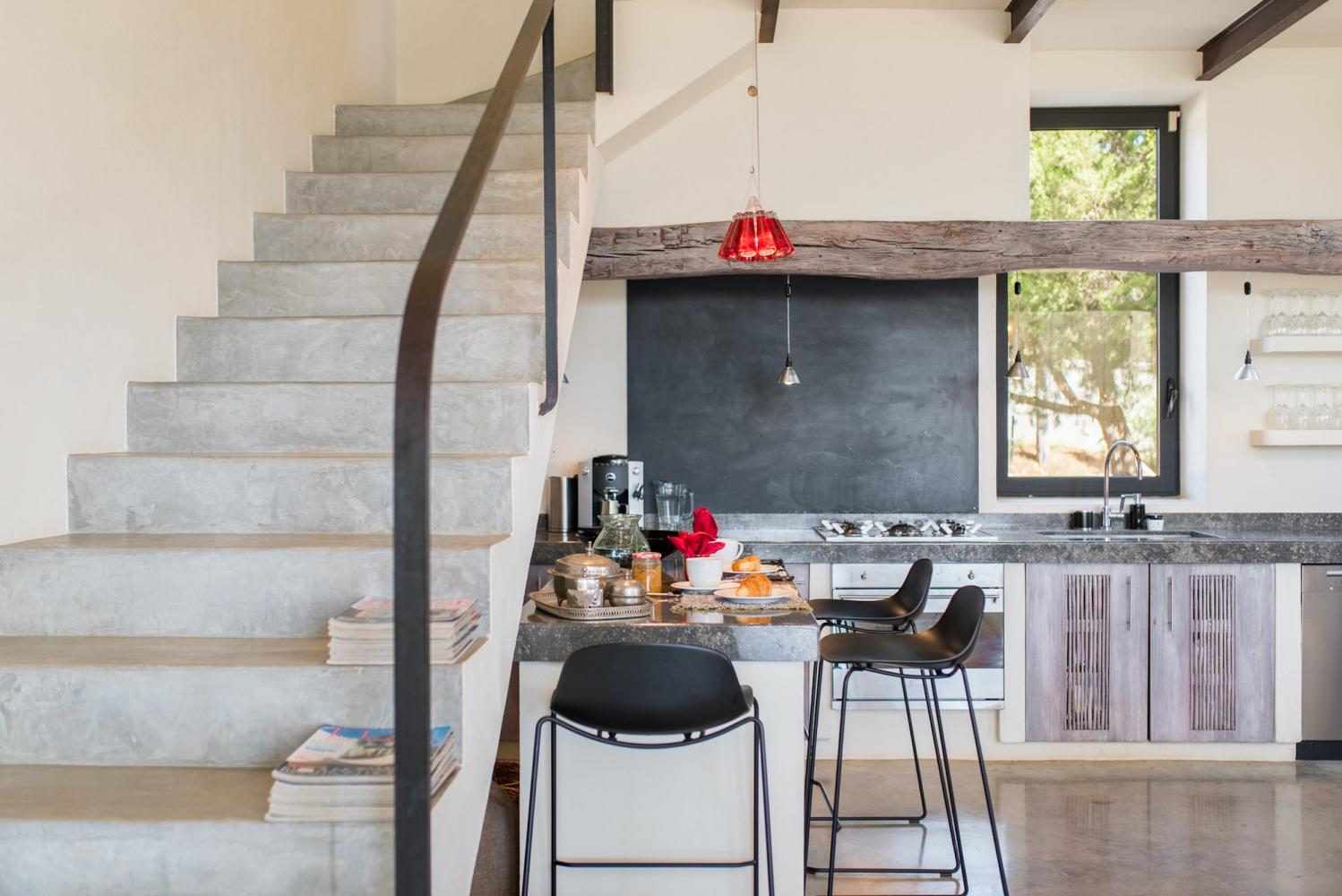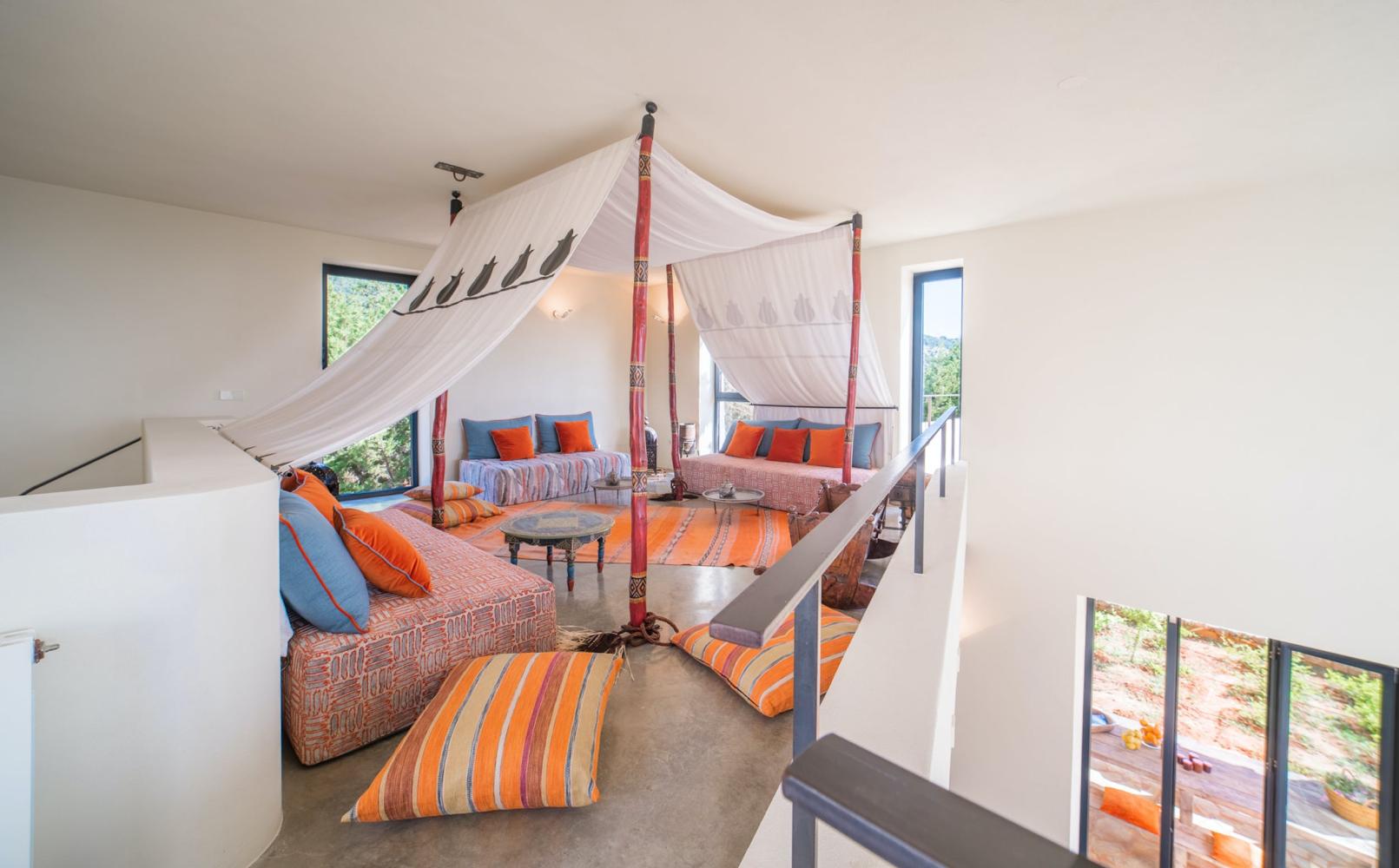 Three calm bedrooms upstairs, each with a private terrace to enjoy the evening breeze or sunrise, carry on the bohemian theme. With its dramatic feature bathroom, comfortable fireplace for stays during shoulder season, and two terraces that cinematically frame the hillsides and the sea, the master suite is a standout. The second double bedroom offers a peaceful, romantic vantage point over the gardens, complete with a private terrace and en suite bathroom. With twin beds, a private terrace, an en suite bathroom, and a lounge area and daybed, the third bedroom is perfect for reading, playing, or providing families with additional flexibility (the total occupancy stays at a comfortable six guests).