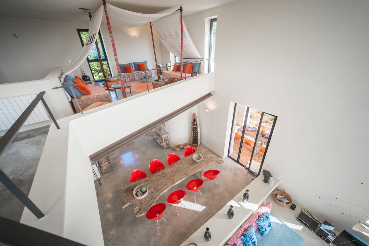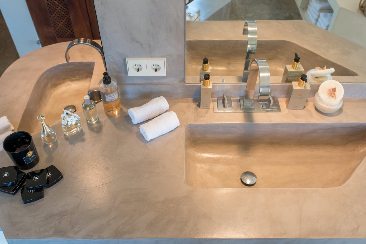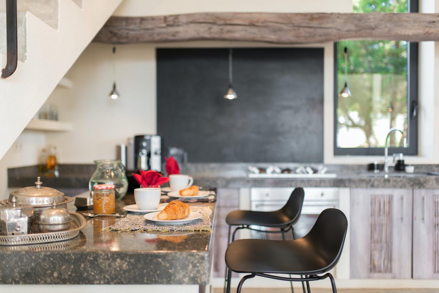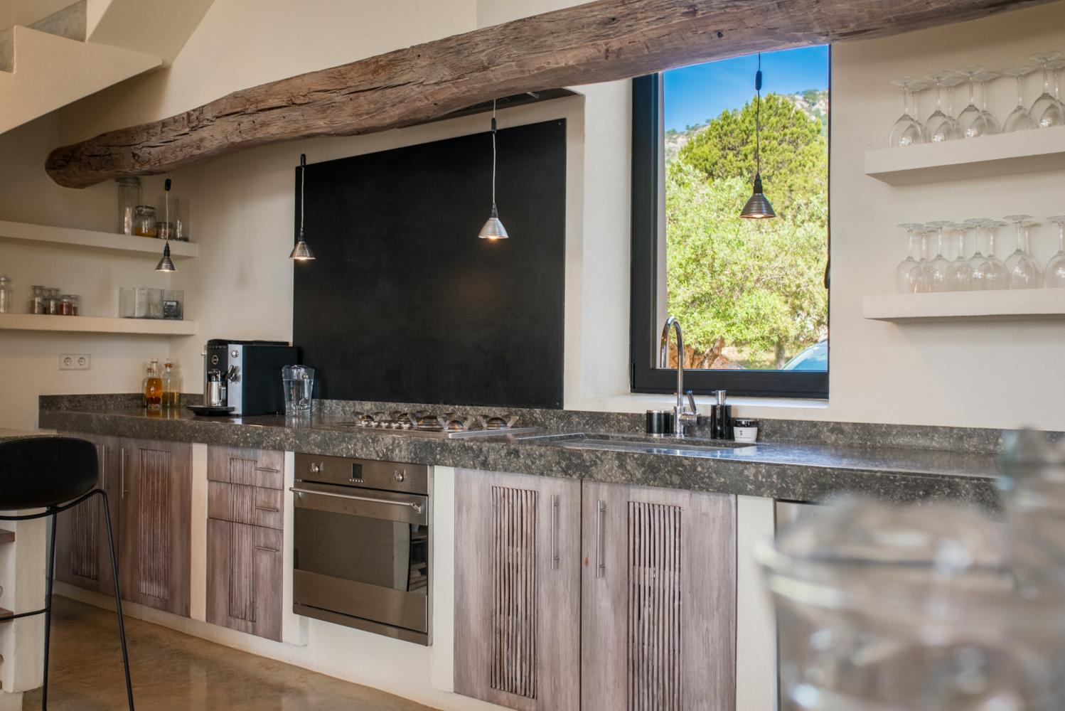Three calm bedrooms upstairs, each with a private terrace to enjoy the evening breeze or sunrise, carry on the bohemian theme. With its dramatic feature bathroom, comfortable fireplace for stays during shoulder season, and two terraces that cinematically frame the hillsides and the sea, the master suite is a standout. The second double bedroom offers a peaceful, romantic vantage point over the gardens, complete with a private terrace and en suite bathroom. With twin beds, a private terrace, an en suite bathroom, and a lounge area and daybed, the third bedroom is perfect for reading, playing, or providing families with additional flexibility (the total occupancy stays at a comfortable six guests).
