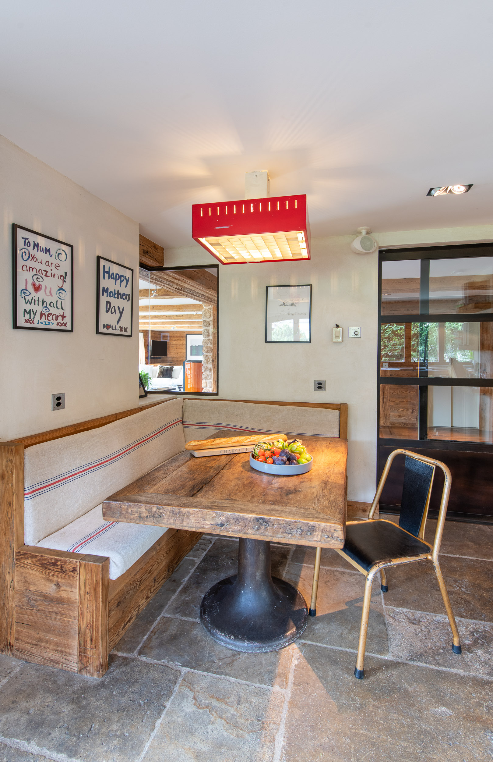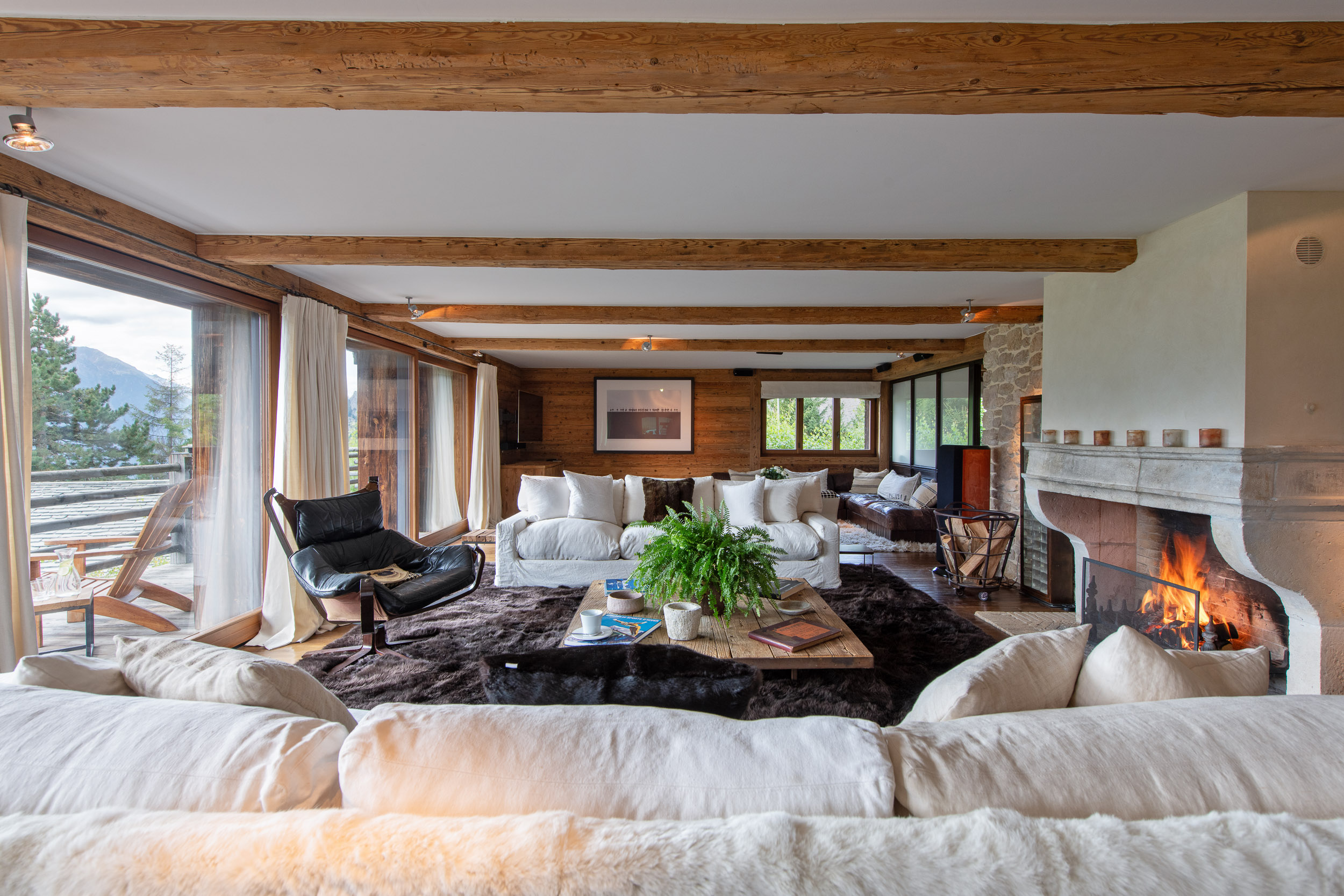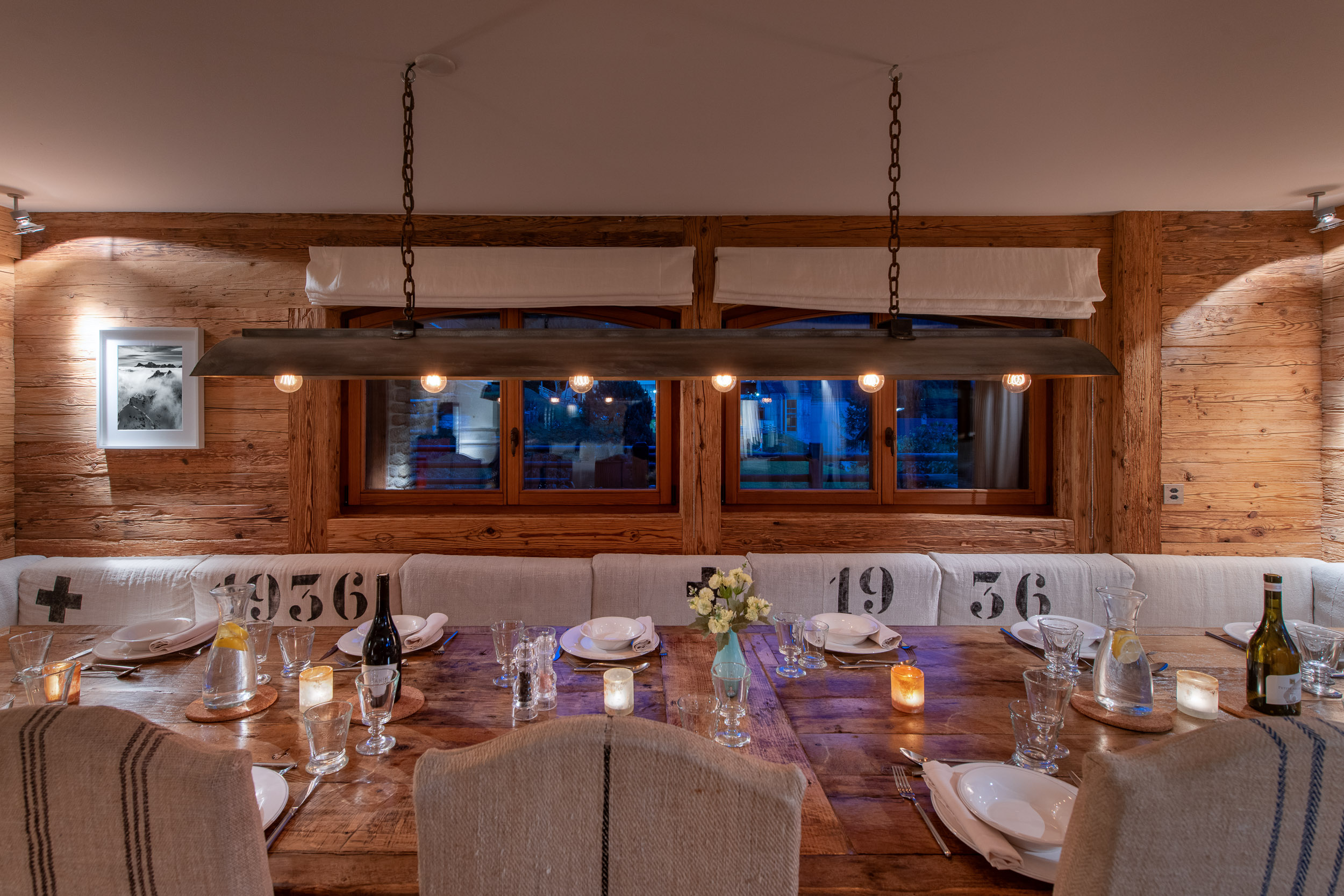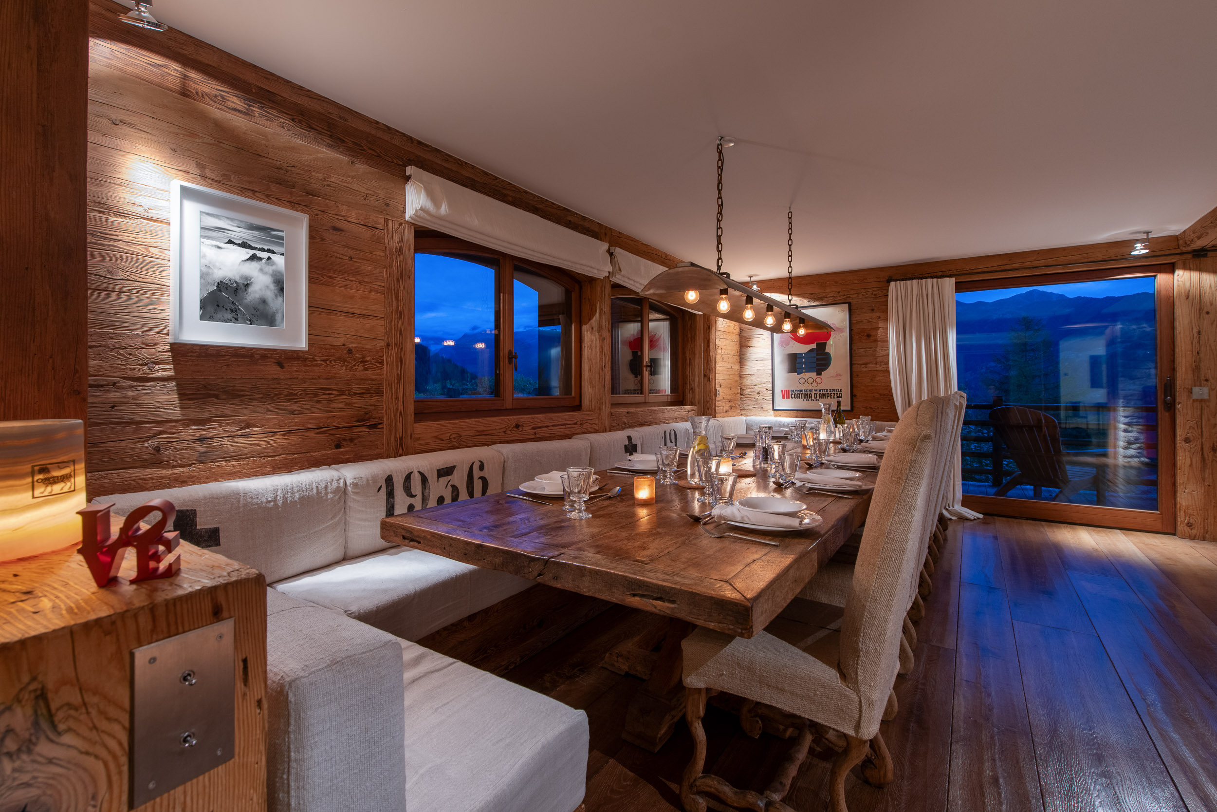 A long fire glows in the open-plan salon, pop-art color and sculptural lighting sparkle against hand-finished stone and wood, and the dining table sits sixteen beneath a ceiling that appears to take its height from the peaks outside.