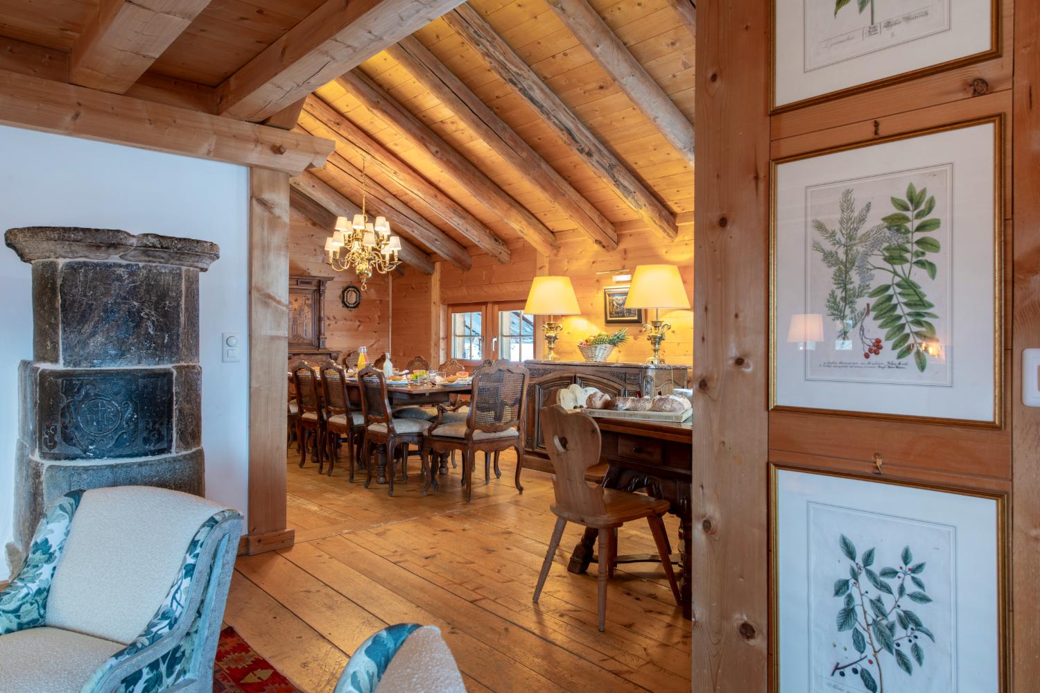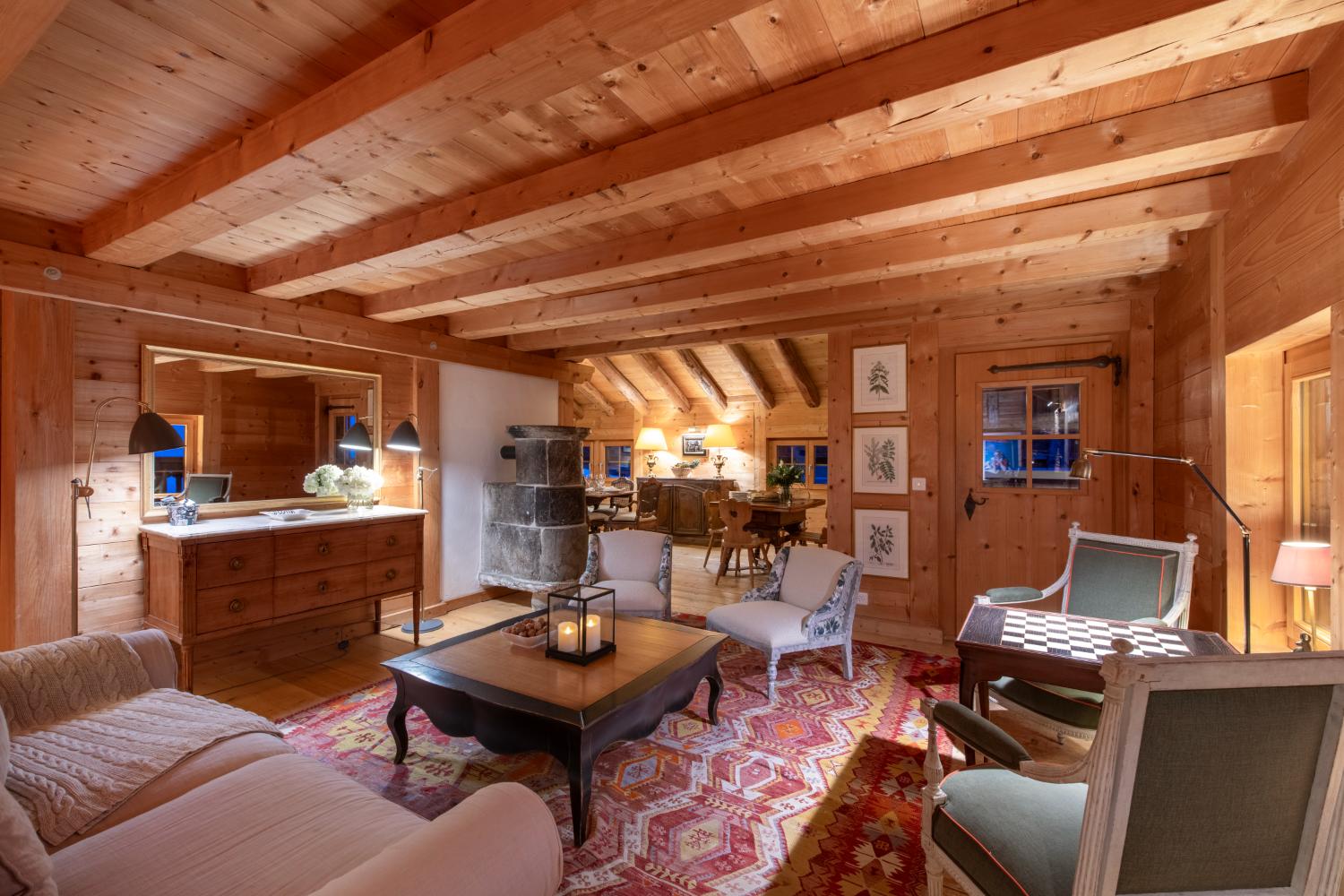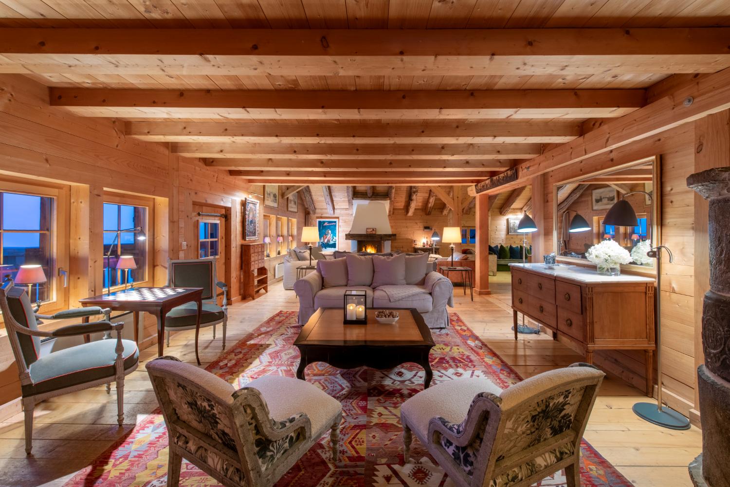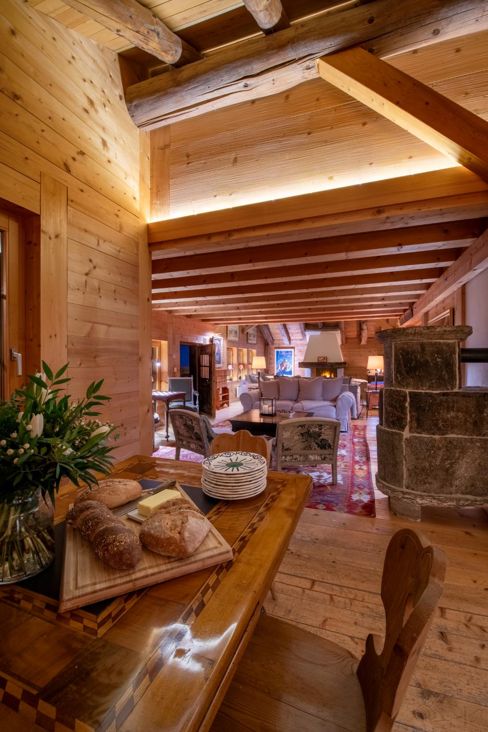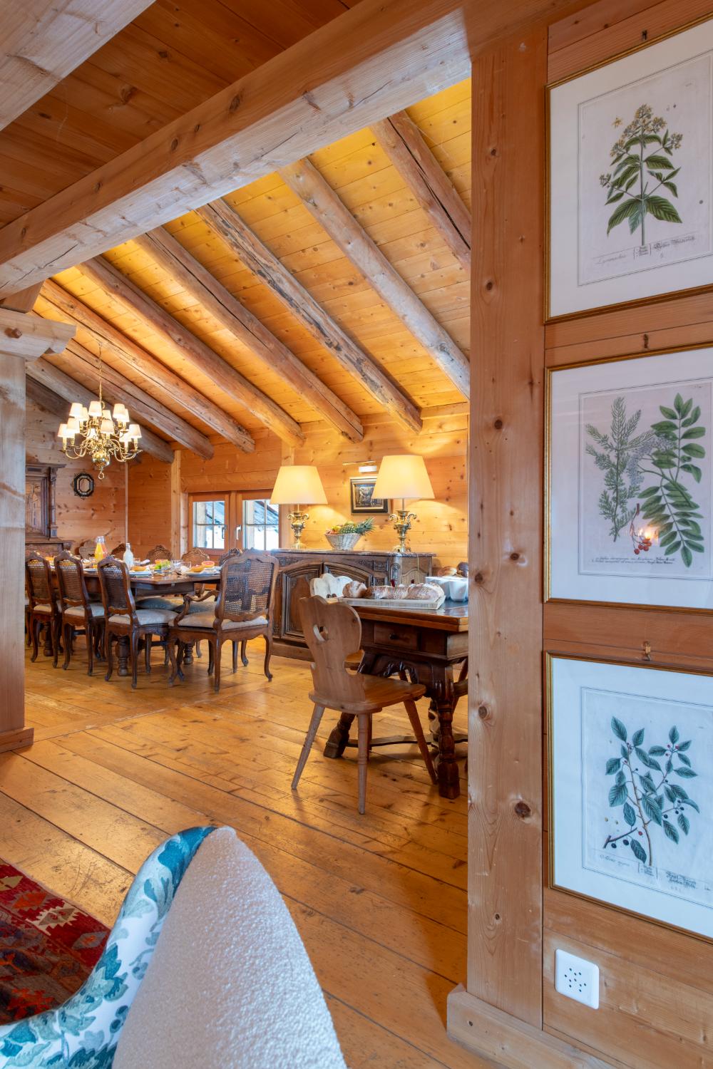 Down on the main floor the house opens up. A warm open-plan living, dining and kitchen area wraps around a wood-burning fireplace — the true hearth of the chalet. Plush sofas invite long conversations and board games; a tucked-away TV snug promises cosy movie nights; and a chess table waits for a friendly duel. When the door to the south balcony is opened, the valley panorama becomes part of the room, especially beautiful at sunset when the sky paints the peaks in rose and gold.