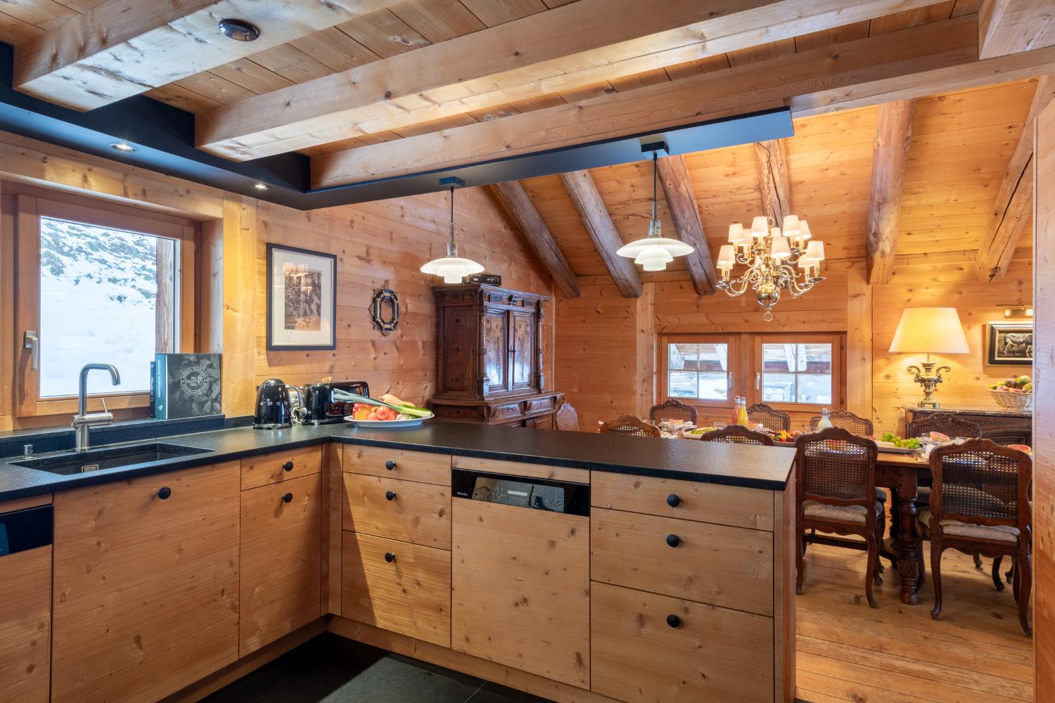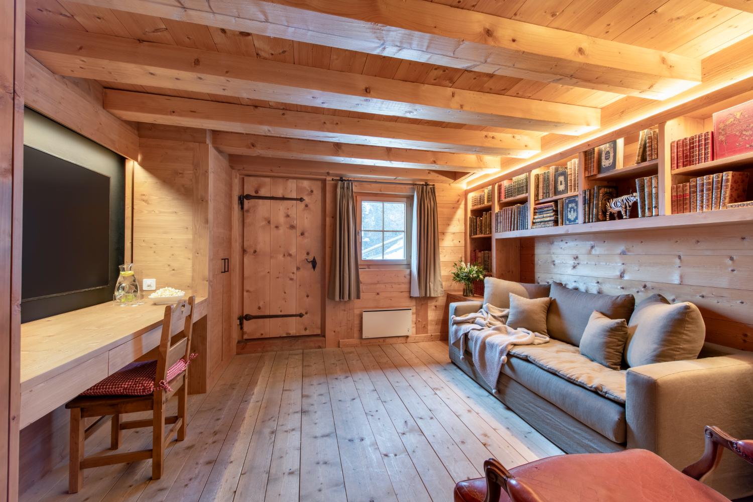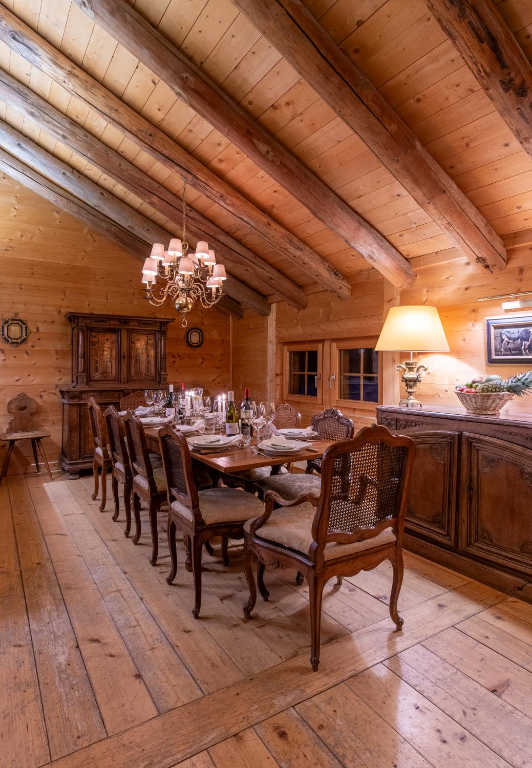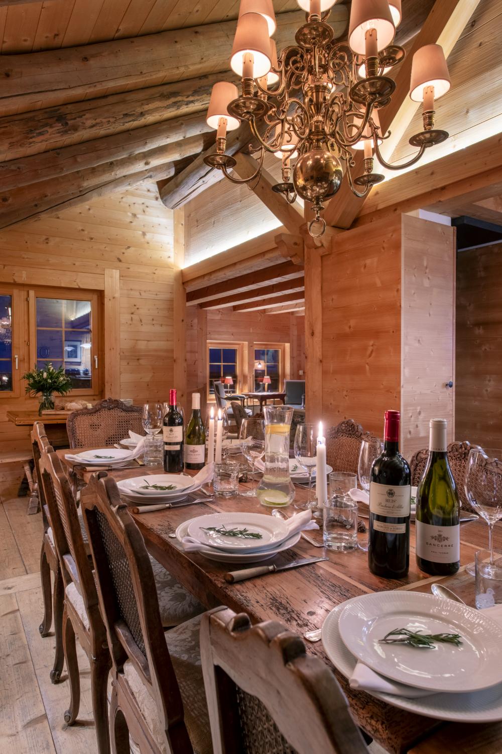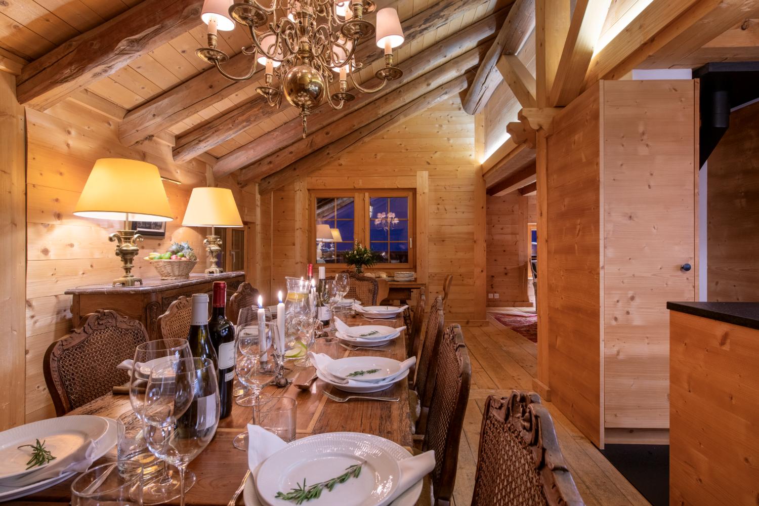 Down on the main floor the house opens up. A warm open-plan living, dining and kitchen area wraps around a wood-burning fireplace — the true hearth of the chalet. Plush sofas invite long conversations and board games; a tucked-away TV snug promises cosy movie nights; and a chess table waits for a friendly duel. When the door to the south balcony is opened, the valley panorama becomes part of the room, especially beautiful at sunset when the sky paints the peaks in rose and gold.