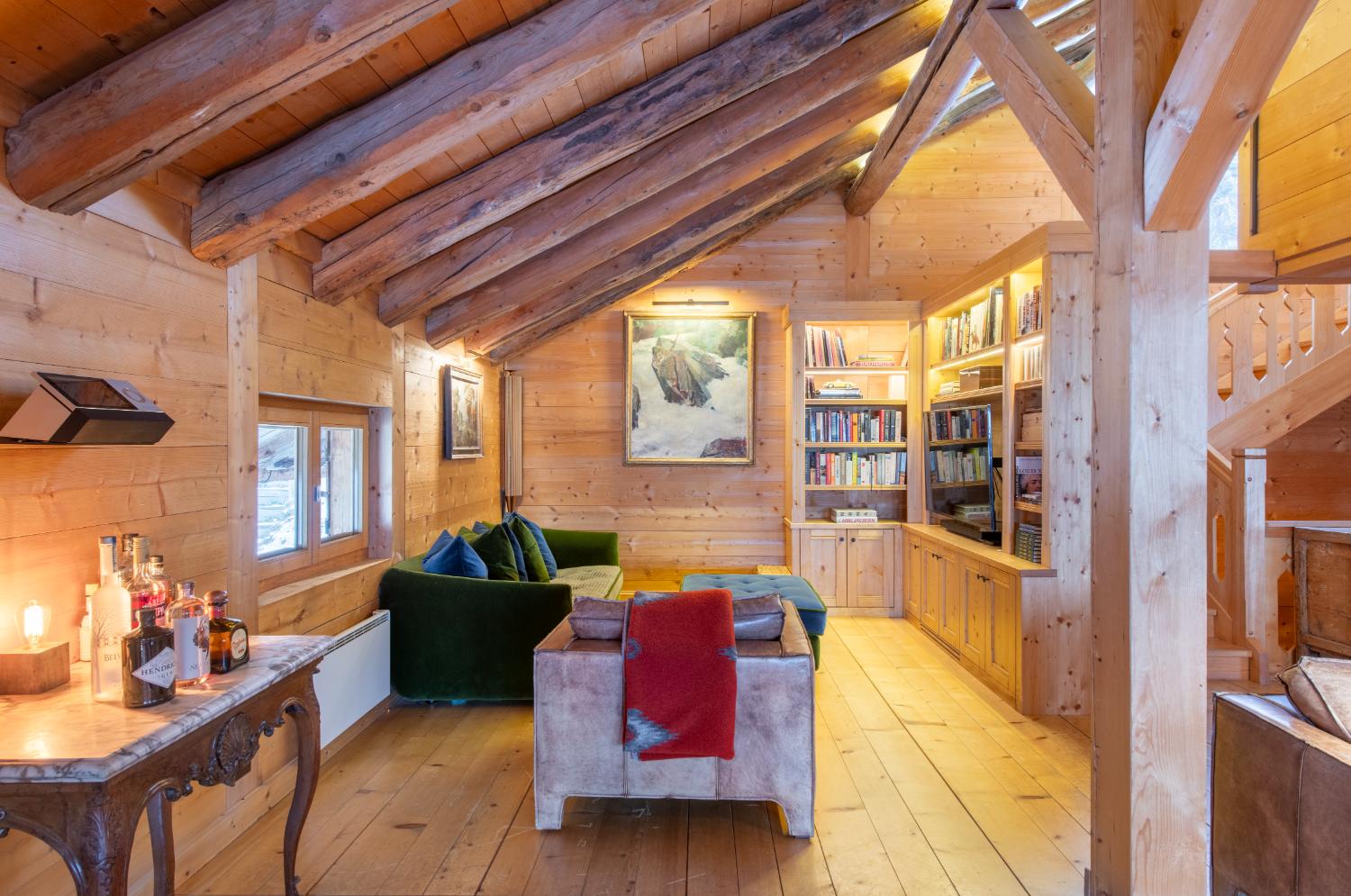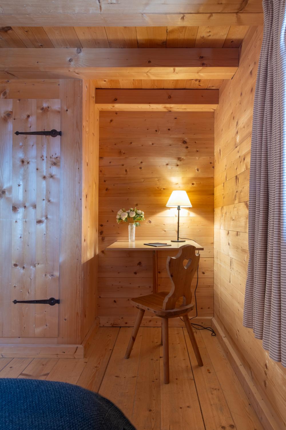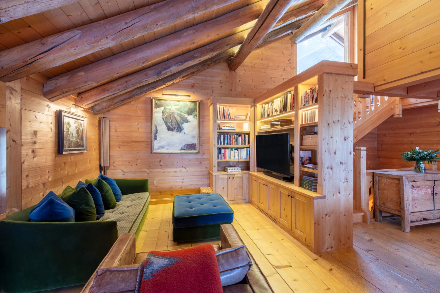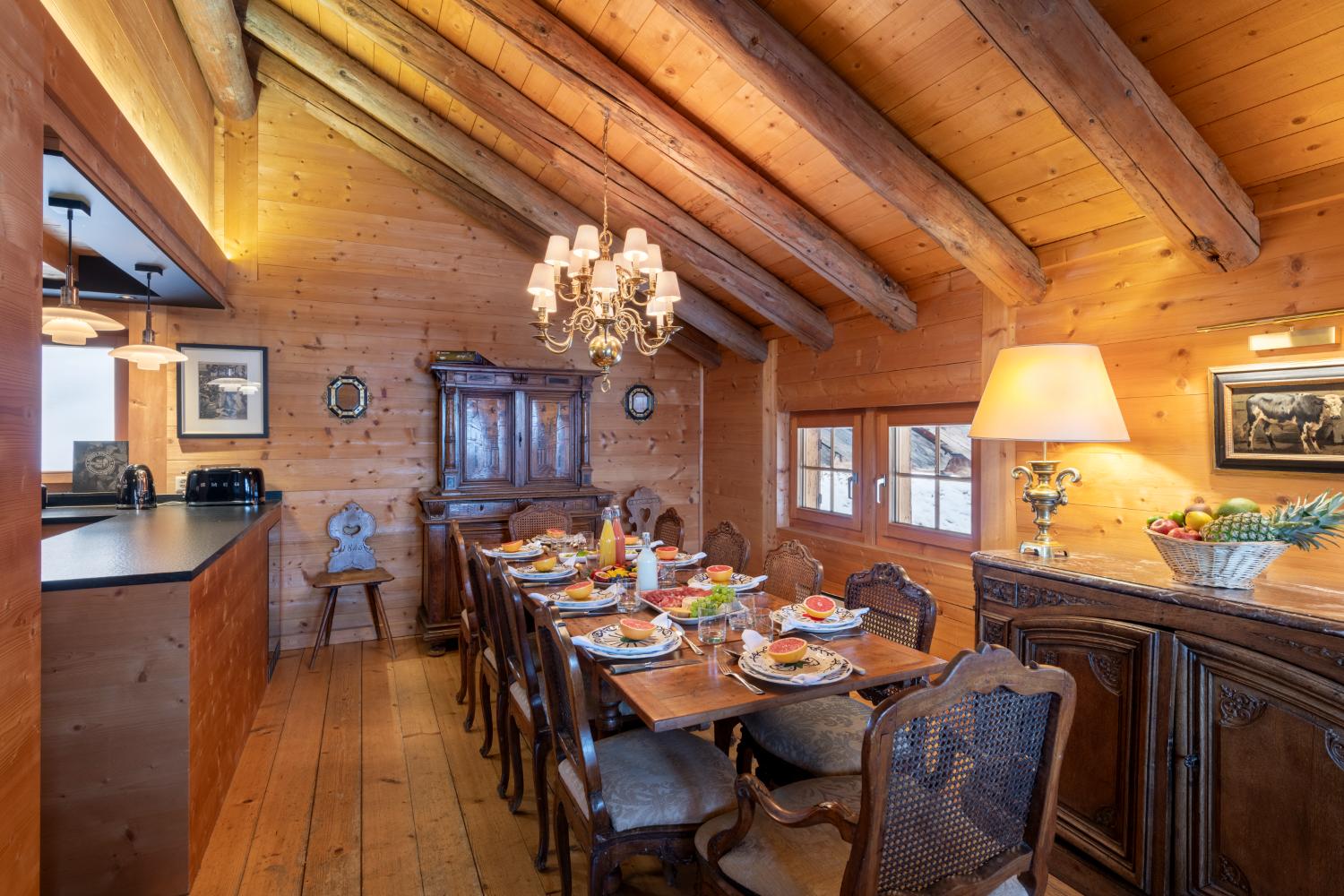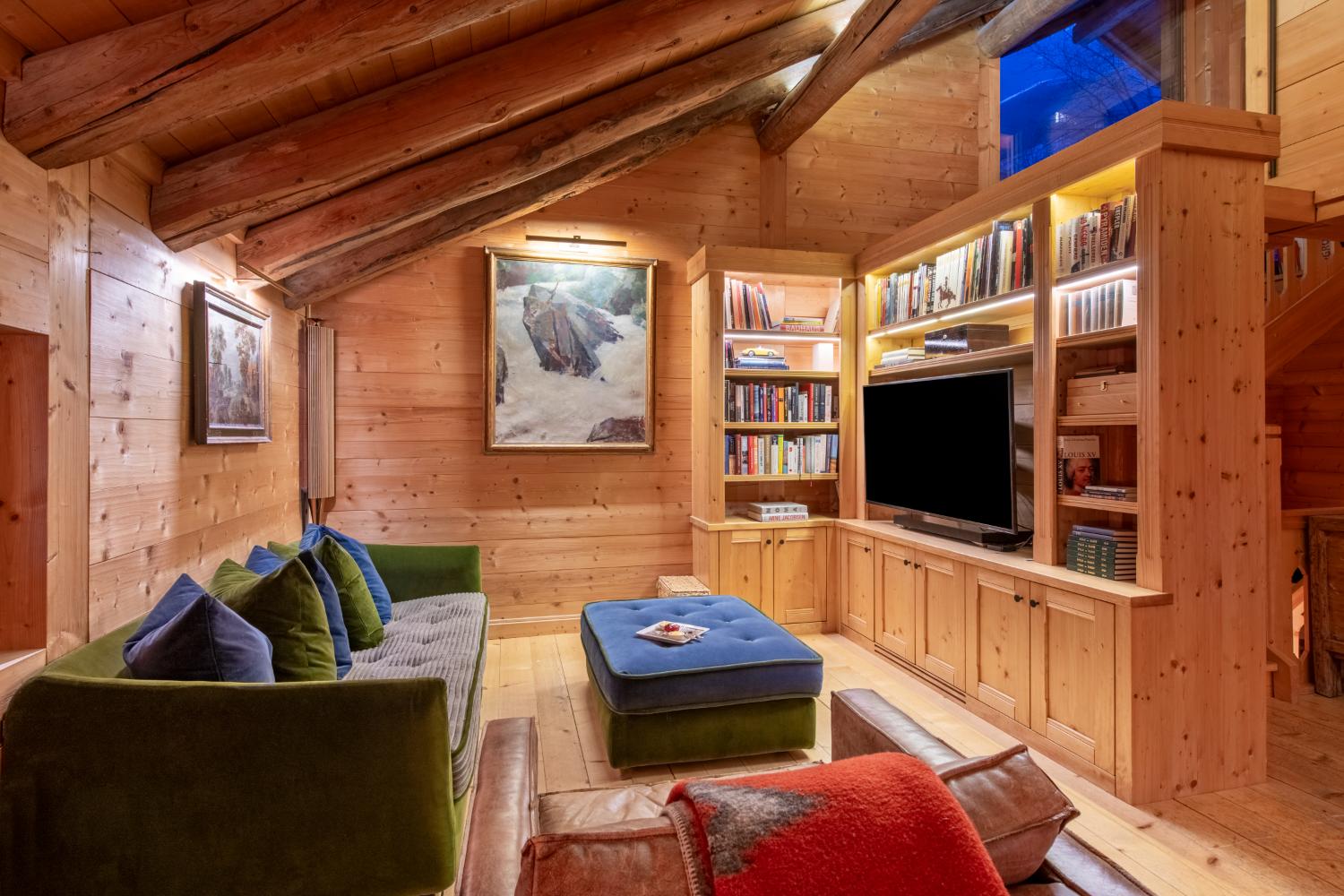 Down on the main floor the house opens up. A warm open-plan living, dining and kitchen area wraps around a wood-burning fireplace — the true hearth of the chalet. Plush sofas invite long conversations and board games; a tucked-away TV snug promises cosy movie nights; and a chess table waits for a friendly duel. When the door to the south balcony is opened, the valley panorama becomes part of the room, especially beautiful at sunset when the sky paints the peaks in rose and gold.