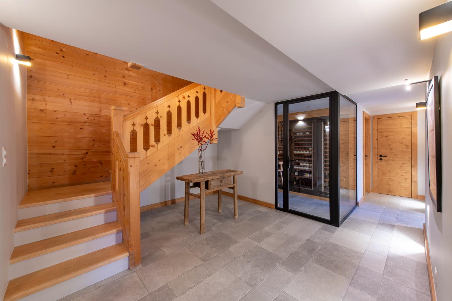 The ground floor is a private wellness world. Ease sore muscles in the sauna, cool off in the plunge pool, and then take the experience outside to the hot tub under the open sky — a perfect way to end a day on the mountain. A wine cellar with a small bar creates an atmospheric setting for tasting evenings (note: the wine stored there is for display/collection and is not for sale). Practical comforts — a guest WC, private laundry, and a ski room with heated boot warmers and generous storage — keep everyday life effortless.