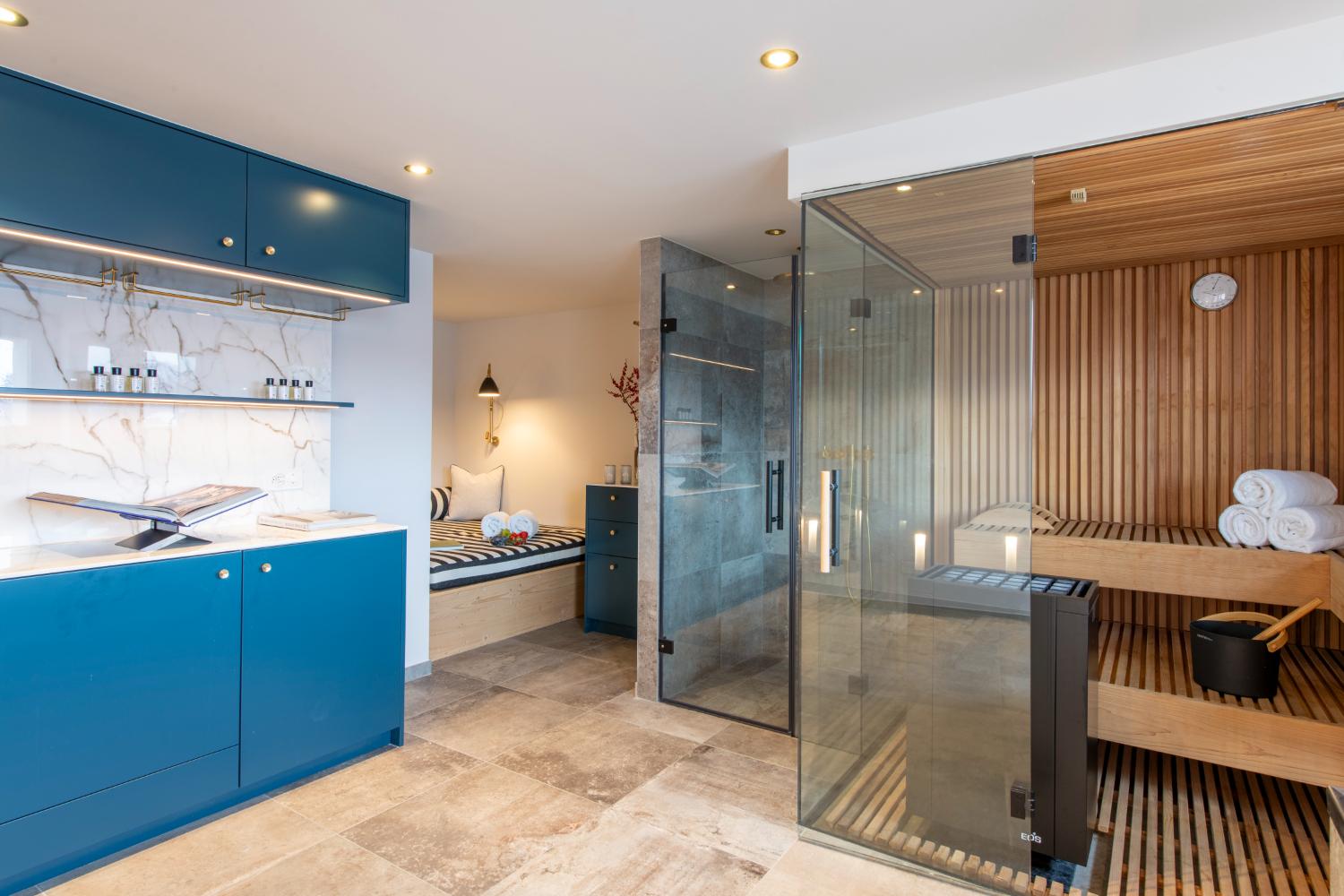 Spa suite: sauna, plunge pool, relaxation area, and adjacent outdoor hot tub.