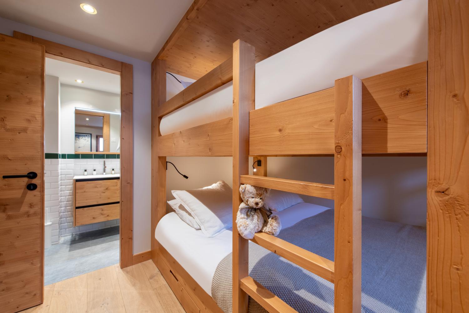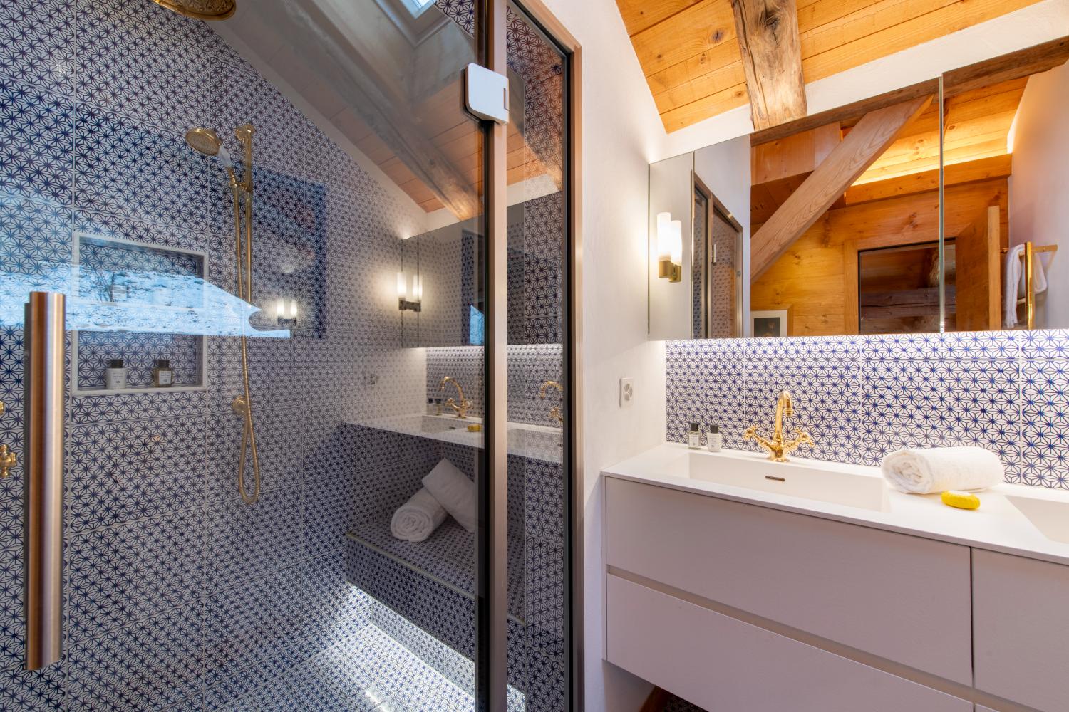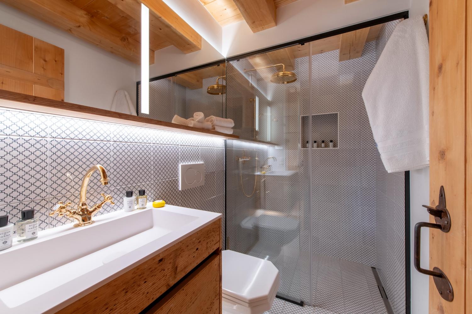 Move through the house and you’ll find bedrooms that balance alpine character with thoughtful contemporary design: a spacious double with a TV and en-suite, two bright twin bedrooms, a children’s bunk room for two, plus a double bunk room on the ground floor. Bathrooms are finished with mosaic-style tiles and elegant gold fixtures — small luxuries that feel considered rather than showy.
