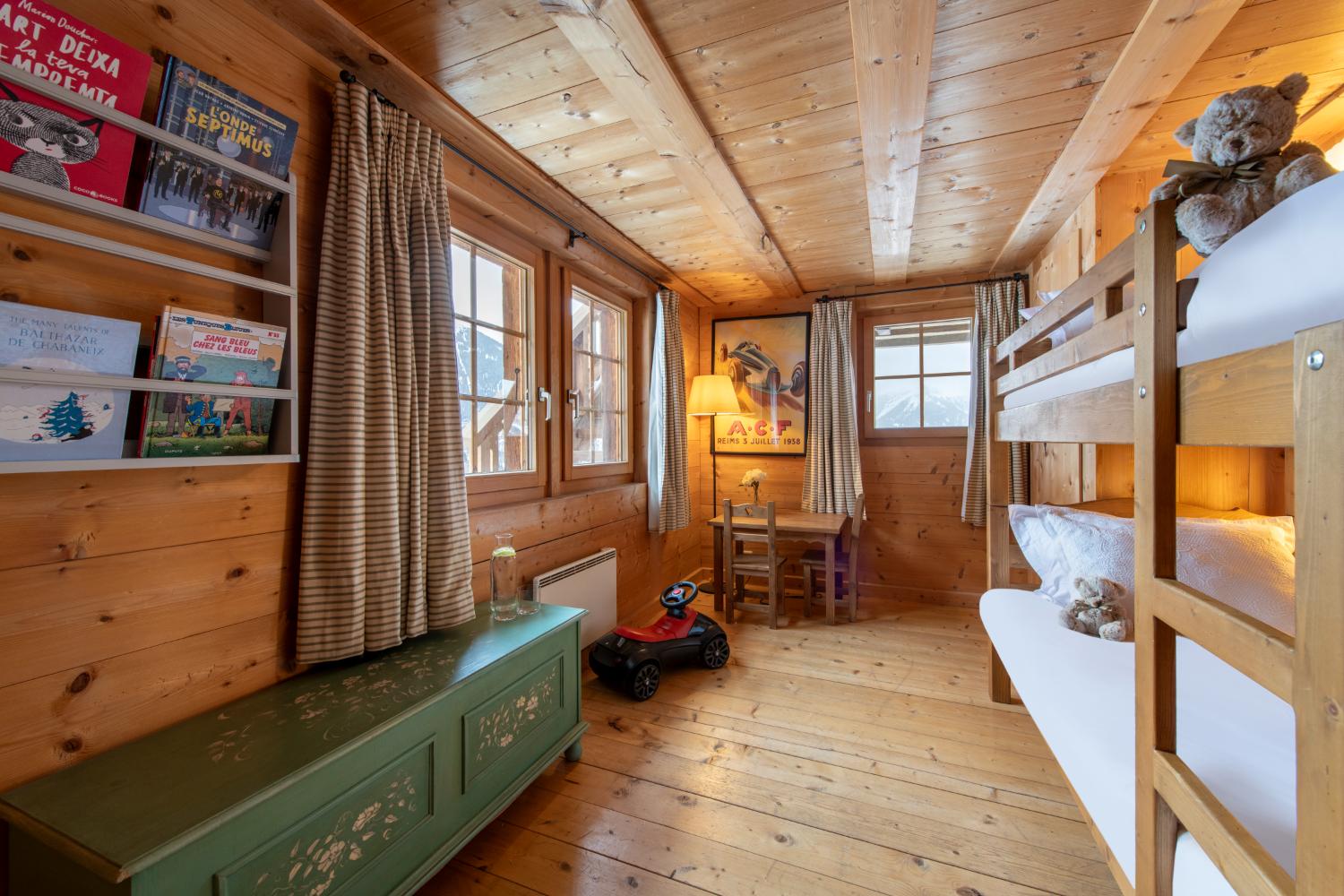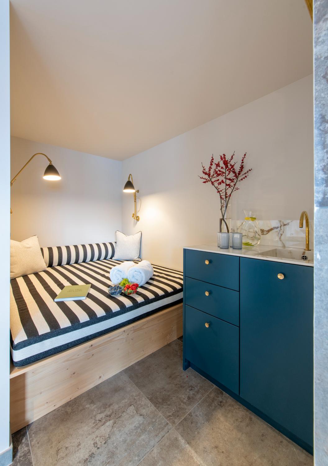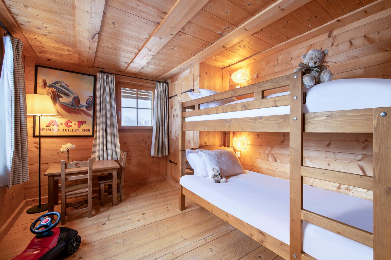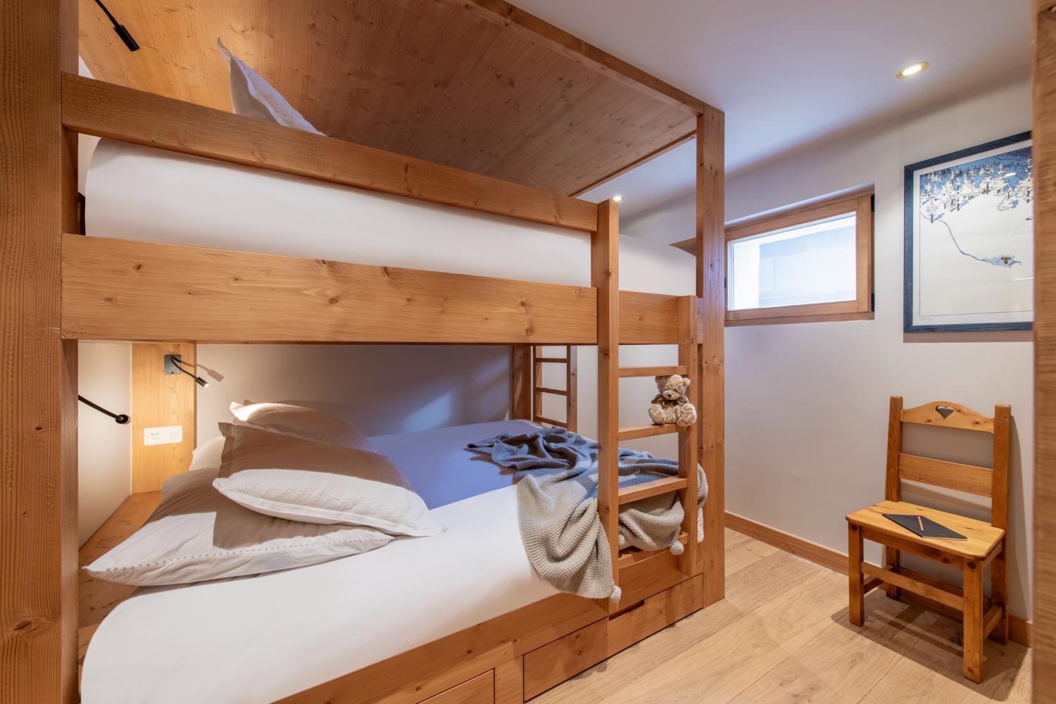 Move through the house and you’ll find bedrooms that balance alpine character with thoughtful contemporary design: a spacious double with a TV and en-suite, two bright twin bedrooms, a children’s bunk room for two, plus a double bunk room on the ground floor. Bathrooms are finished with mosaic-style tiles and elegant gold fixtures — small luxuries that feel considered rather than showy.