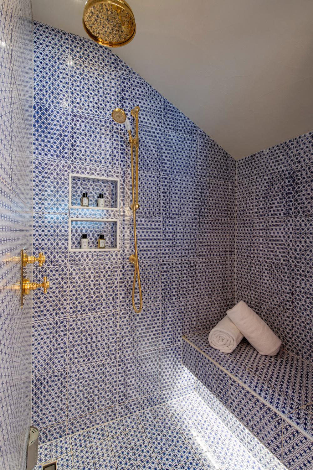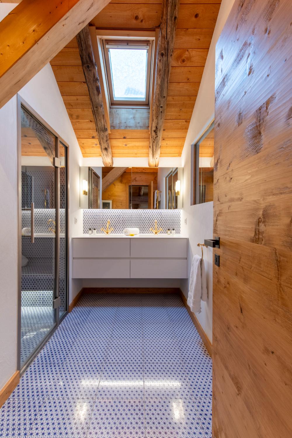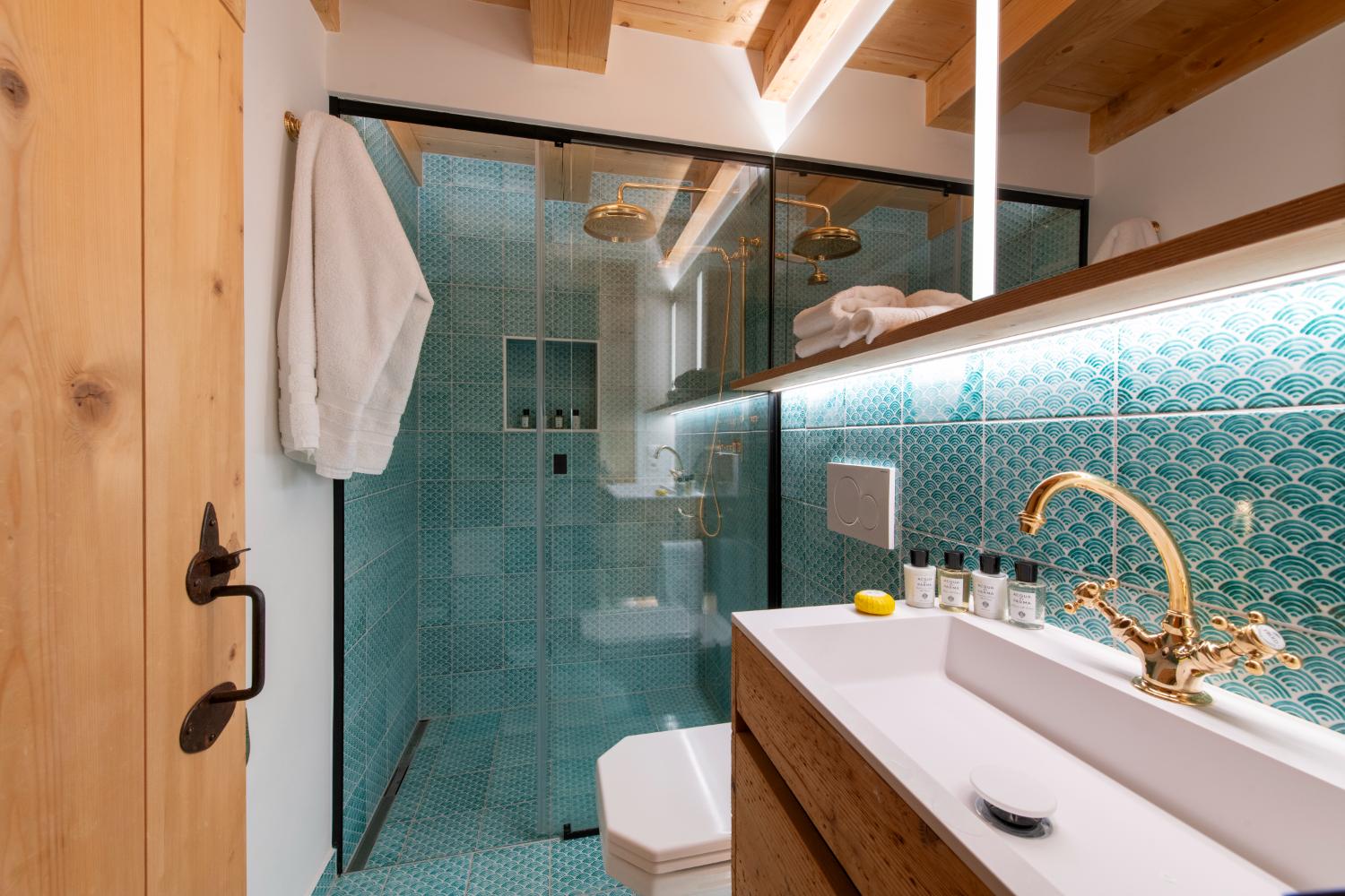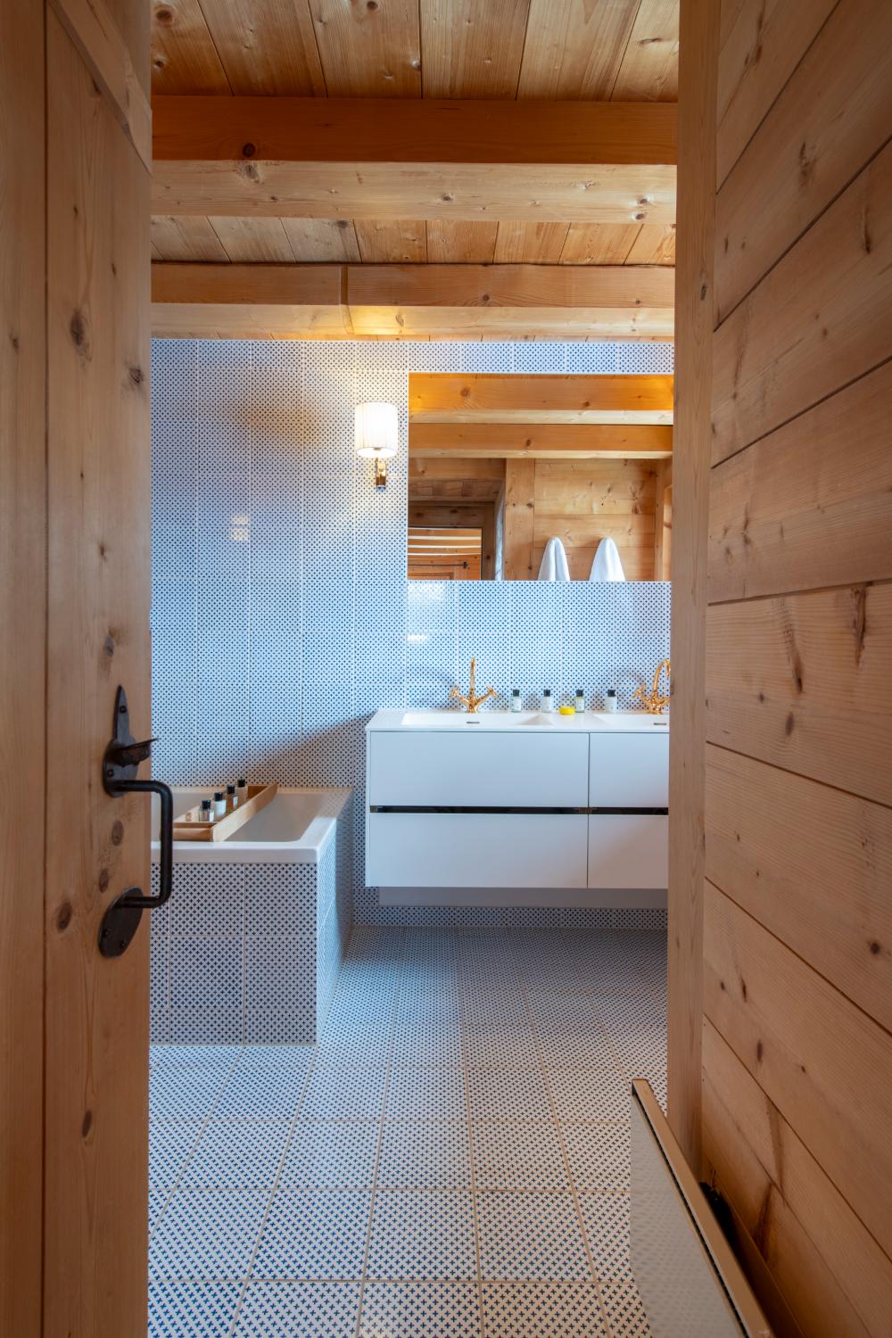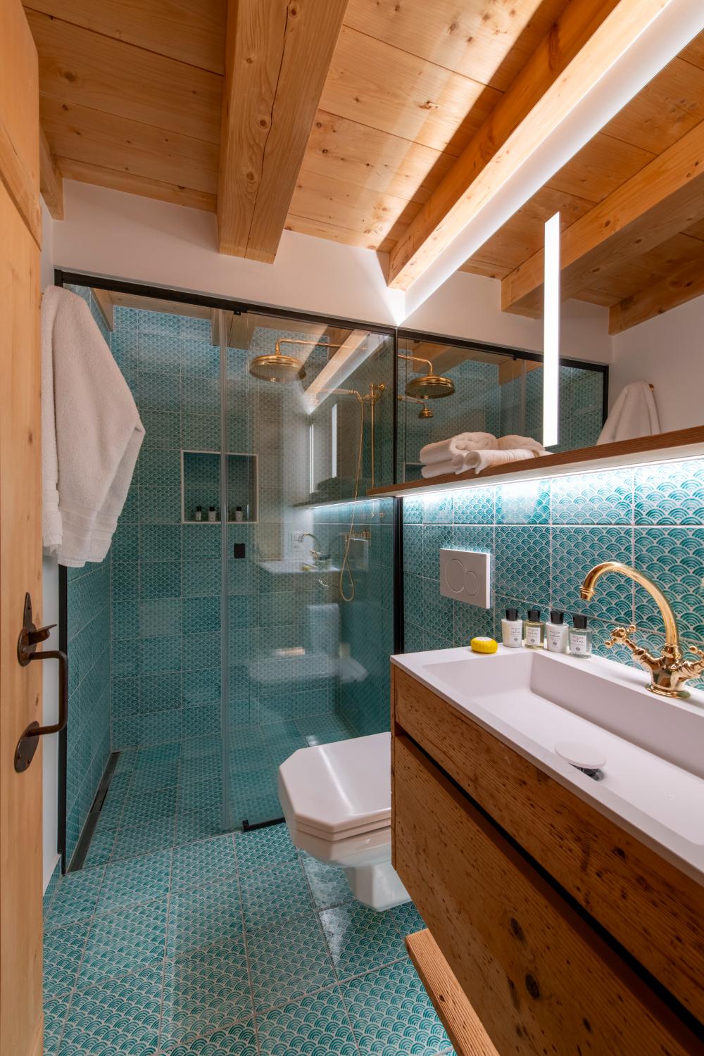Thoughtful finishes: mosaic-style bathroom tiles, gold fixtures, mix of rustic alpine and contemporary design elements.