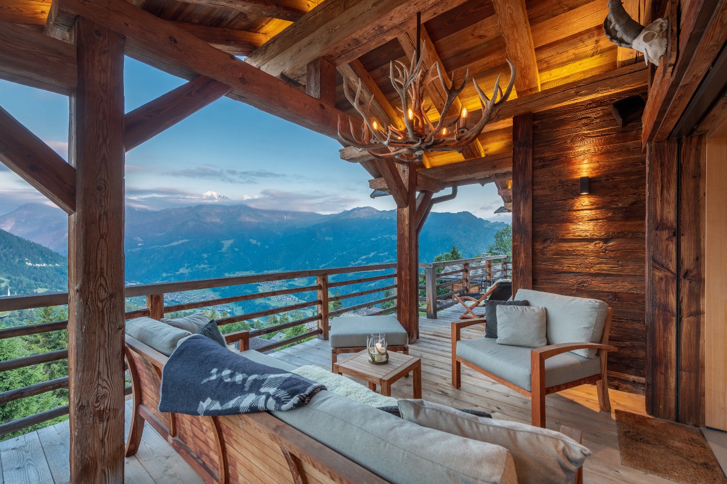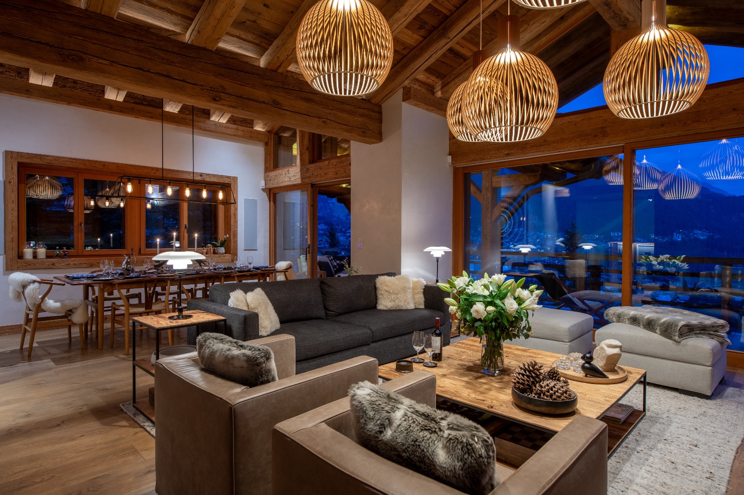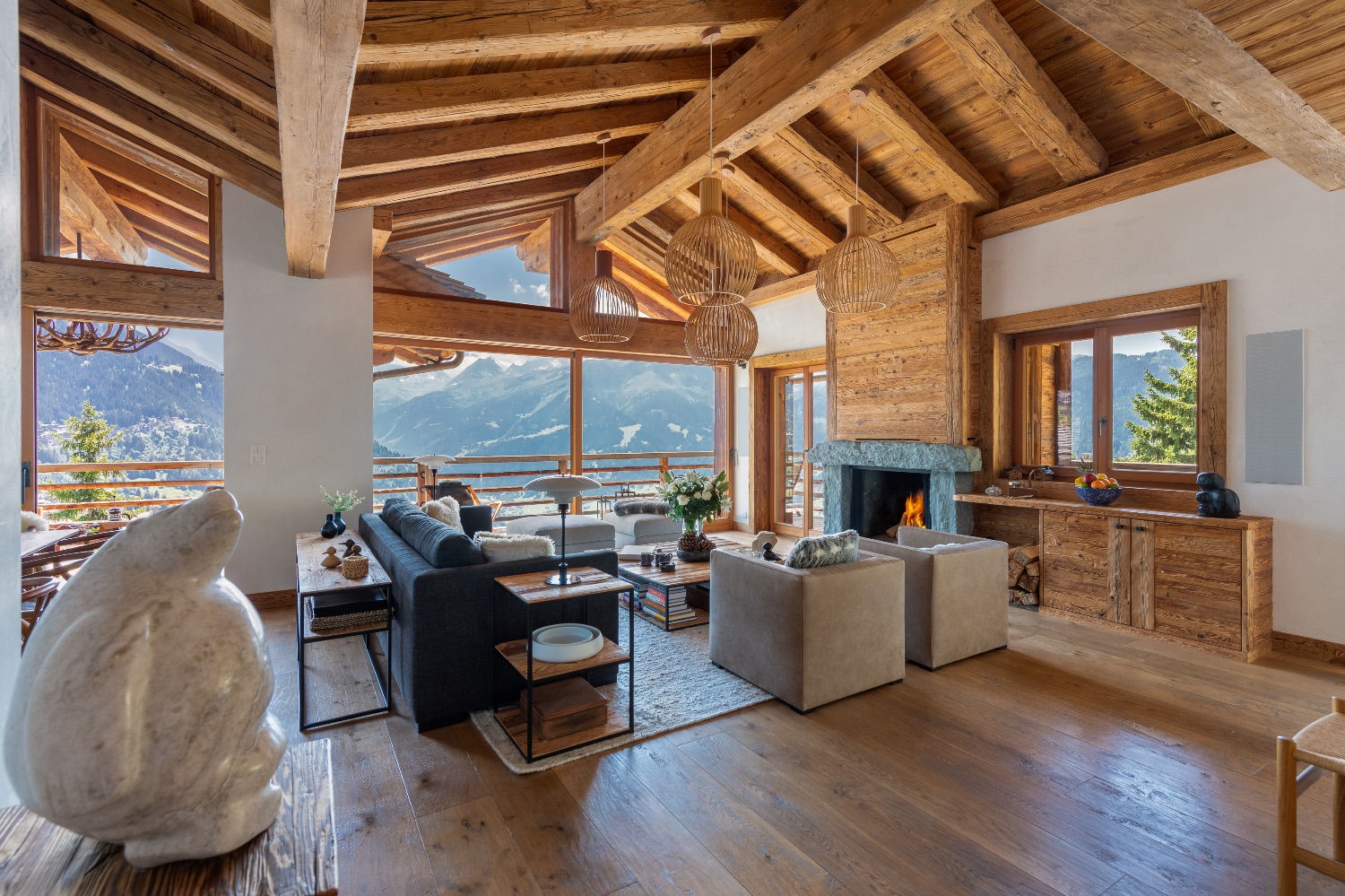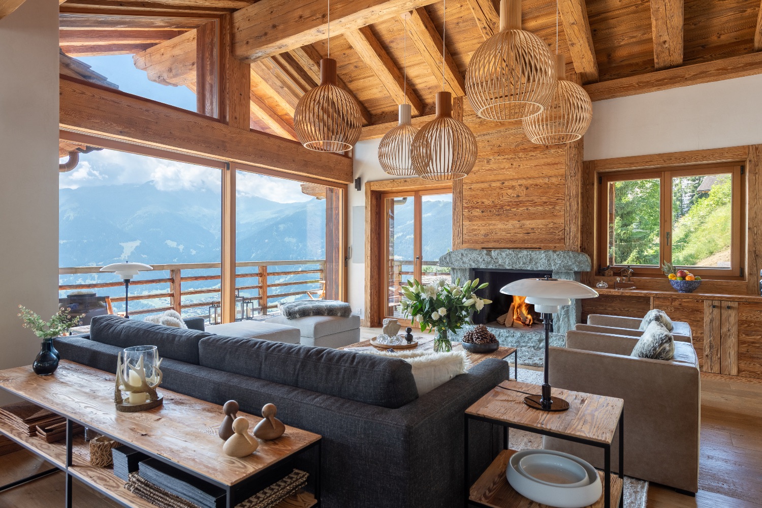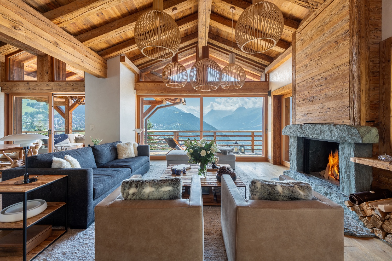 Built into the mountainside and facing south-east, the chalet enjoys uninterrupted views across the surrounding peaks. Expansive terraces and balconies create a seamless connection between interior warmth and alpine grandeur. One terrace features a spacious outdoor Jacuzzi — the perfect post-ski sanctuary for soaking under the stars with a glass of Champagne.