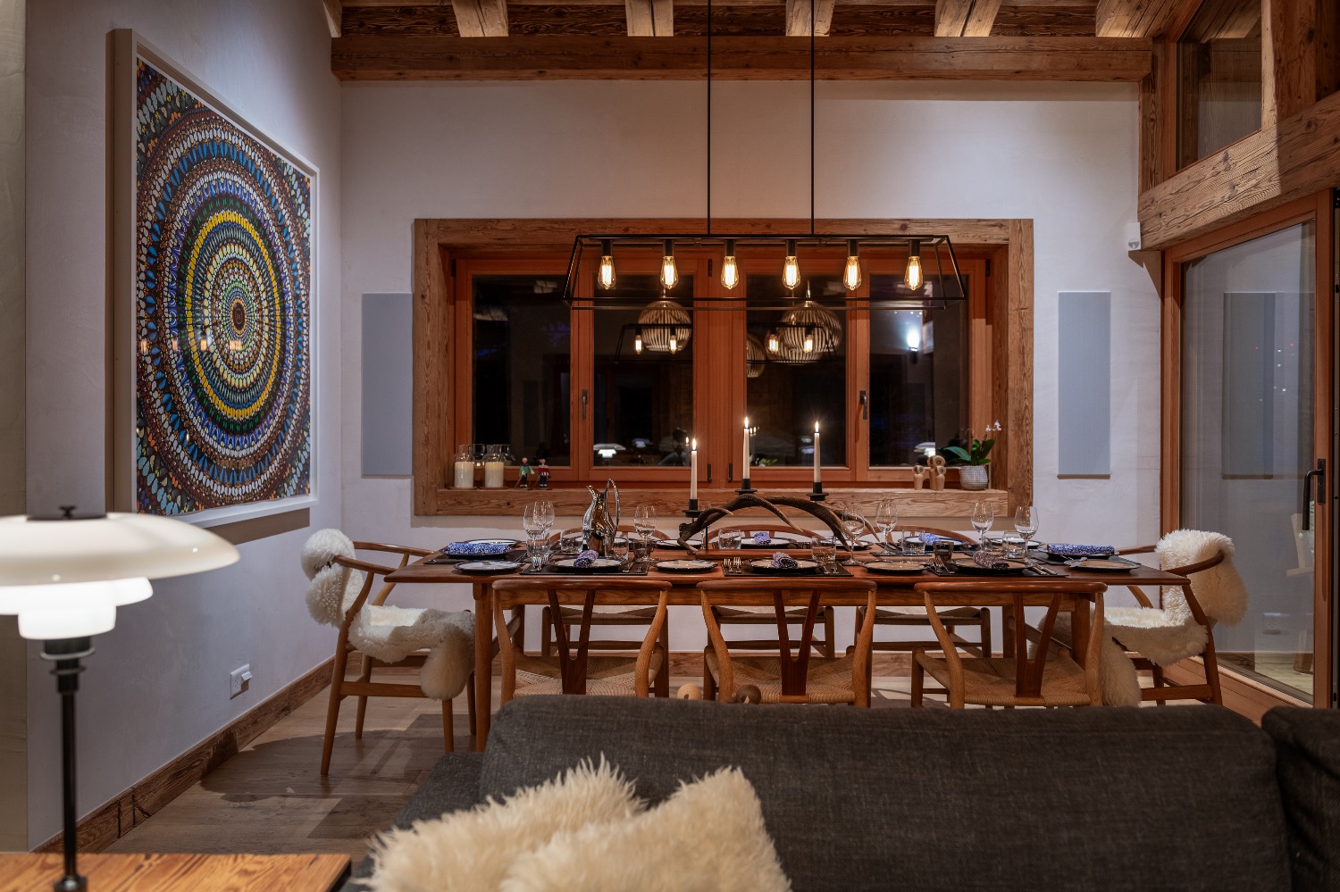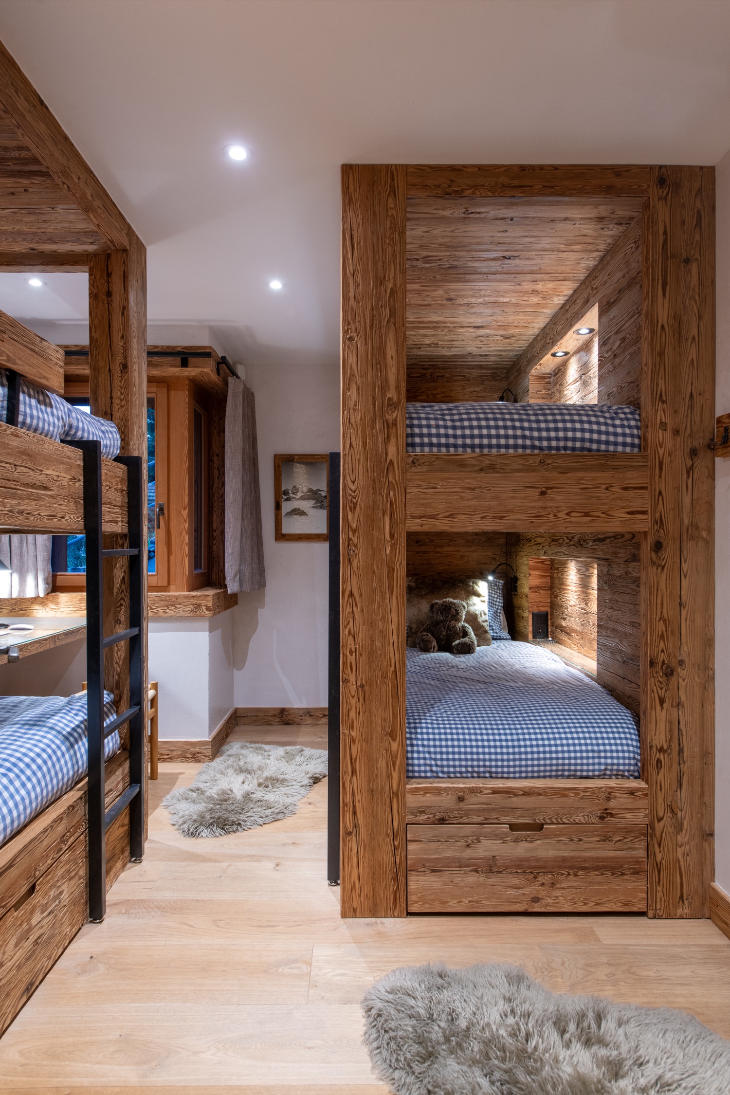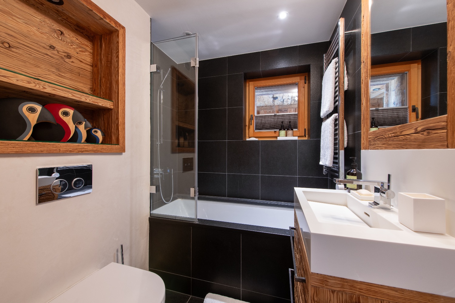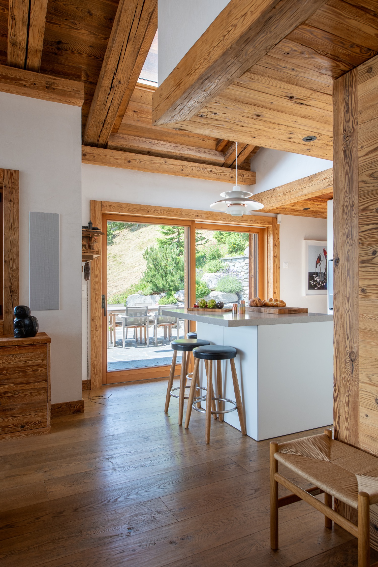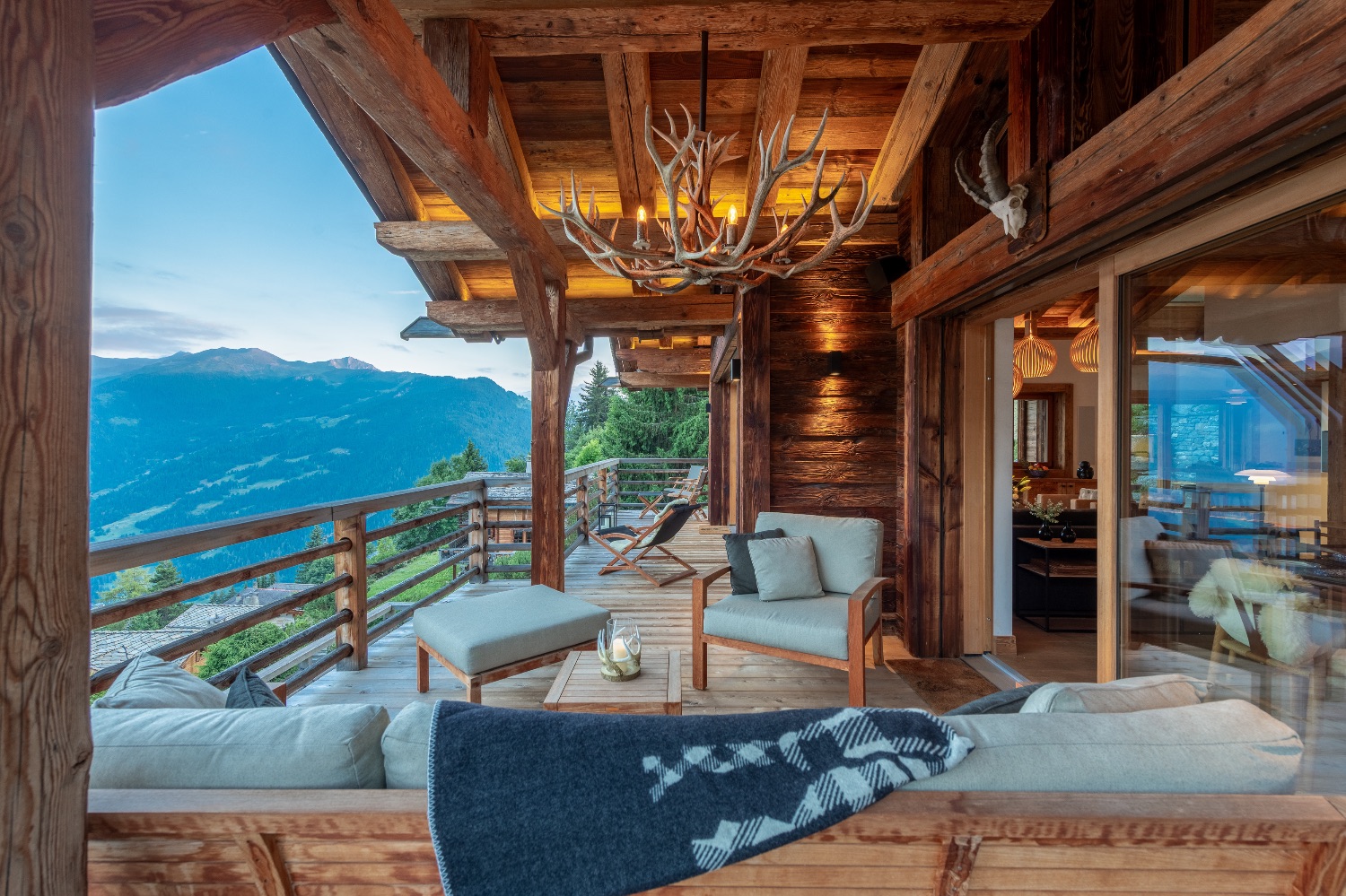 Built into the mountainside and facing south-east, the chalet enjoys uninterrupted views across the surrounding peaks. Expansive terraces and balconies create a seamless connection between interior warmth and alpine grandeur. One terrace features a spacious outdoor Jacuzzi — the perfect post-ski sanctuary for soaking under the stars with a glass of Champagne.