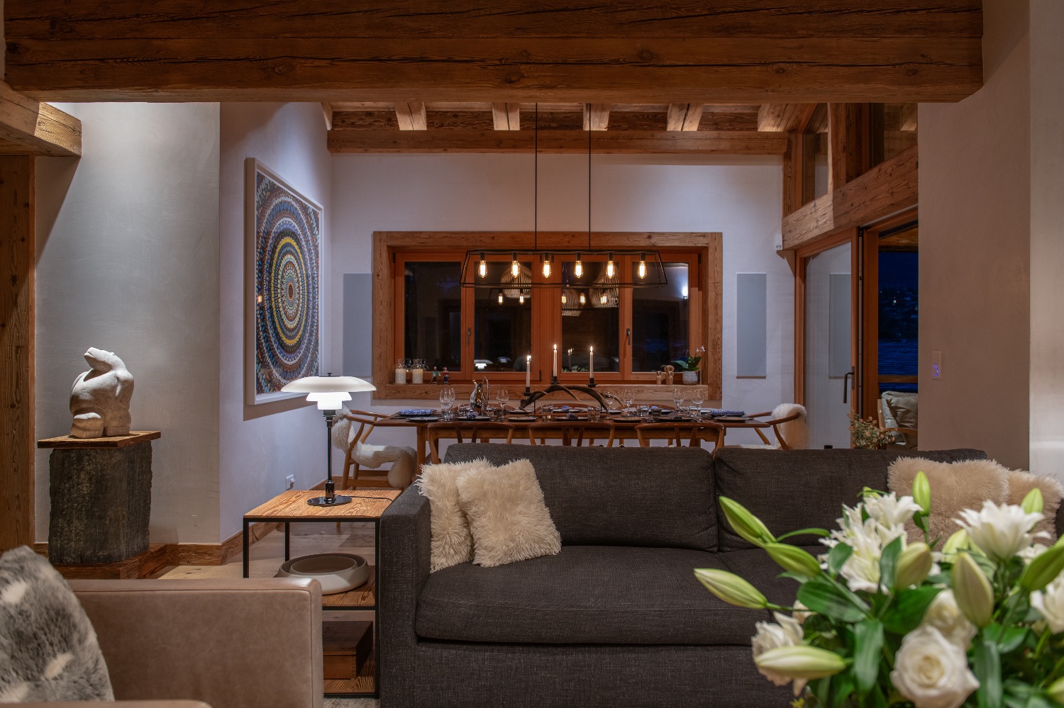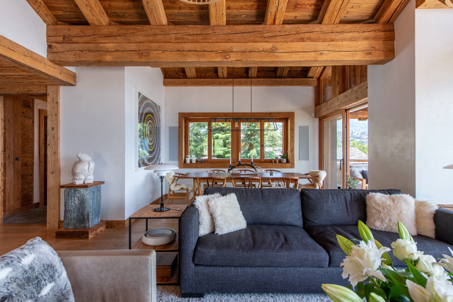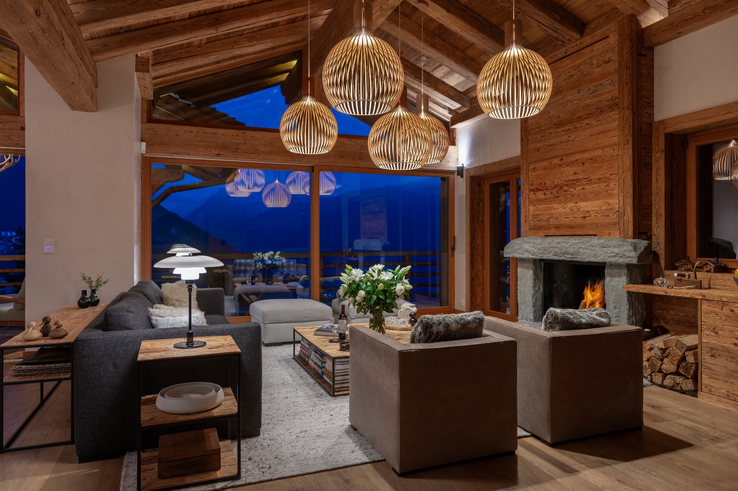 On the entrance level, an elegant open-plan living and dining area welcomes guests with understated sophistication. The heart of the space is a charming open fireplace framed by plush sofas and armchairs — an inviting setting for evenings after a day on the slopes.