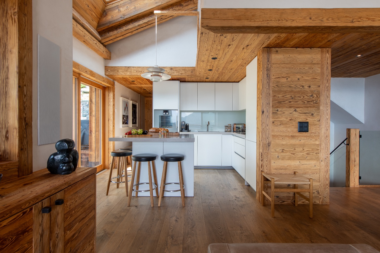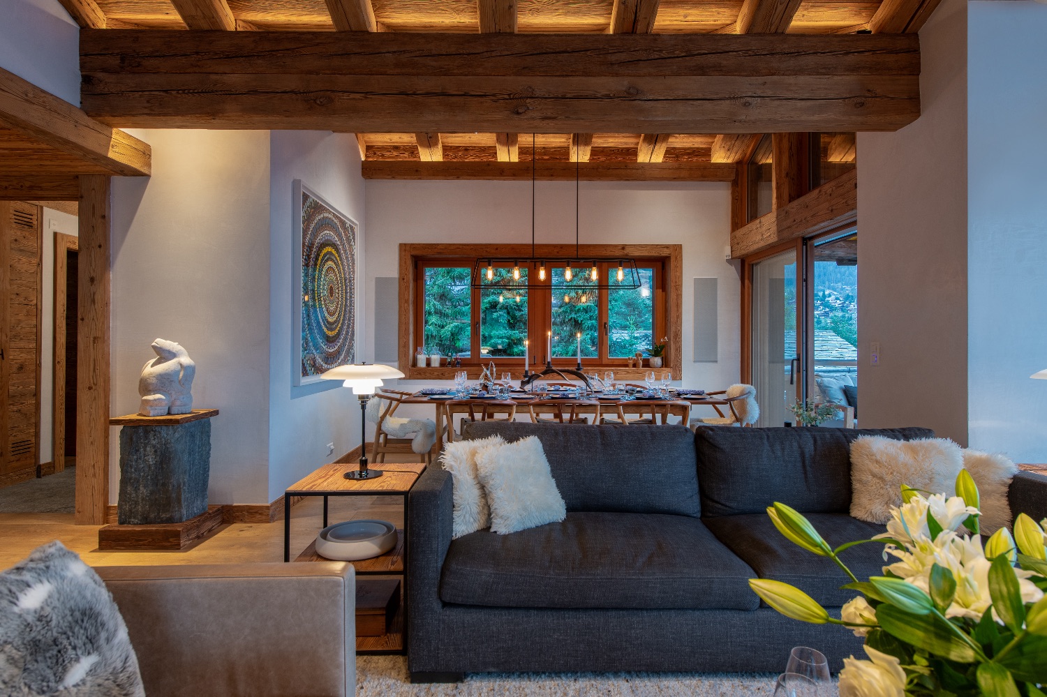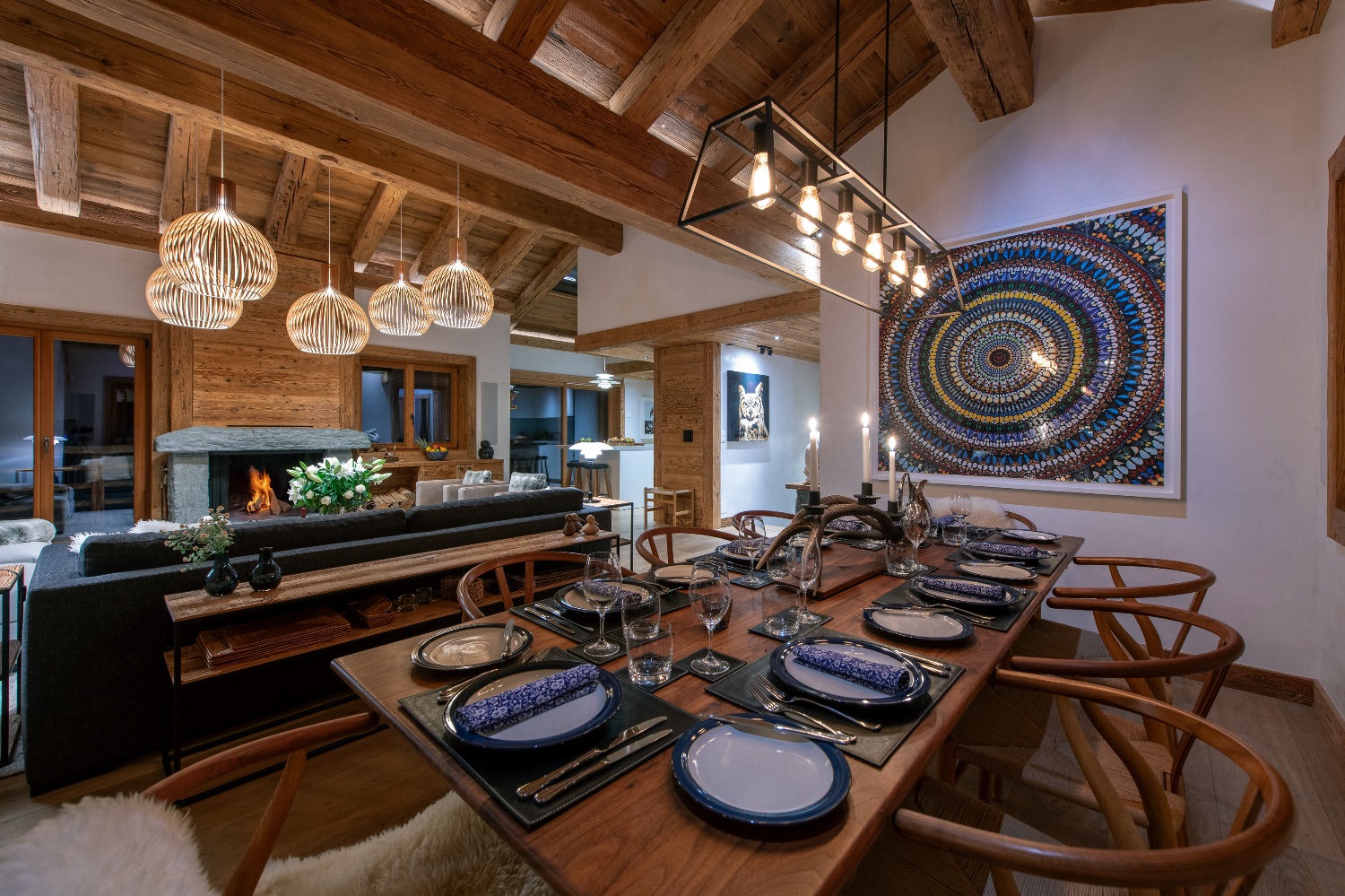 On the entrance level, an elegant open-plan living and dining area welcomes guests with understated sophistication. The heart of the space is a charming open fireplace framed by plush sofas and armchairs — an inviting setting for evenings after a day on the slopes.