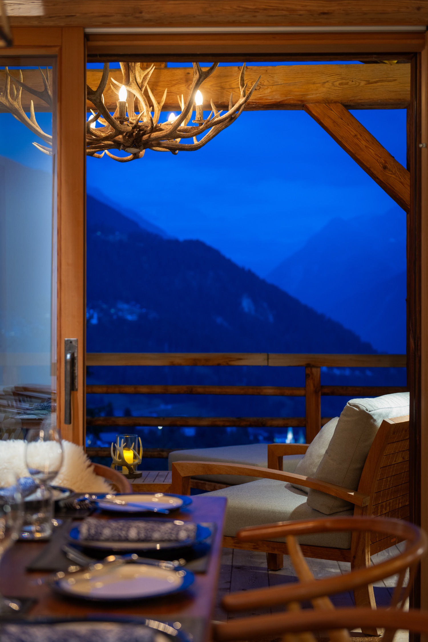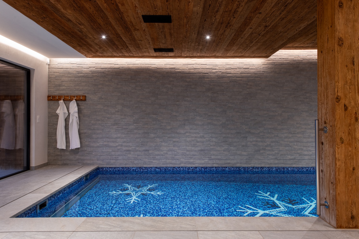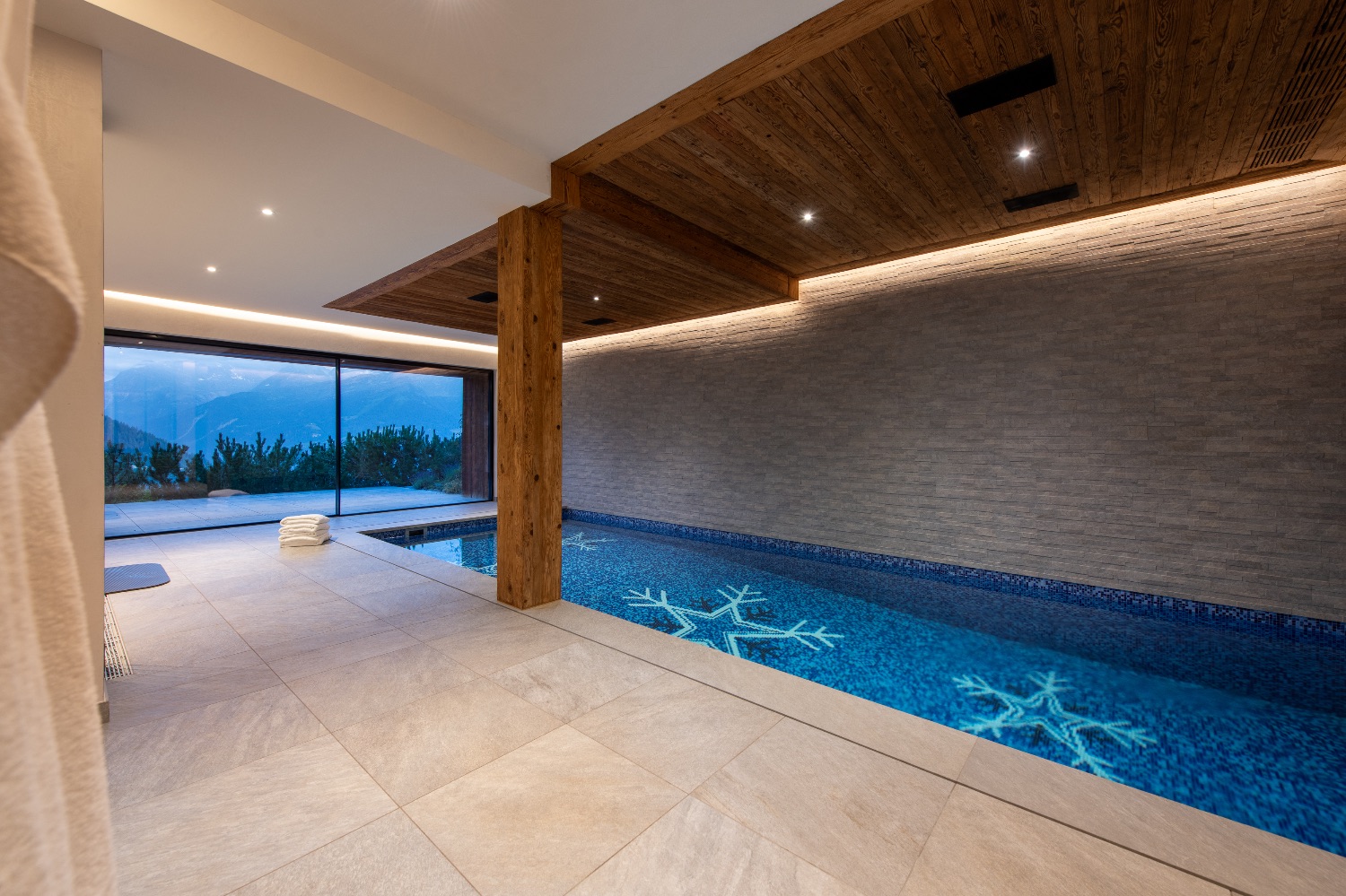 From the spa area, guests can step directly onto the terrace where the outdoor hot tub awaits — offering panoramic mountain views in total seclusion.