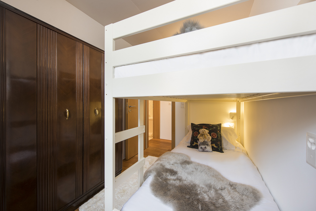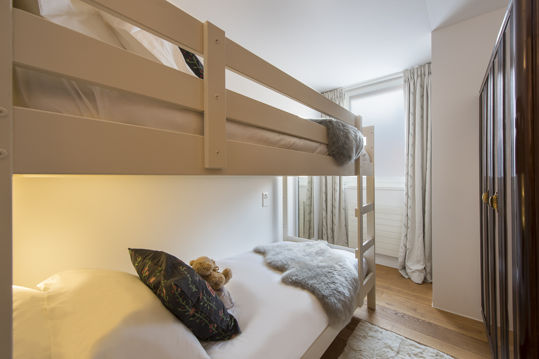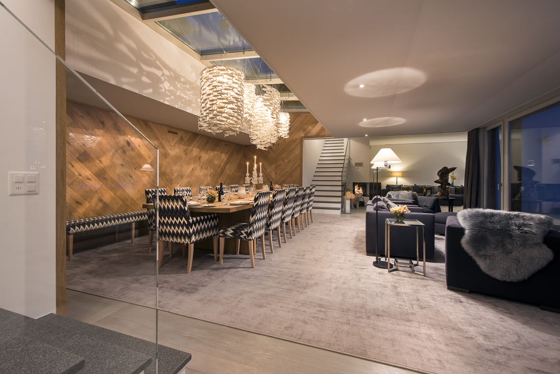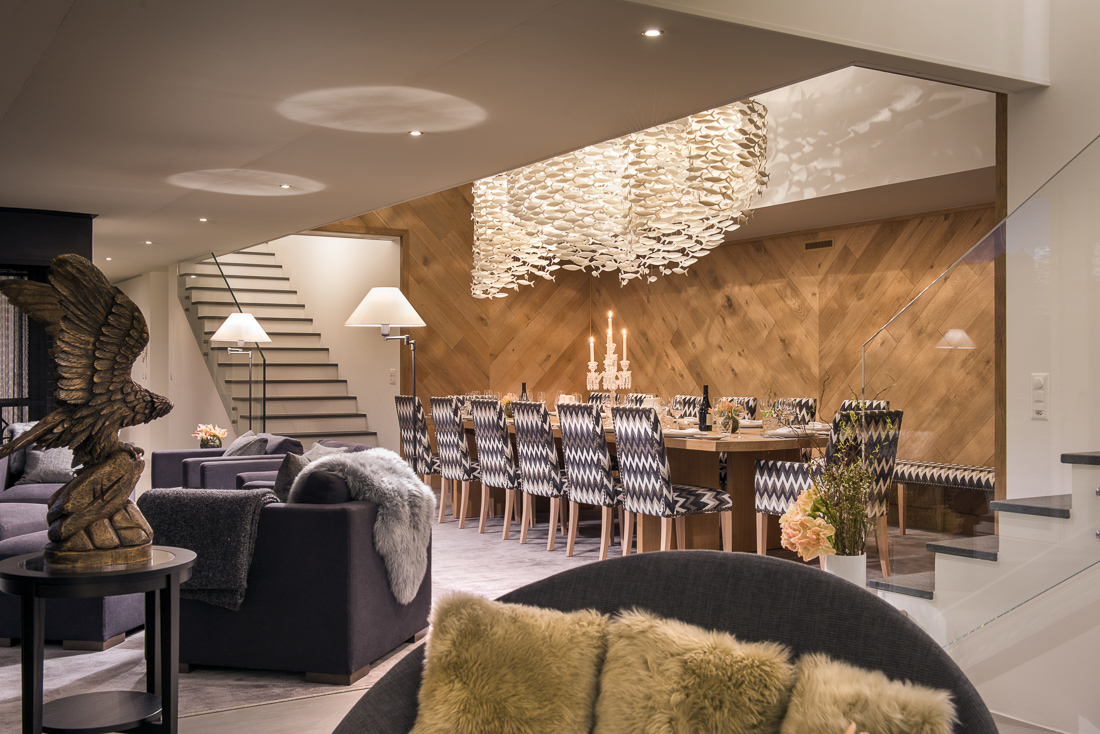 Set across three floors, the second chalet was completely renovated to the same exacting standards. It is located across the lawn and can also be accessed via the interior garage. The first floor there are the open-plan kitchen, living and dining area that lead out to the South-facing balcony. On the lower ground floor a new 3D cinema with luxury seating for eight next to the conference room where 10 guests can be accommodated as well as a massage area, and the large ski and boot room. The second chalet features three bedrooms. On the ground floor the master suite offers access to the terrace, two further suites feature en-suite shower rooms.