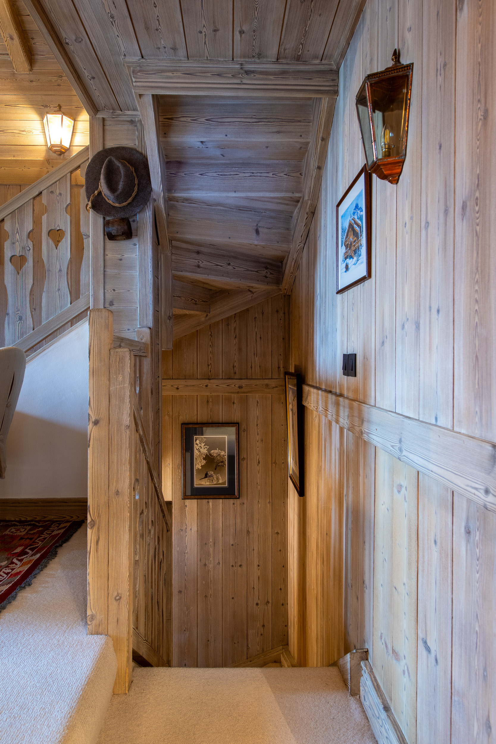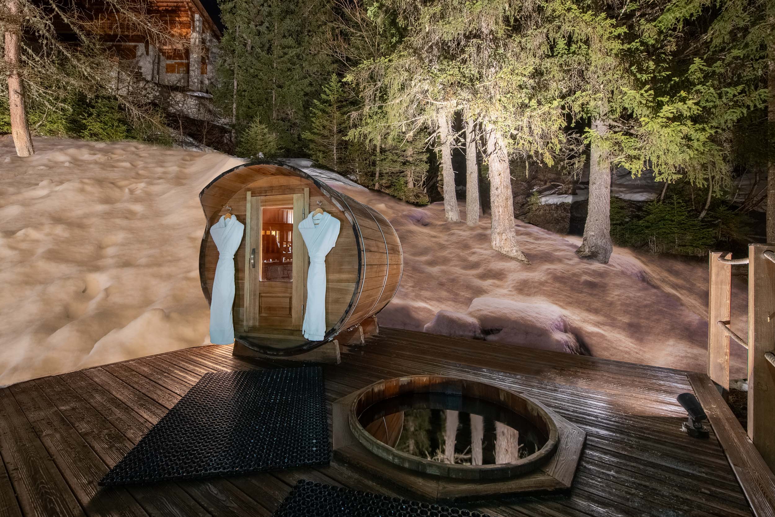 The spa soul of the chalet is revealed on the first floor. After a day on the slopes, a private wellness area spans the level and provides just the right amount of luxury. For a traditional hot-cold alpine ritual, you can schedule a massage in the peaceful treatment room, relax in the outdoor hot tub while snowflakes float around you, or alternate between the barrel sauna and the plunge pool on the terrace.
