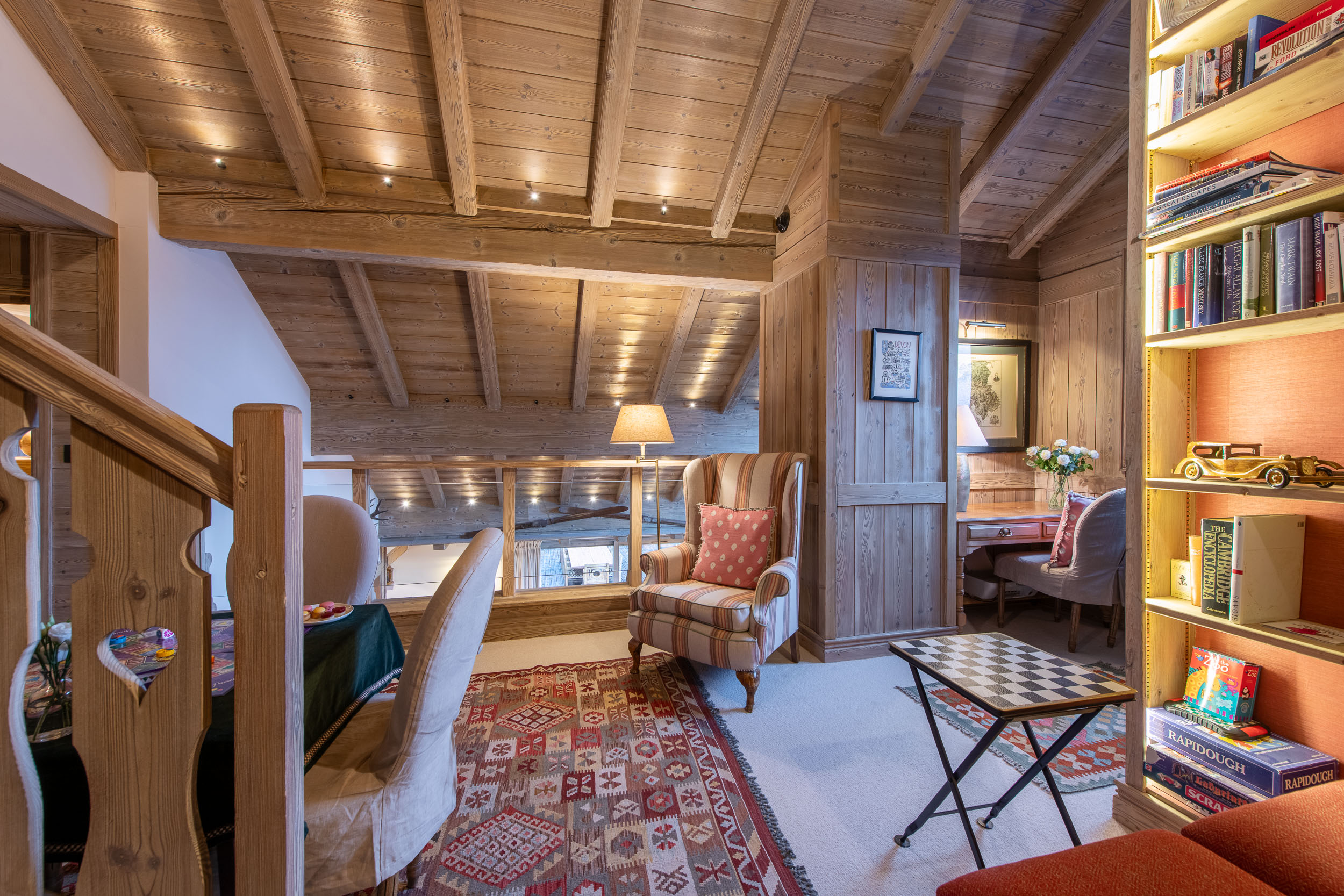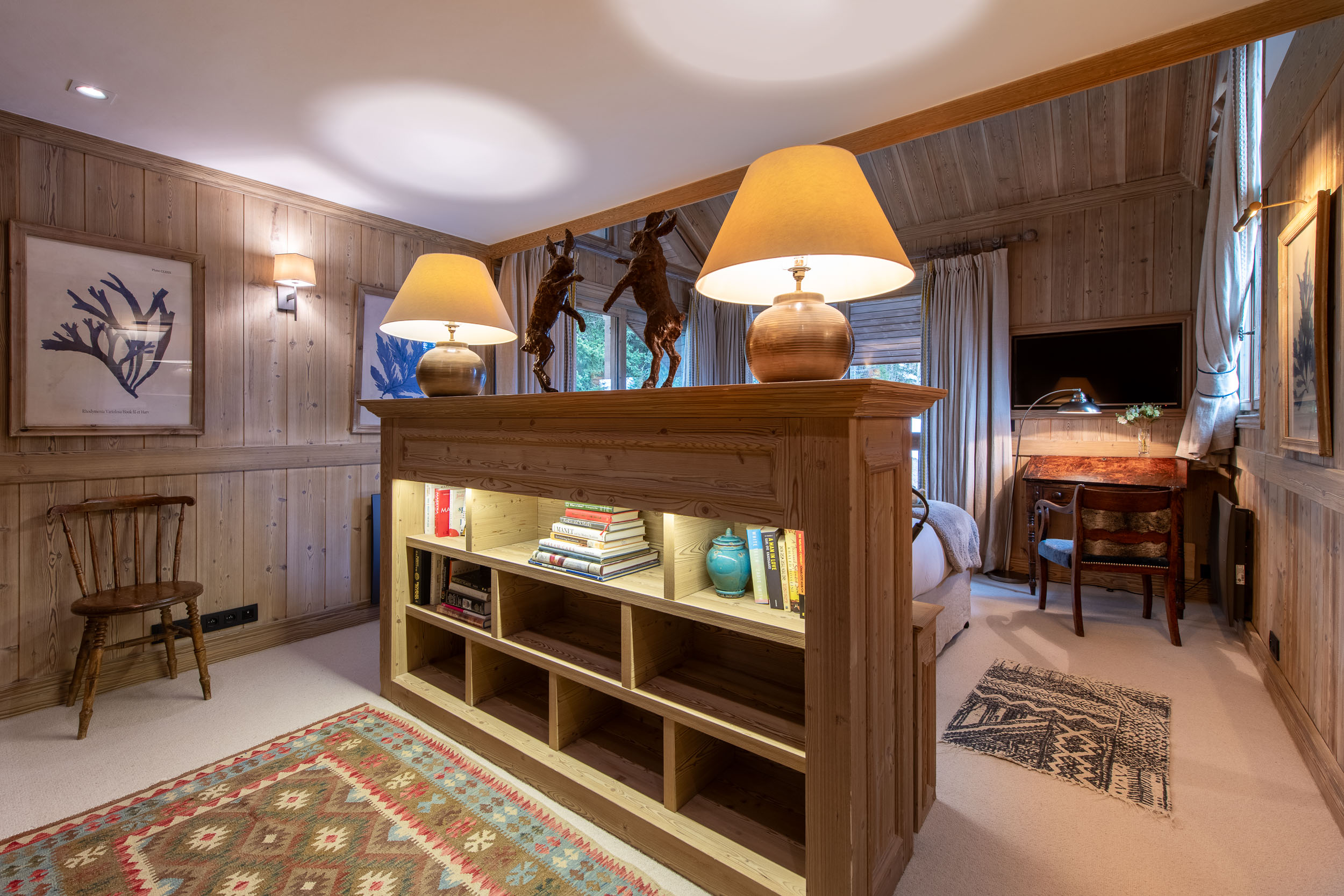 This level also includes the master bedroom, which has a large en suite bathroom, a private balcony, and peaceful early morning hours when you can go outside with coffee and check the weather before anyone else wakes up. A lovely spot for reading, playing board games, or just watching the fire from above is the library mezzanine, which has a view of the living area below.