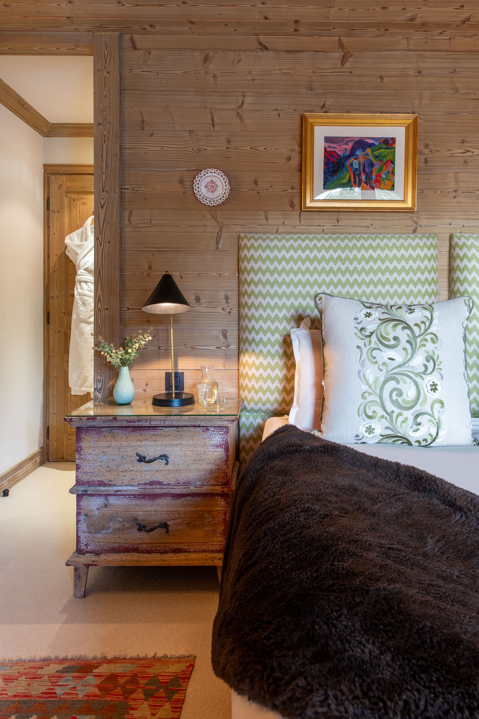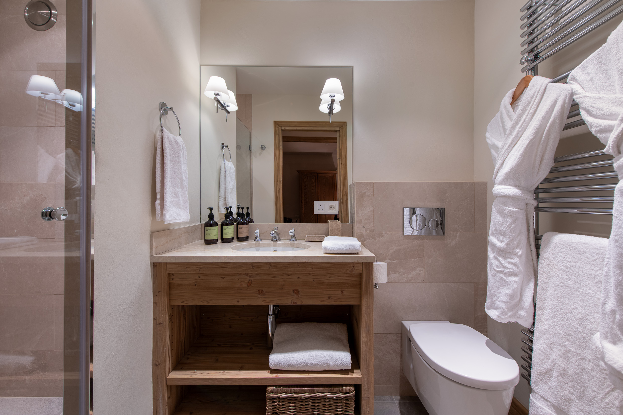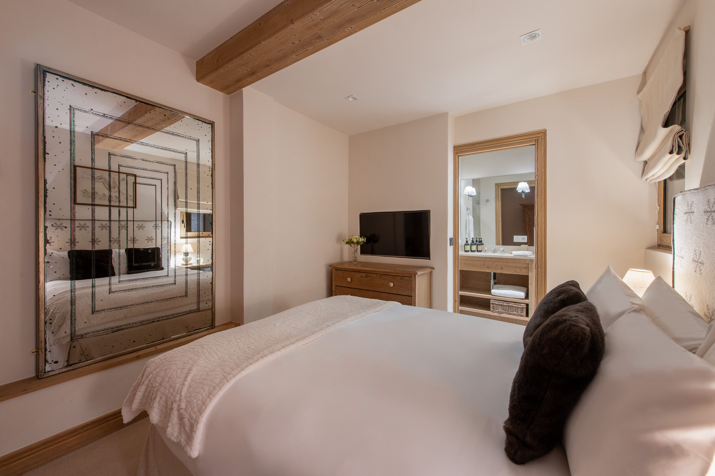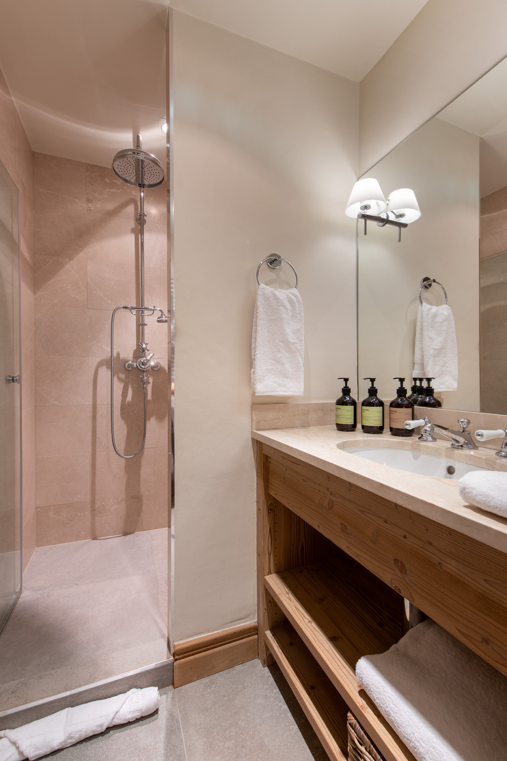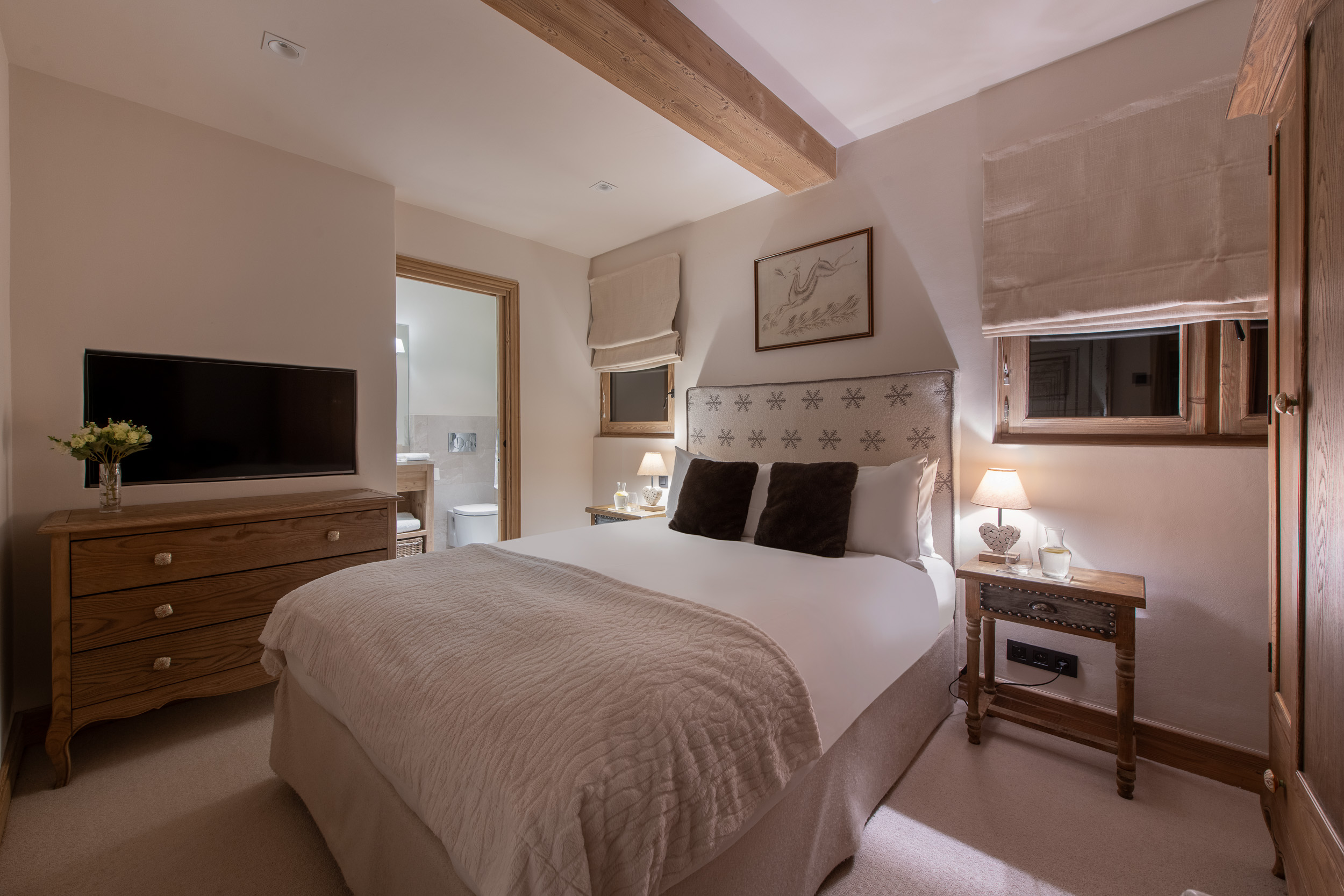 Enter through the glass doors and find yourself on a spacious terrace with a fire pit, perfect for hot chocolate after skiing, mulled wine and champagne as the sun sets behind the peaks in the spring, or toasted marshmallows with the kids. Your chef or host can work comfortably in the kitchen, which is slightly tucked away and just off the dining area, while mealtimes remain intimate and the focus is on the table rather than the preparation. This floor is finished with a lovely double bedroom with an en suite shower, perfect for visitors who prefer to be near the main living areas.