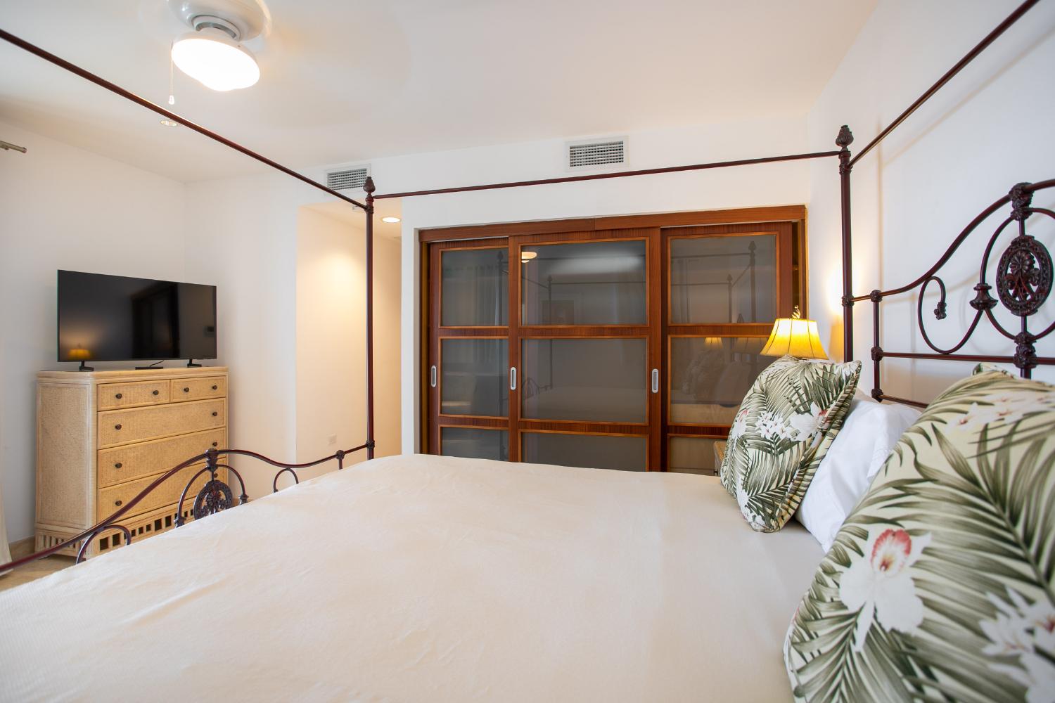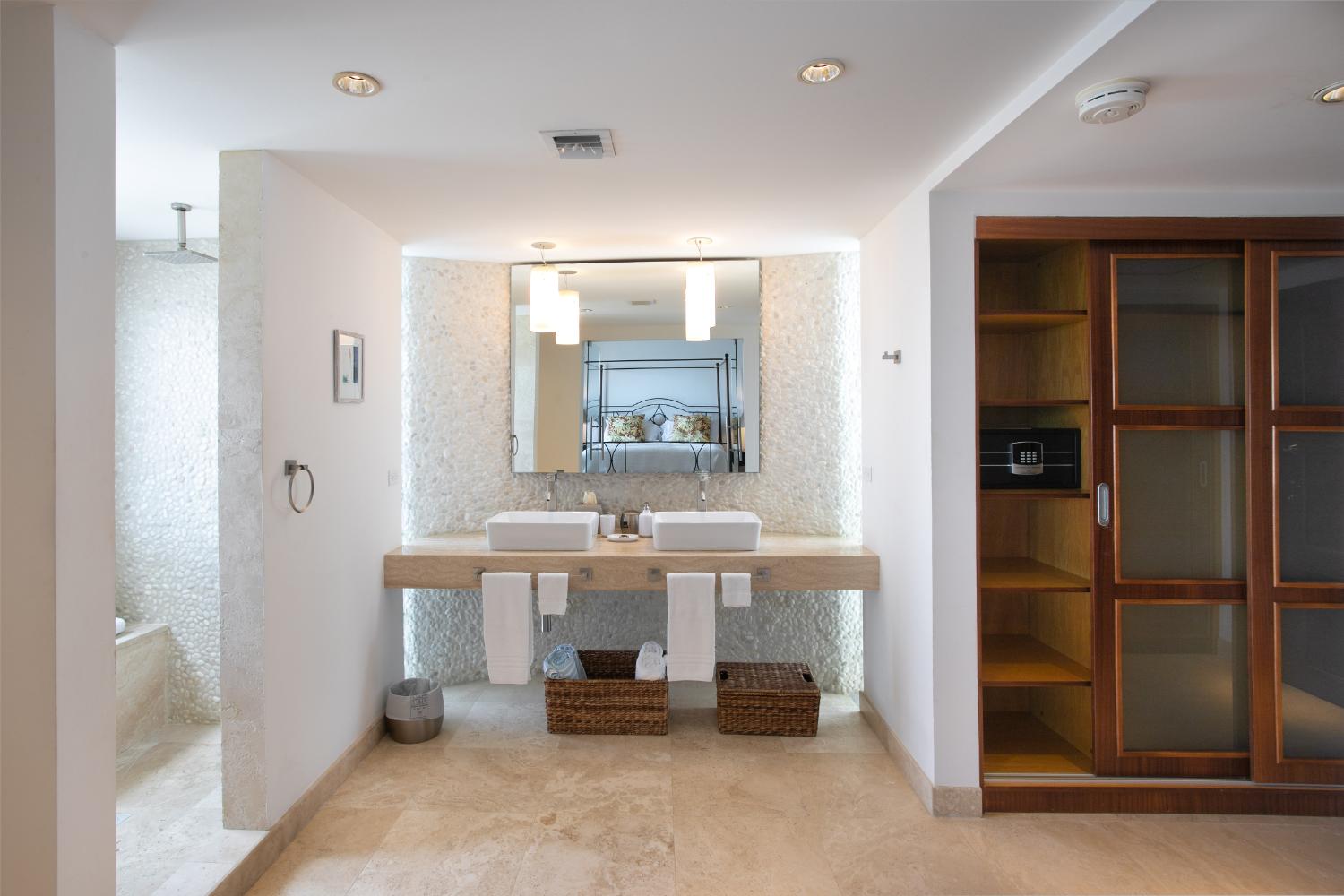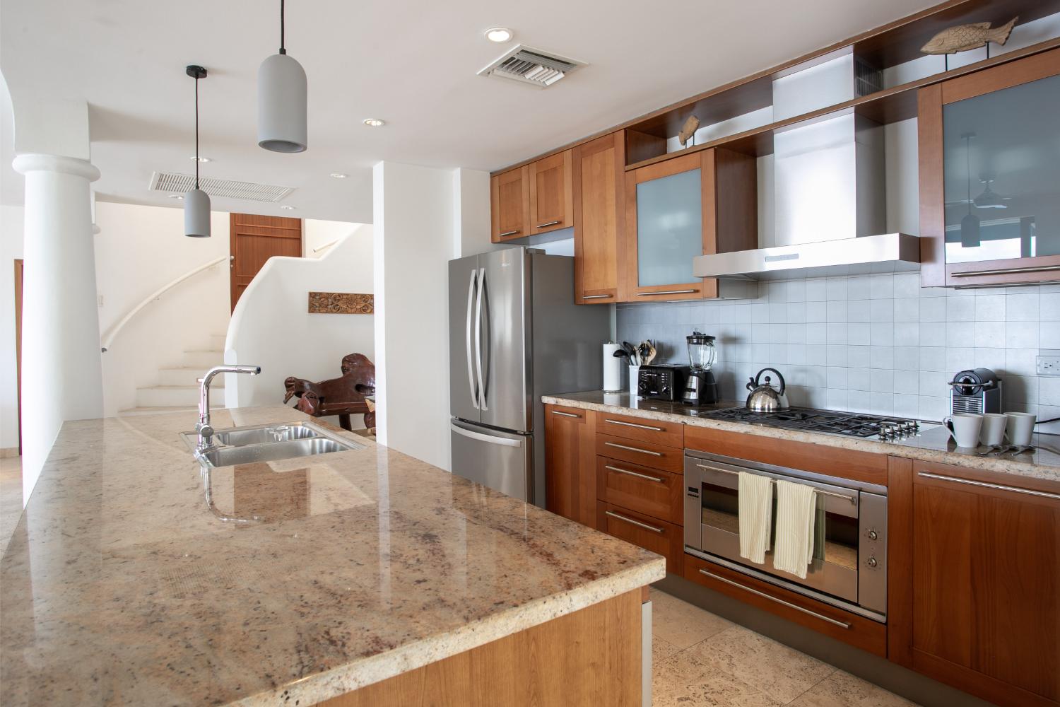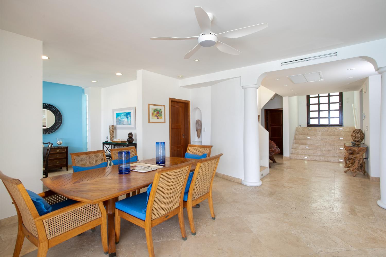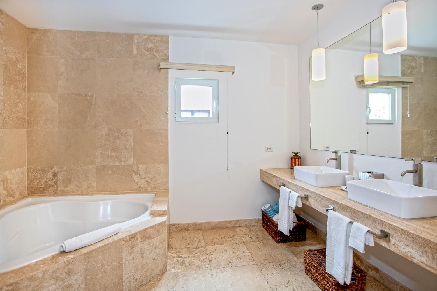 The interior décor blends tropical tones and patterns with teak woods accents; elegant and comfortable. Colorful local art adorns the walls throughout the villa. The open plan living area features a high-end kitchen with luxury appliances, beautiful woods and stainless steel. The indoor dining area is between the kitchen and the view. The large main living area combines lounging and media spaces with a powder room is conveniently located on the first floor.