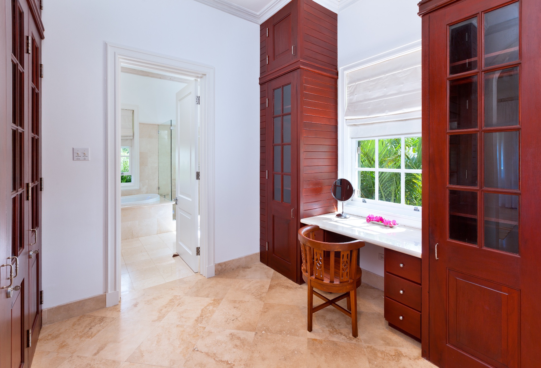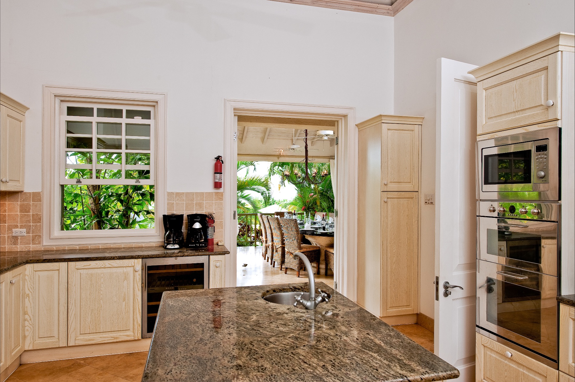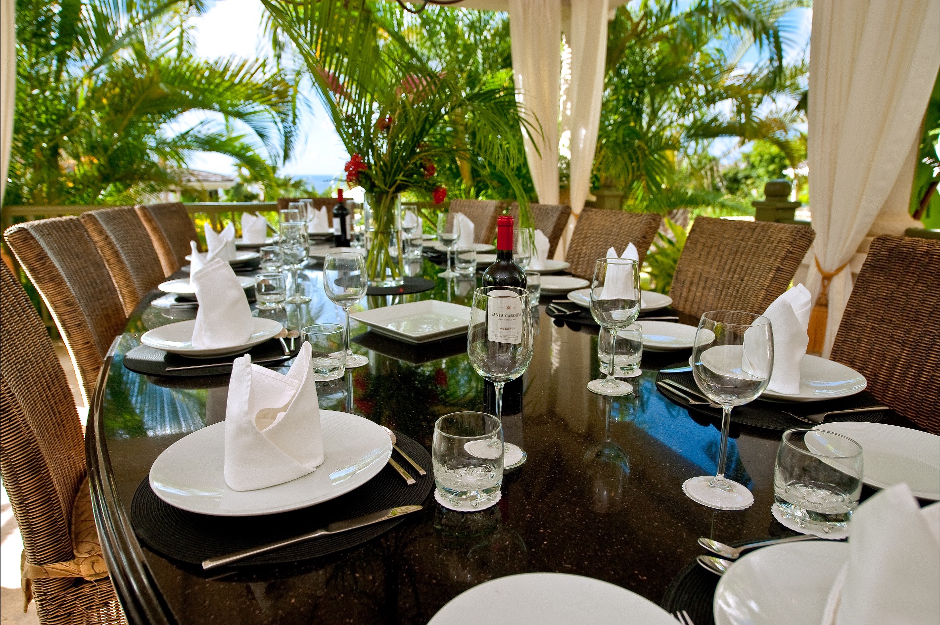 A few steps up to the verandah takes you to an al fresco dining spot and outdoor lounge. Just inside is the living room with grand piano, oversized sofas, high ceilings, and stunning décor. Nearby, an equally large media room features a television and entertainment system along with a computer workstation. Another large dining area at one end of the villa is adjacent to the modern, gourmet kitchen. A chef is available if desired or you can enjoy full use of this impressive space for making meals and beverages.