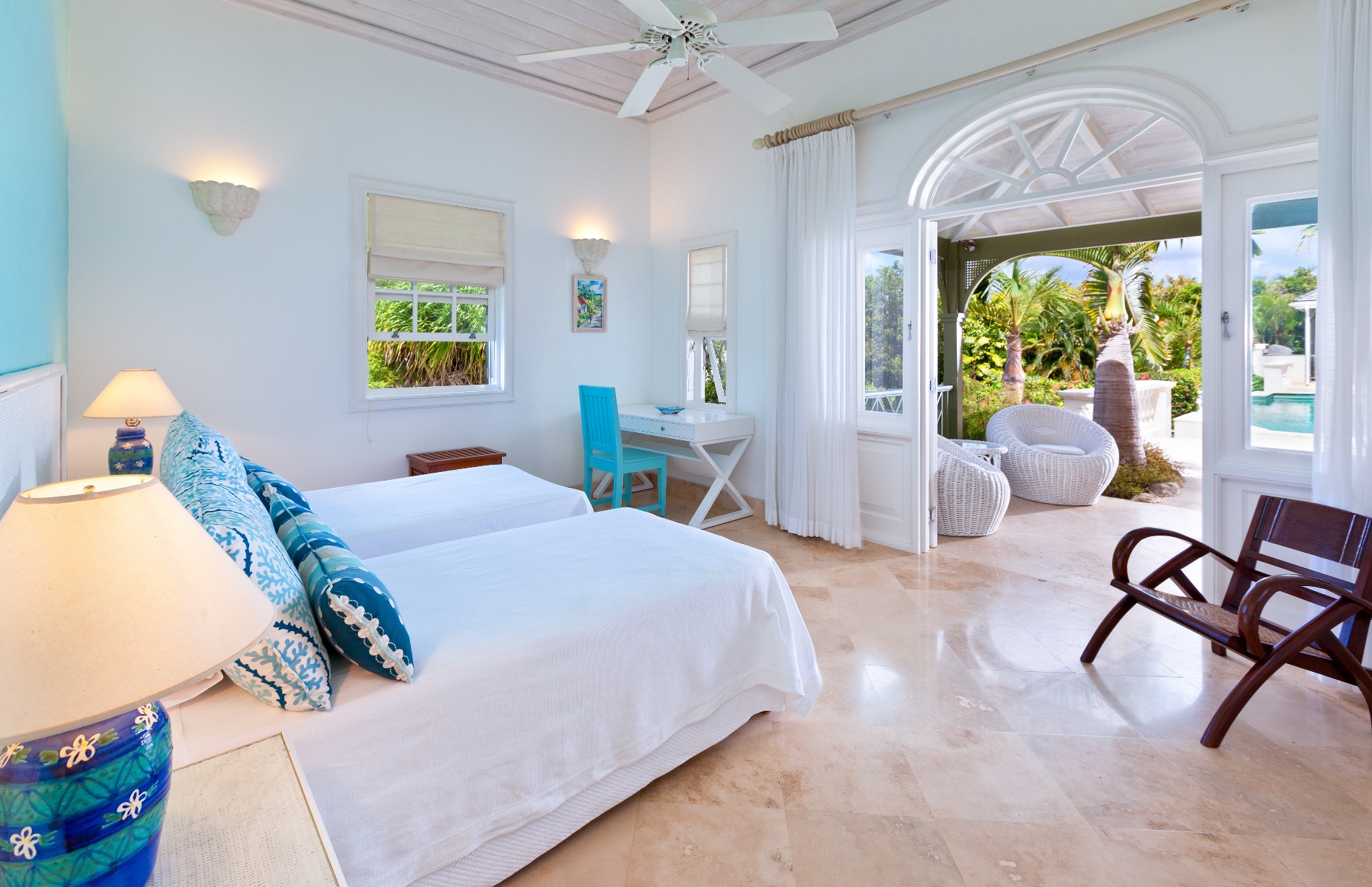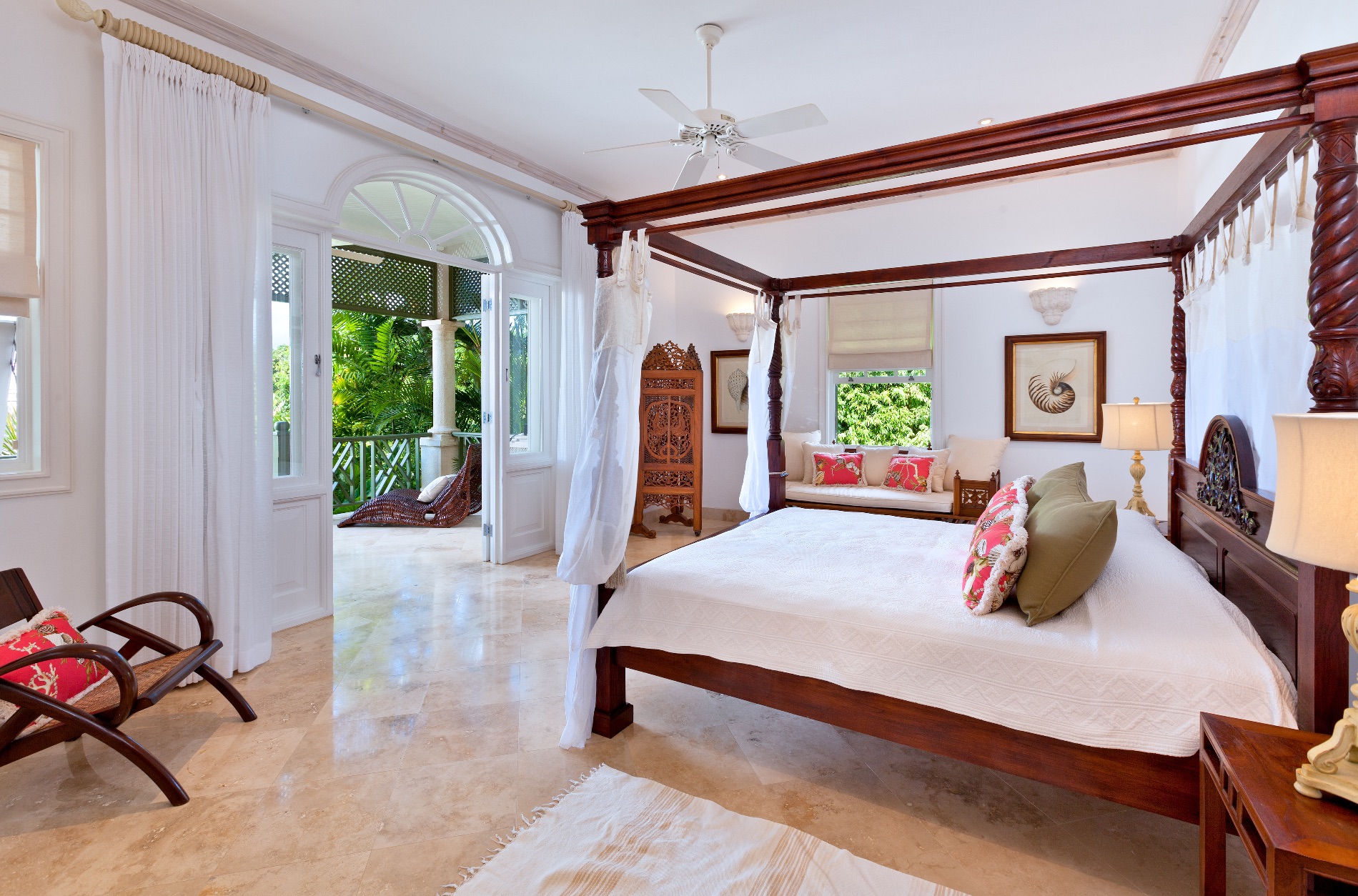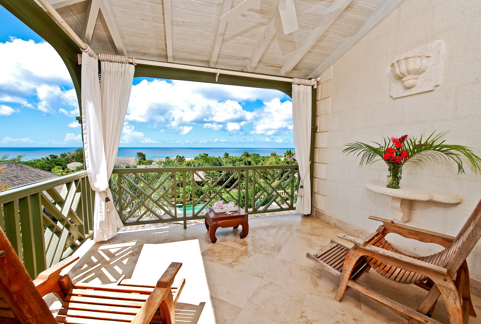 The six bedrooms are spread between the main building and a separate cottage near the pool. There are two master suites with balconies and kitchenettes, and two other king suites in the main building. All have en suite bathrooms. The remaining bedrooms are king suites with private baths.