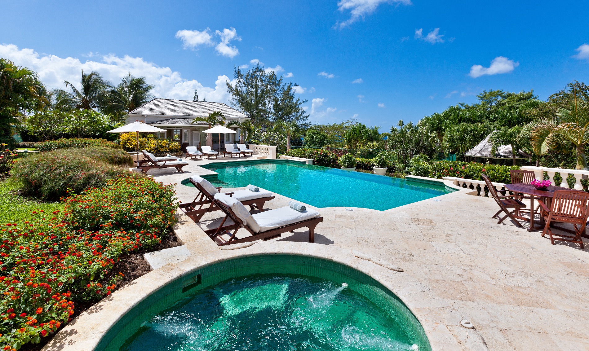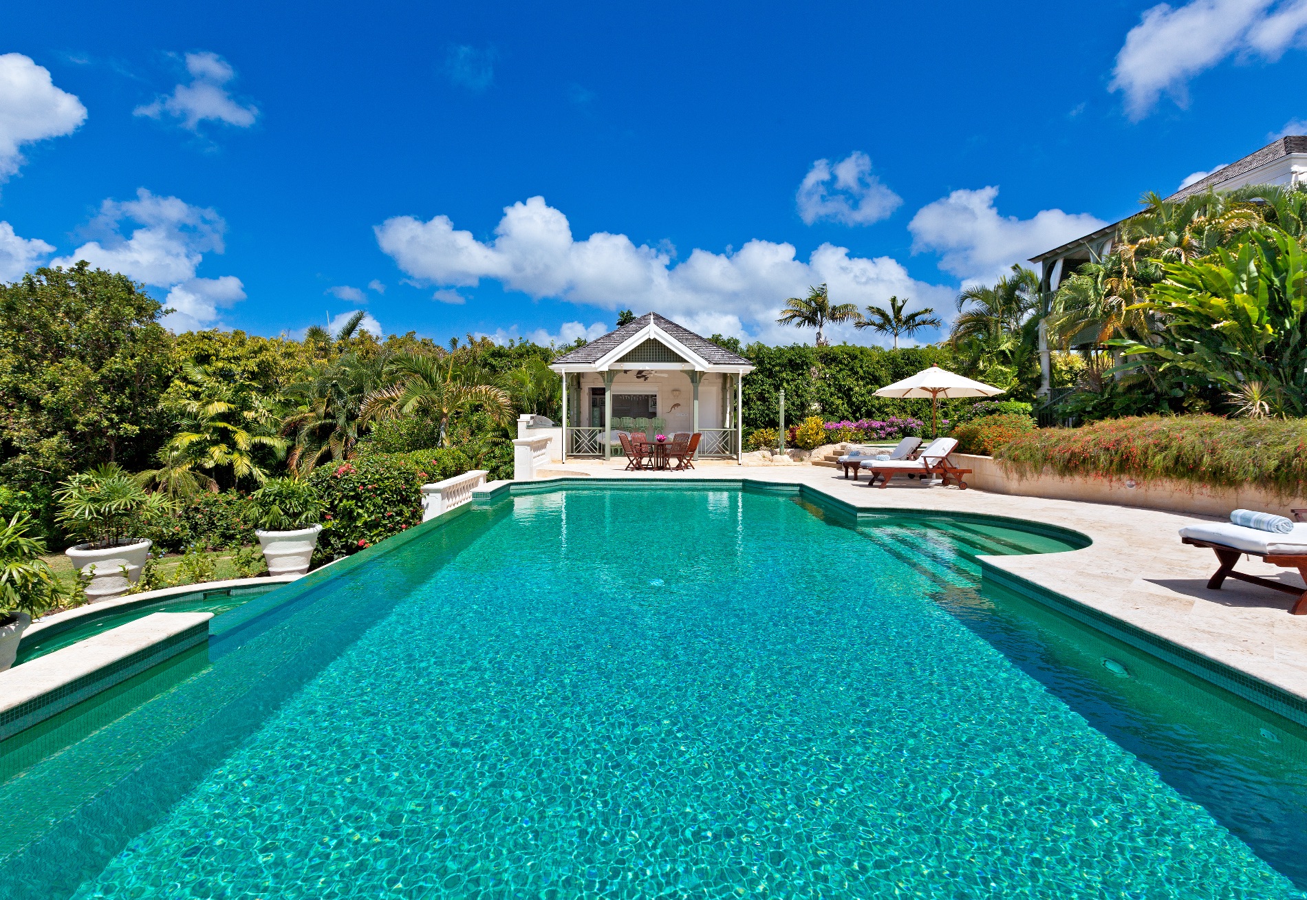 With 1.5 acres of private gardens and grounds, the villa is secluded while remaining entirely convenient to the pleasures found along the West Coast of Barbados. Designed with grandeur as its overall theme, the two-story property is expansive while remaining welcoming and comfortable. With a beautiful blend of indoor and outdoor living spaces, it features a large and private swimming pool and whirlpool** area framed by a stone terrace and large palms. A pool house at one end, and several sun beds and lounging areas makes this spot one to which you will all head each day. **Please note that the whirlpool is not heated, it is a plunge pool with water jets.