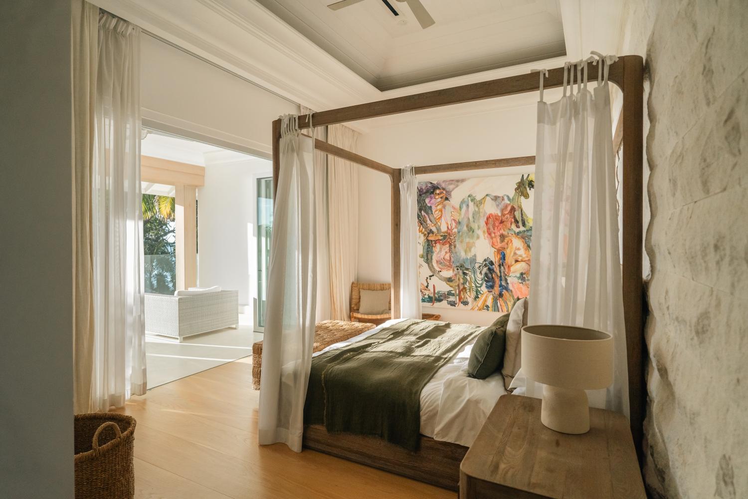 A double staircase with a feature Verpan seashell chandelier leads upstairs to five spacious en-suite bedrooms. A few have four-poster beds dressed with white linen, and all have American oak flooring, Ralph Lauren bed stools, and a smattering of other unique design pieces. Each bedroom has a walk-in dressing room, private terrace, and luxury bathroom furnished with Hansgrohe rain shower, mosaic tiles from Ann Sacks, and marble vanities. The master suite’s large bathtub sits at the base of a floor-to-ceiling window offering sweeping garden views down to the beach.