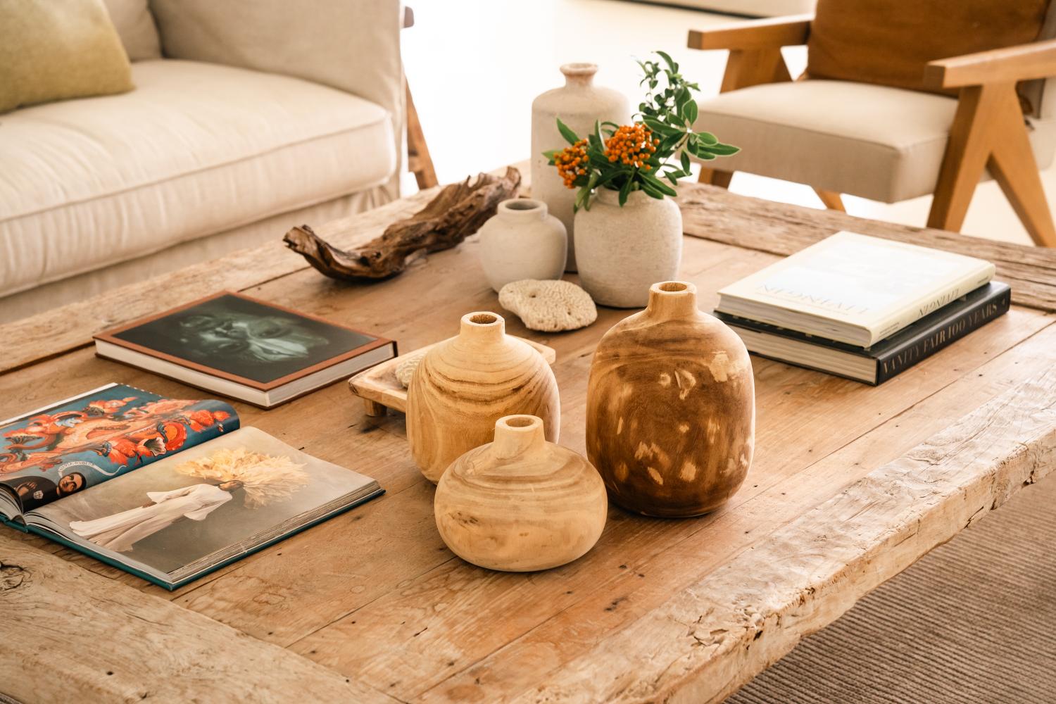 The main entrance with Holly Hunt consoles leads to the living area, which is open plan and spacious with neutral tones, pale limestone flooring, and an impressive local coral feature wall. Large windows make the most of the surrounding sea and pool views. The living and dining areas are furnished with designer pieces from the likes of Maxalto, Christian Liaigre, and Ralph Lauren, as well as a pair of B&B Italia sofas.