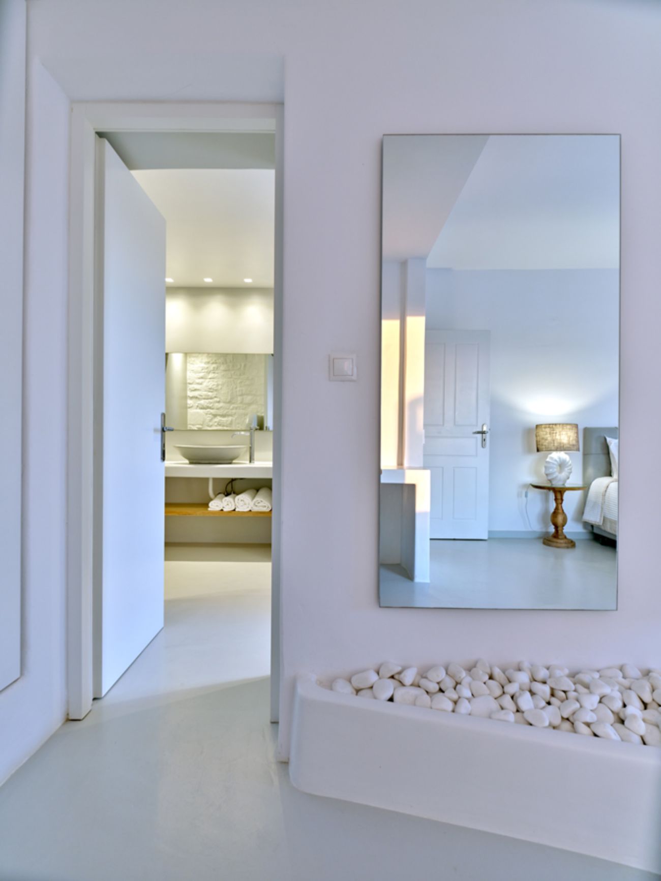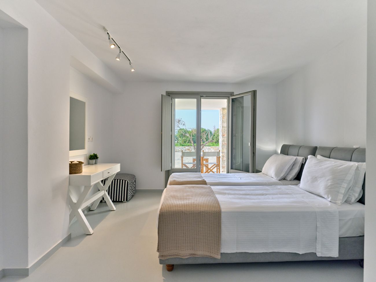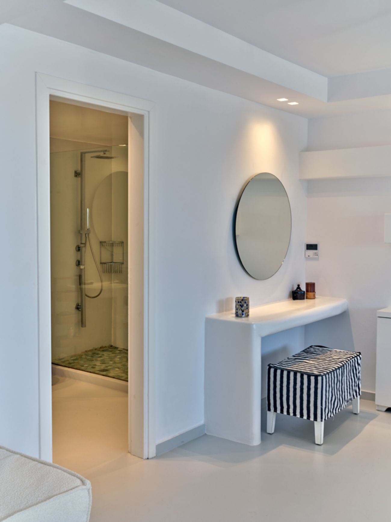 Ground Level 2 houses two additional master bedrooms, each with their own en-suite bathrooms, decorated in a clean, minimal Cycladic style and opening onto terraces with sea views and lush gardens.