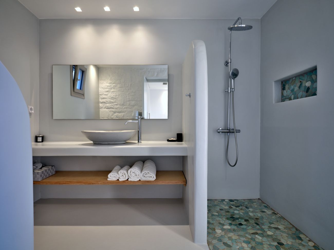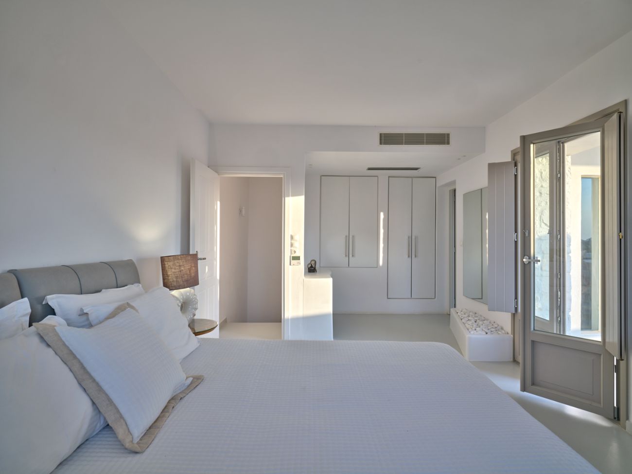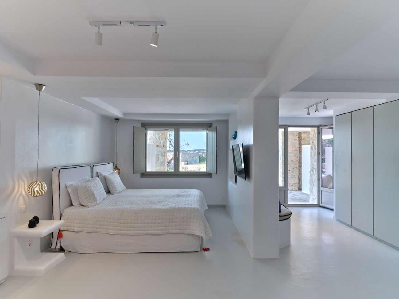 The Upper Level is home to a beautifully appointed master suite, complete with a walk-in rain shower, elegant finishes, and a spacious private terrace where guests can soak in the serenity of the island and watch the sun dip into the Aegean.