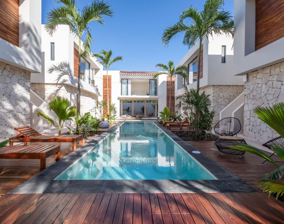 Natural materials, open sightlines, and an abundance of greenery create a sense of ease and tranquility in the architecture, which is purposefully modern but deeply anchored in Tulum‘s spirit. The U-shape arranges daily activities around a lengthy social axis, giving the impression that the house is a private compound—a series of indoor and outdoor spaces that promote social interaction without compromising privacy. The property has a laid-back, elegant personality thanks to warm finishes and well-considered lighting—luxury that feels lived-in rather than museum-quiet.