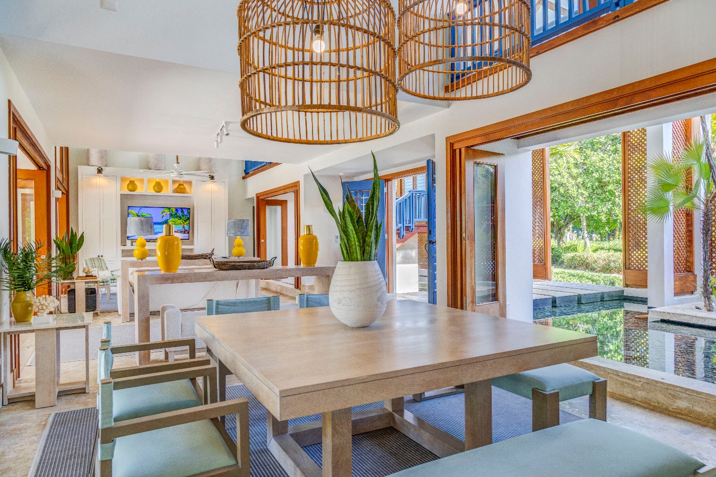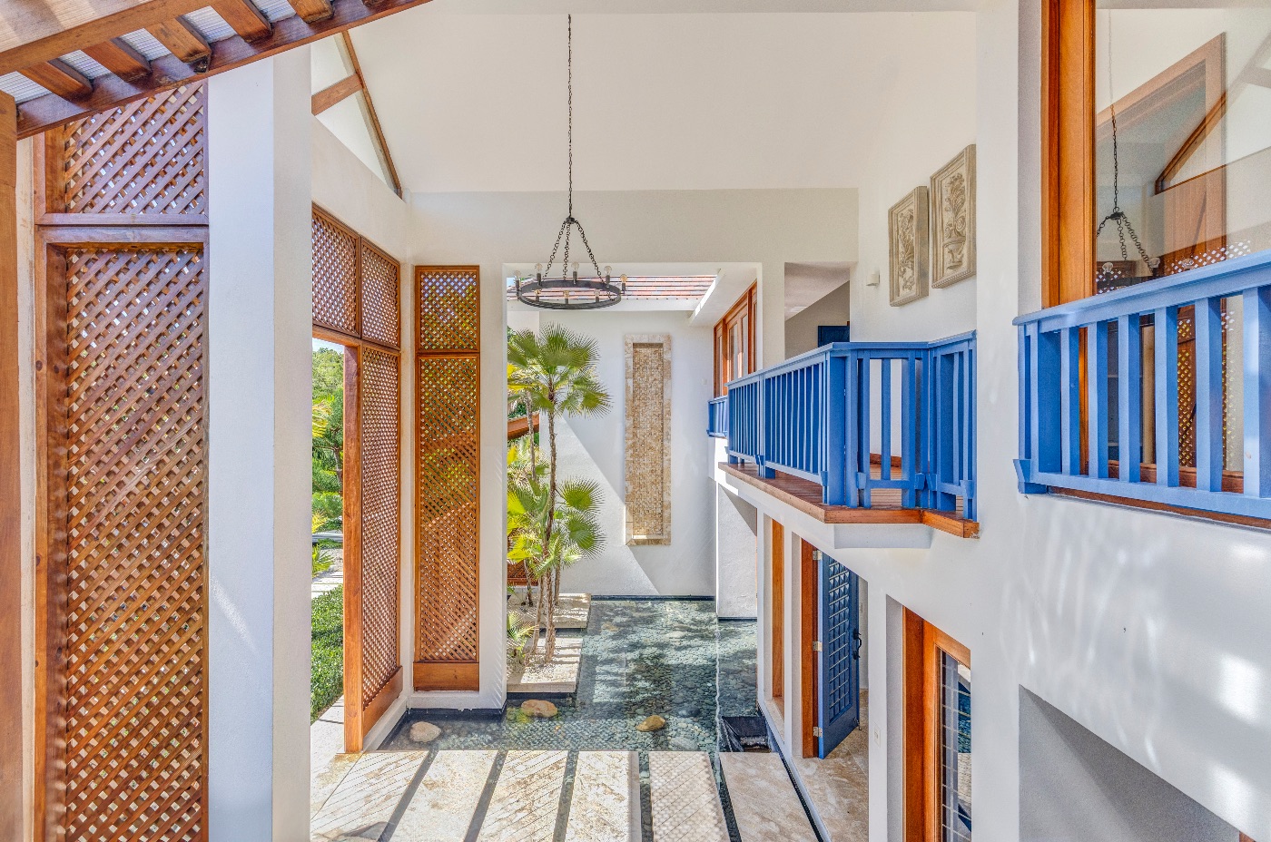 The entrance of this stylish villa introduces you to what sort of visual delights are in store. Flanked by mature gardens, a stone walk leads you into the oversized courtyard, and you cross a small and appealing pond to enter through the massive double doors. The palette of warmly stained wood accents, bold blue, and white creates a wonderful tone throughout.