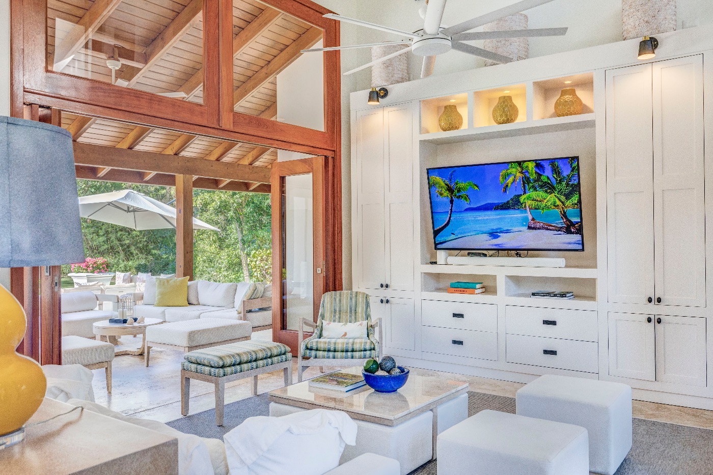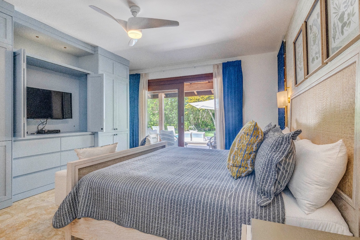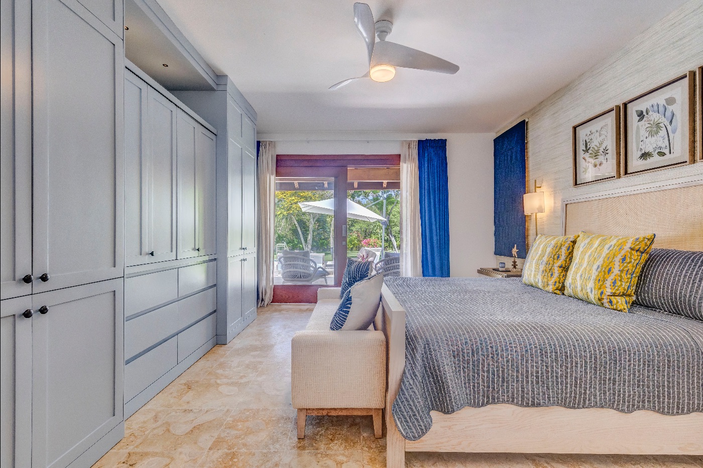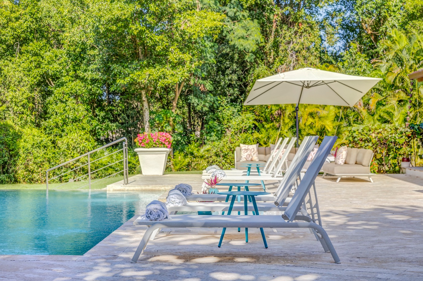 The central hall takes you straight through the villa and out to the portico, with an al fresco dining area and barbecue and an oversized lounge with banquette sofa. Beyond this, the stone terrace leads to the pool and sun deck. With several areas for lounging in the shade or sun, this is sure to become a favorite destination – especially with those views of the golf course and the sprawling grounds that surround the villa.