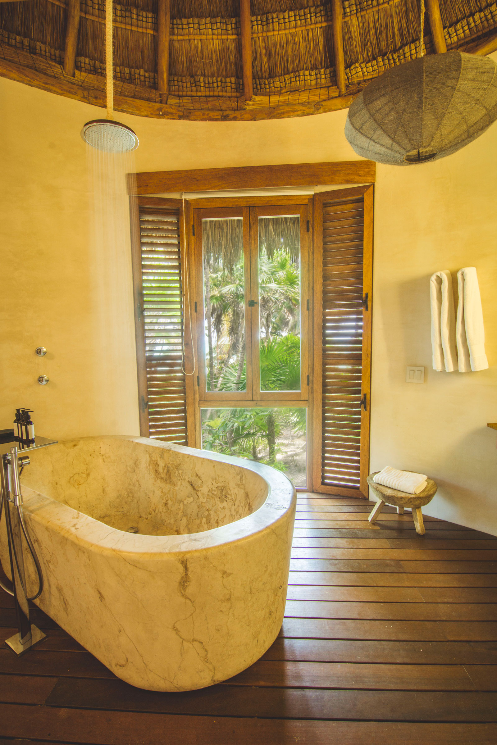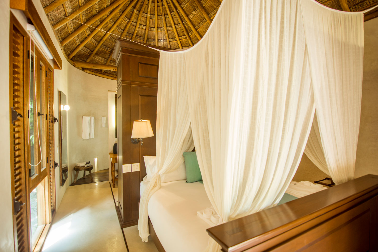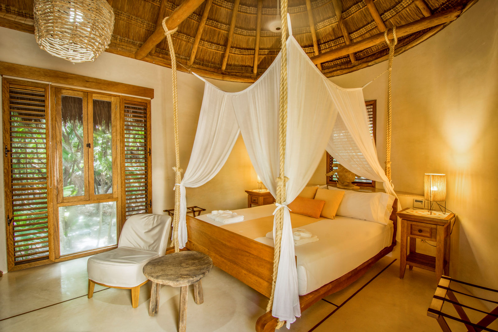 The water beats the rhythm of the days. Coconut palms lean toward a reef that paints the horizon in shifting blues, and 328 feet of empty beach stretch out from the terrace. The breeze is scented with copal and salt. As you head inland, the lagoon awaits you in the shade of mangroves, its egret and osprey slipstream and its clear canals tangled with turtle grass.