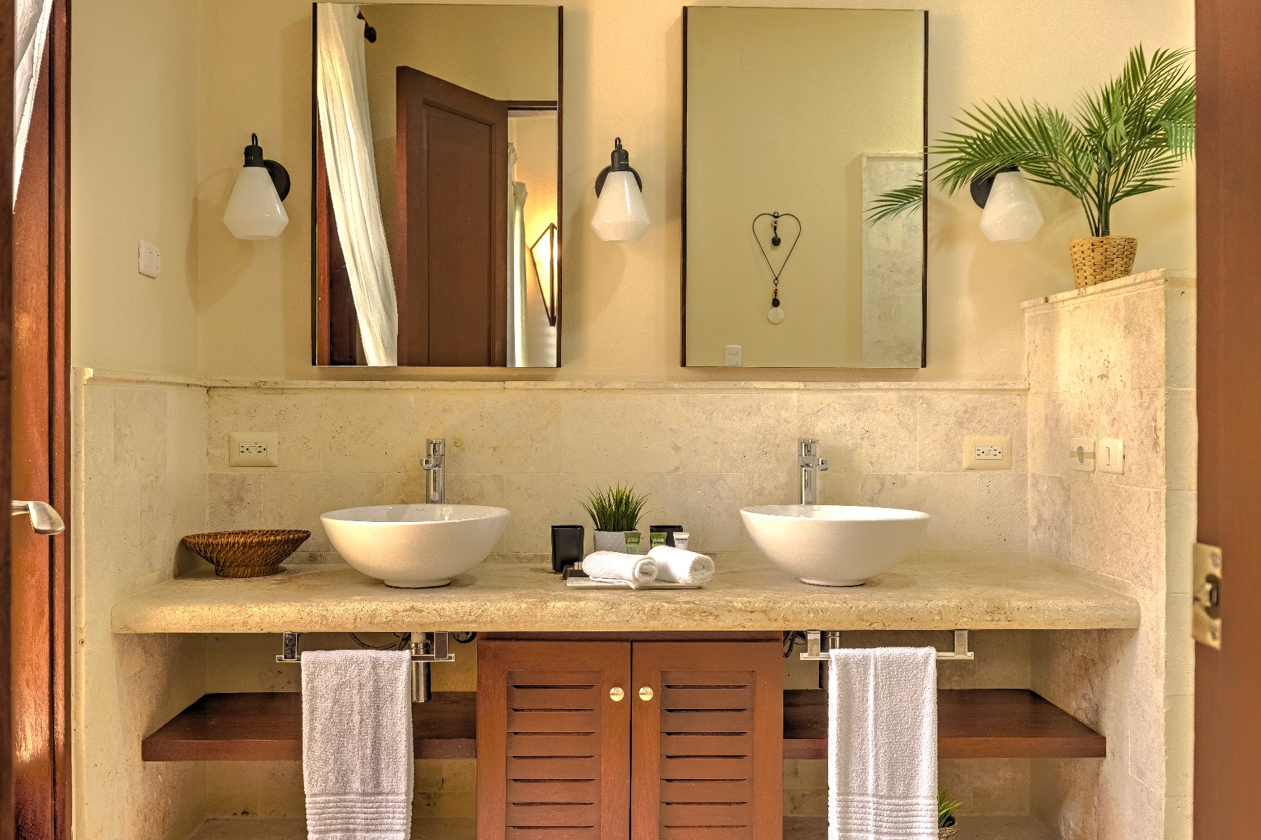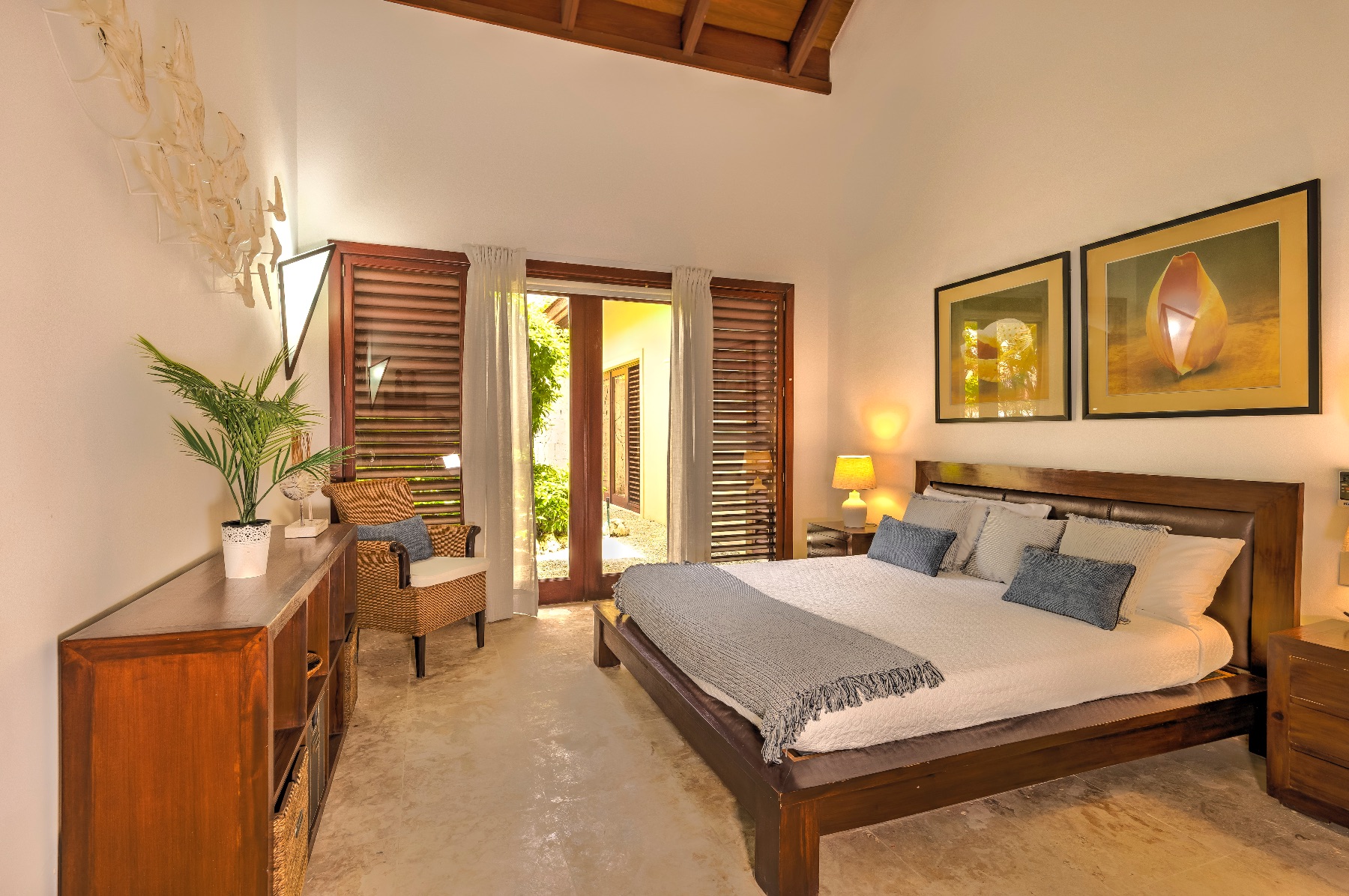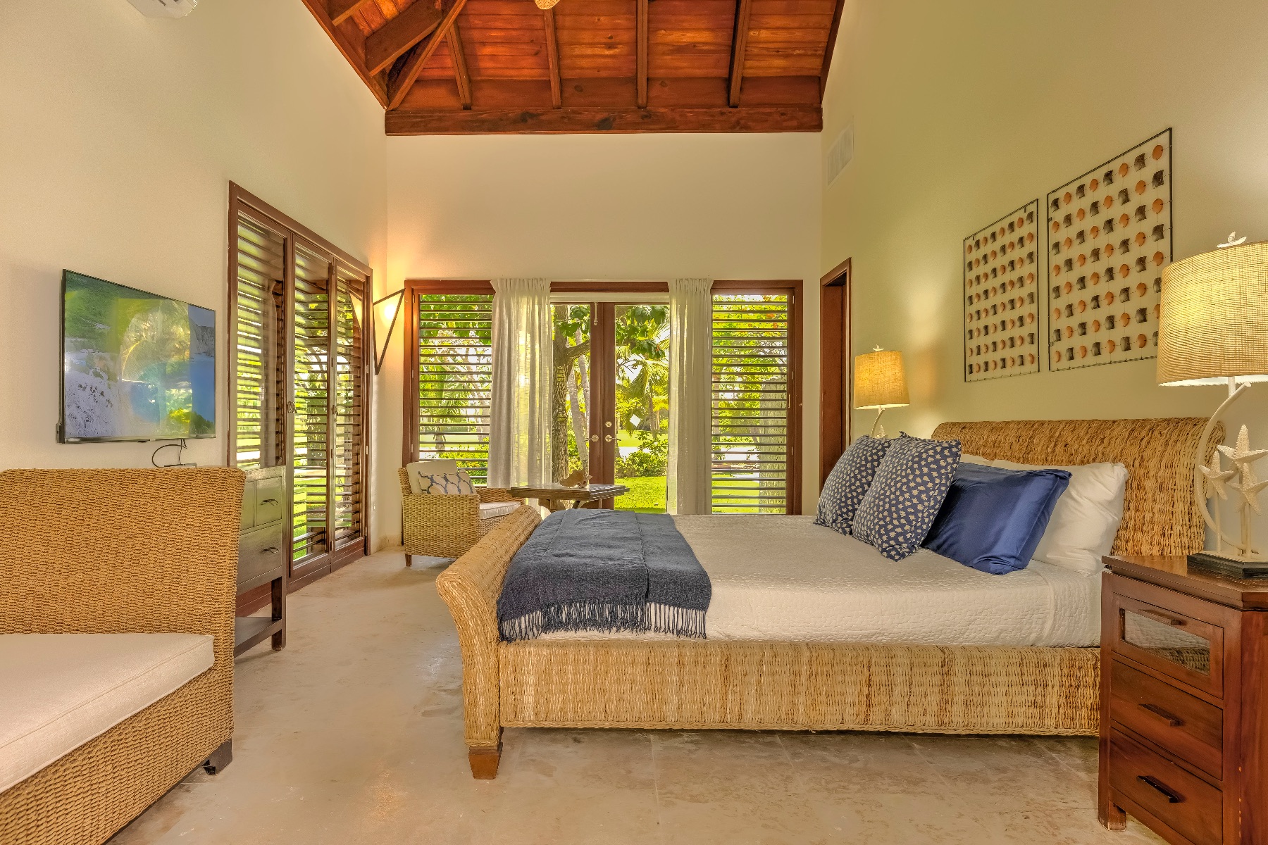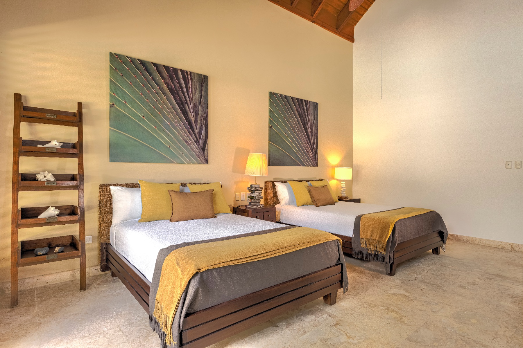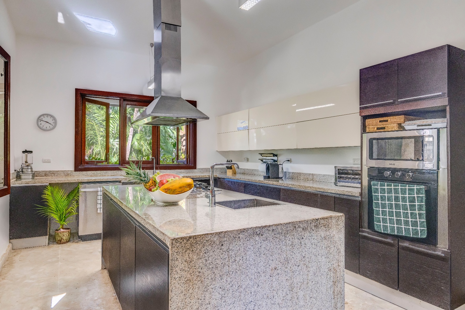 Vibrant green lawns, palm trees, and vegetation surround the property, adding natural beauty and increased privacy to the villa. The hay roof of the palapa continues the natural theme, while housing designer furniture, art, and elegant lighting. Moving inside, your transition will be seamless. Large windowed doors open nearly the full length of the living area, letting the sunlight and fresh ocean air travel throughout the entire interior. The living room has an incredible vaulted ceiling, cozy couches and armchairs, and it’s decorated with inspiration from the local environment. The kitchen is bright and functional. Plenty of counter top workspace and high end stainless steel appliances make meal preparation a breeze.