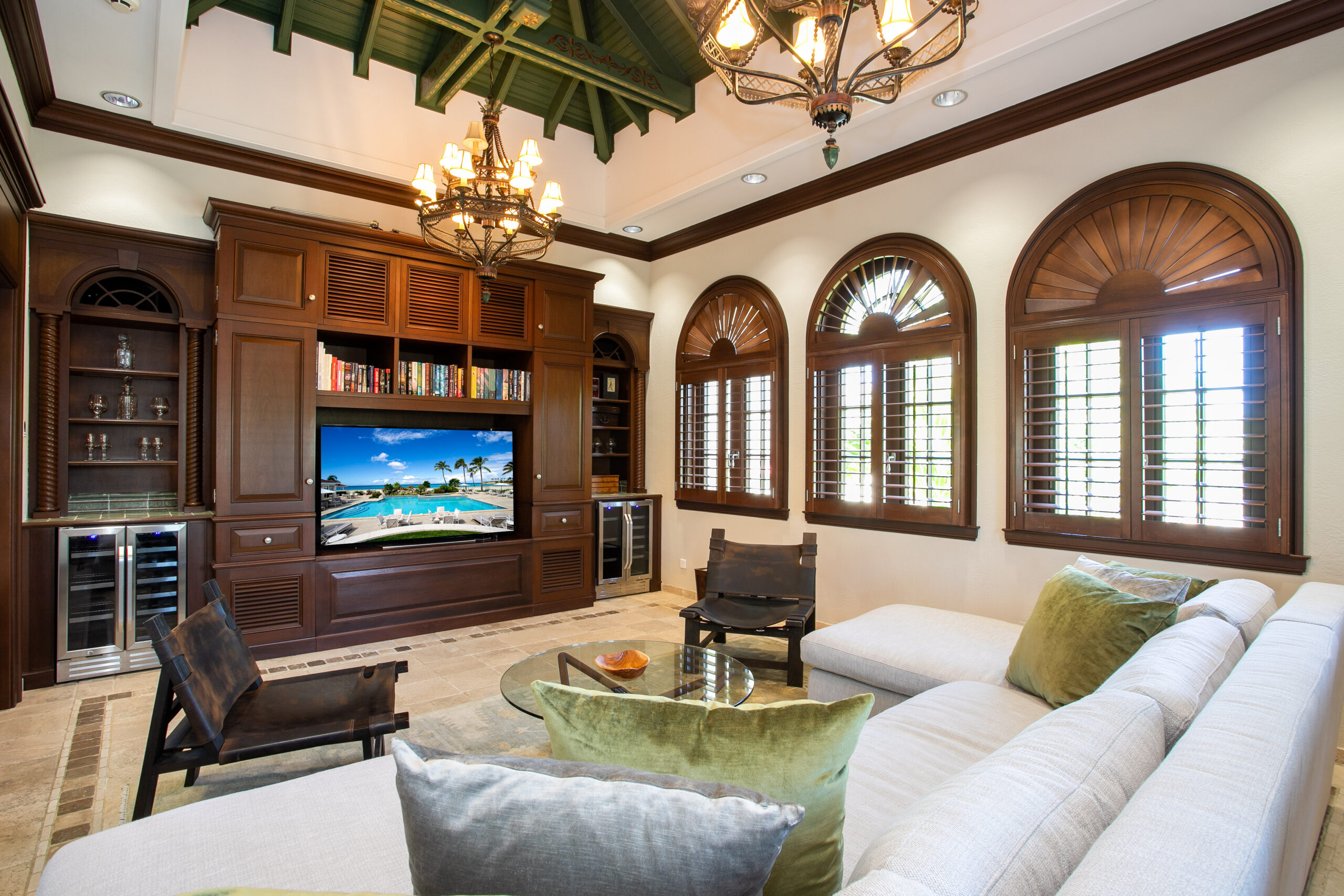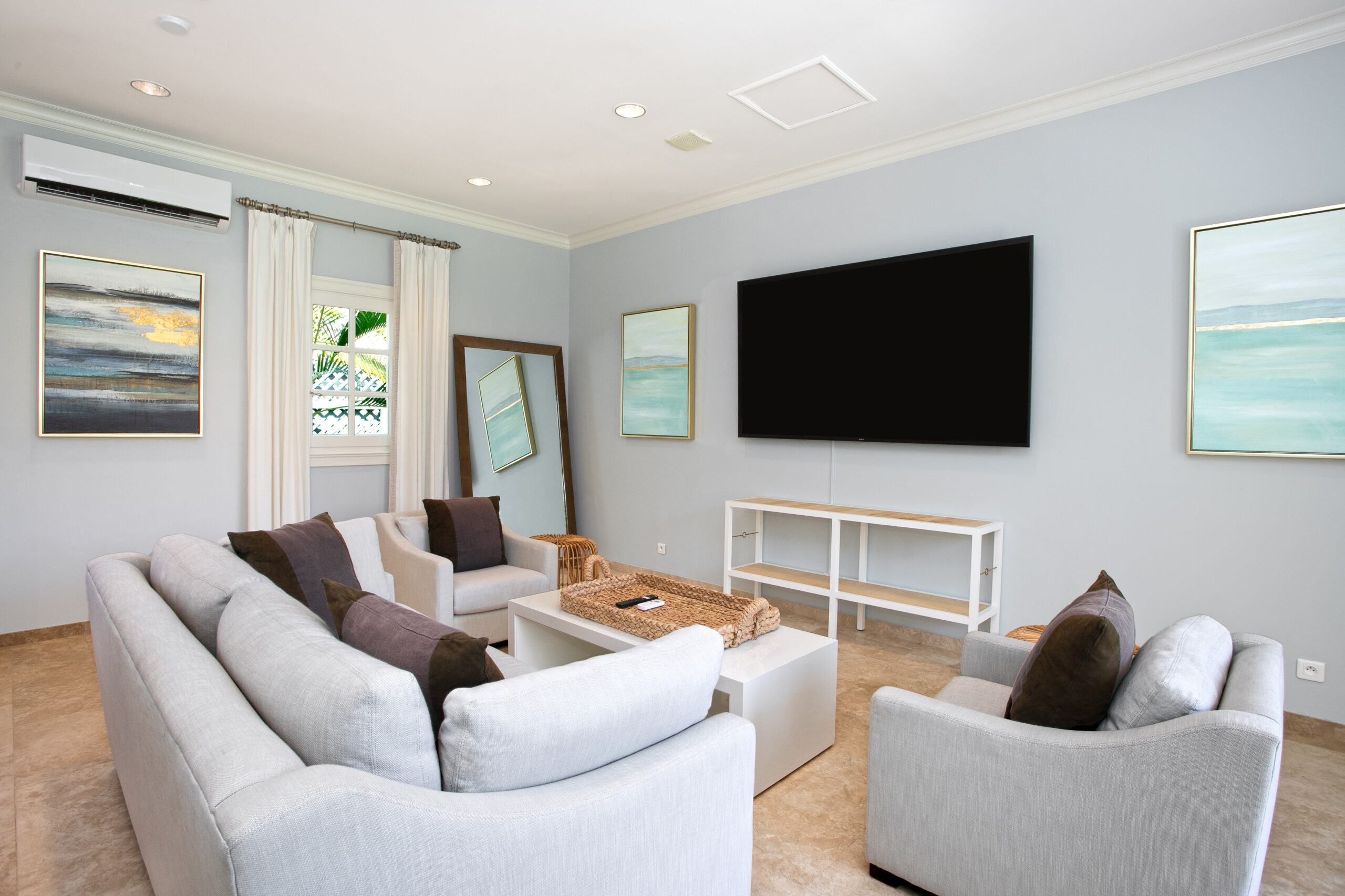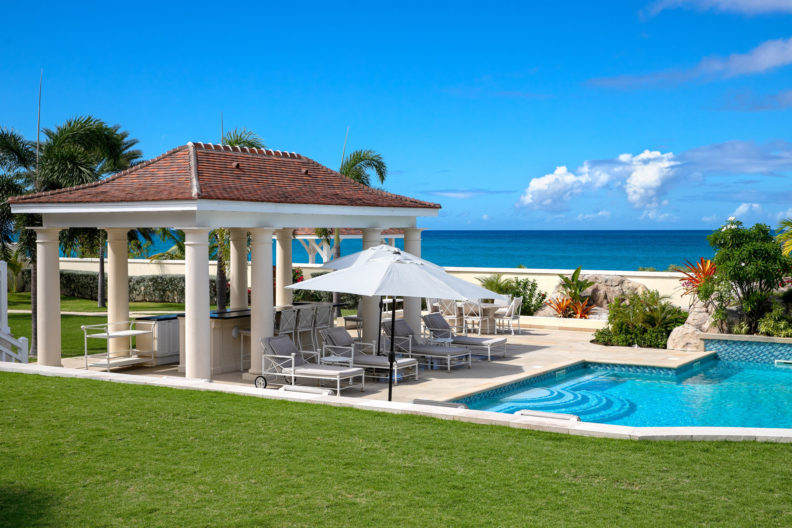 The oceanside villa features 6 King Size bedrooms with full private baths including a two-story master suite with a master bath with Jacuzzi tub and two private balconies facing the pool & ocean. The remaining interior spaces include a fully equipped kitchen, a formal living room, a formal dining room seating 10, and a casual outside dining area and a media room.