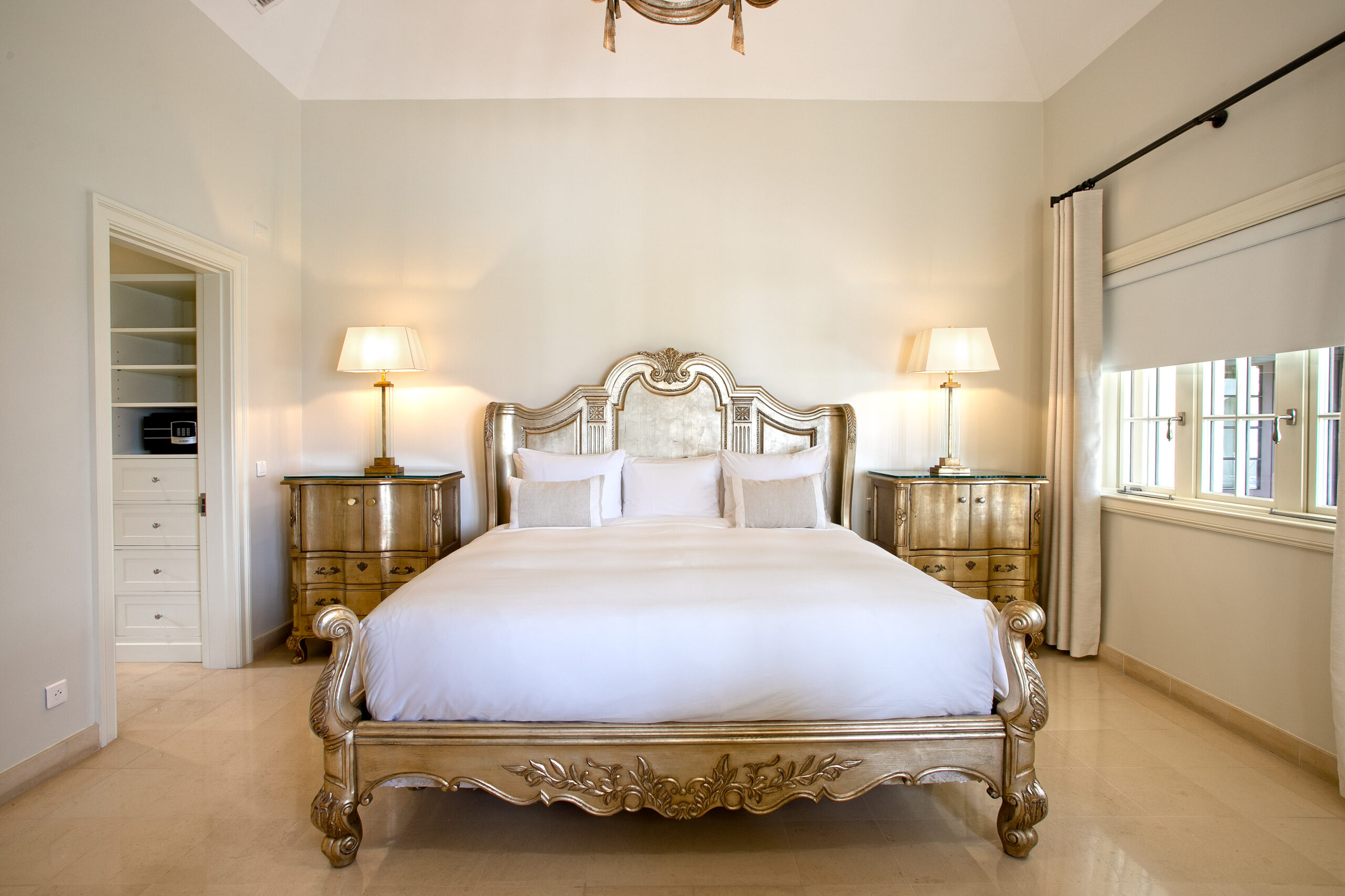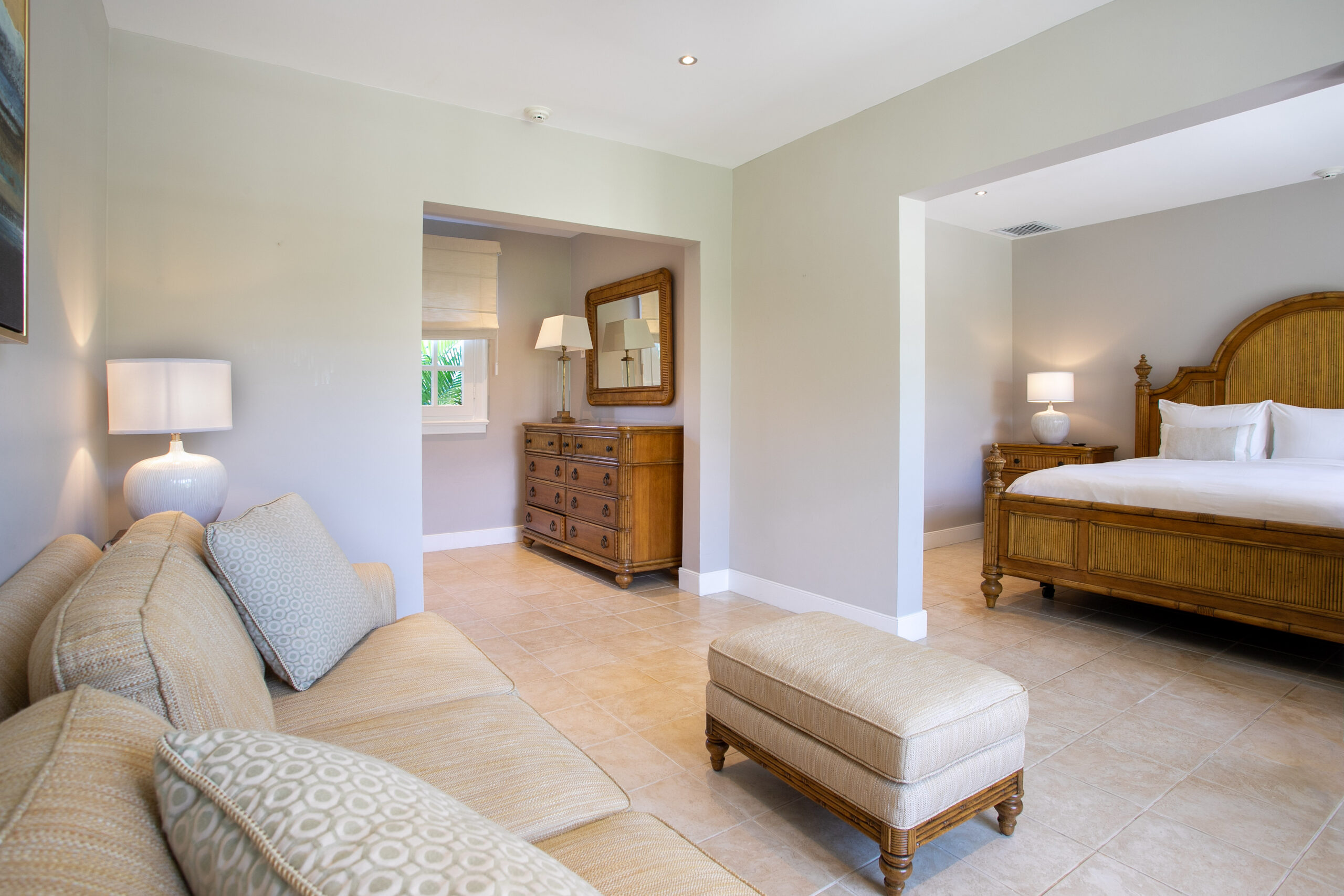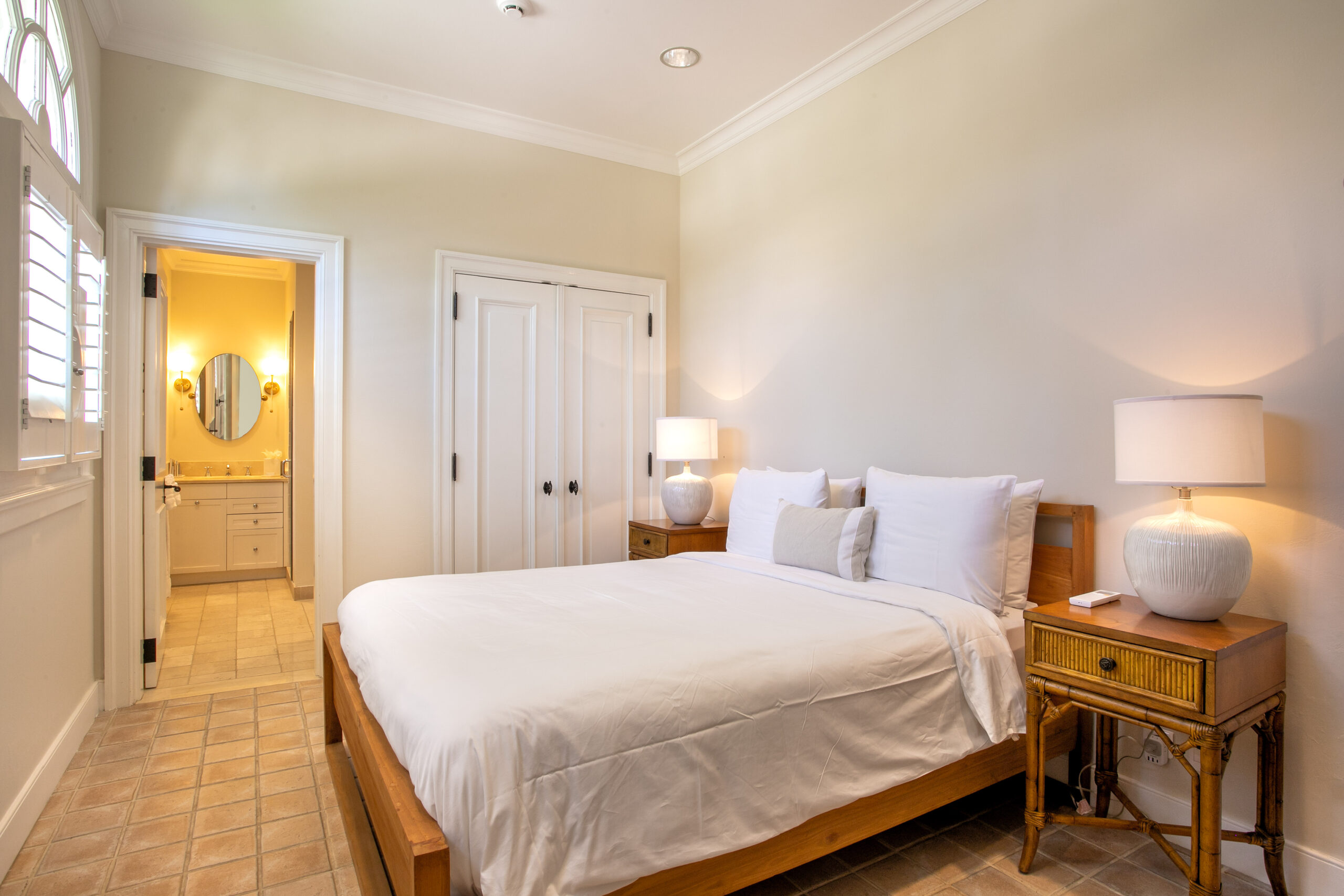 The 4 bedroom garden side villa features the” Jungle Room” with king-size bed and small living room, the “Palm Room” with king-size mahogany bed and a 2 bedroom Suite with queen size beds, a shared living room, and cozy dining room. There is also a huge commercial catering kitchen.