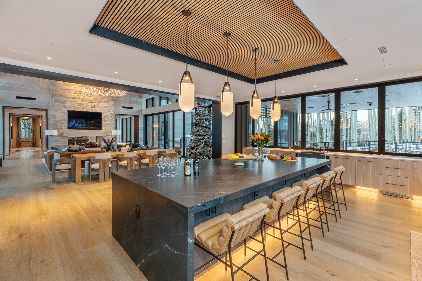 From the moment you enter, soaring ceilings and expansive picture windows frame uninterrupted mountain vistas, flooding the interiors with natural light. The open-concept layout creates a fluid transition between living, dining, and culinary spaces, delivering both architectural drama and intimate comfort.