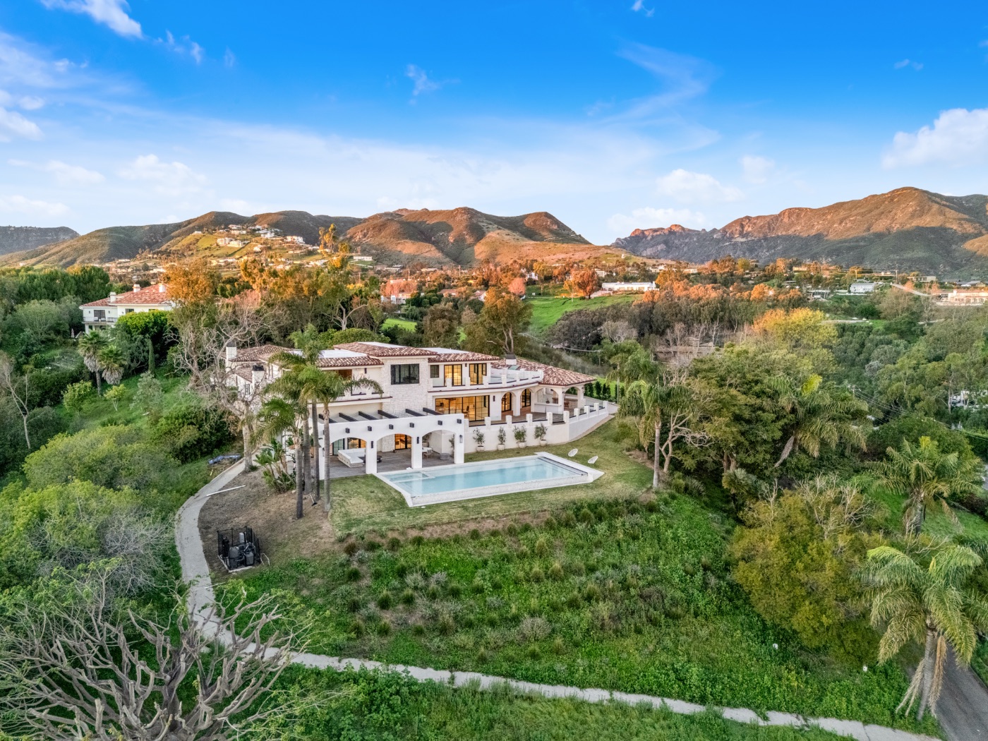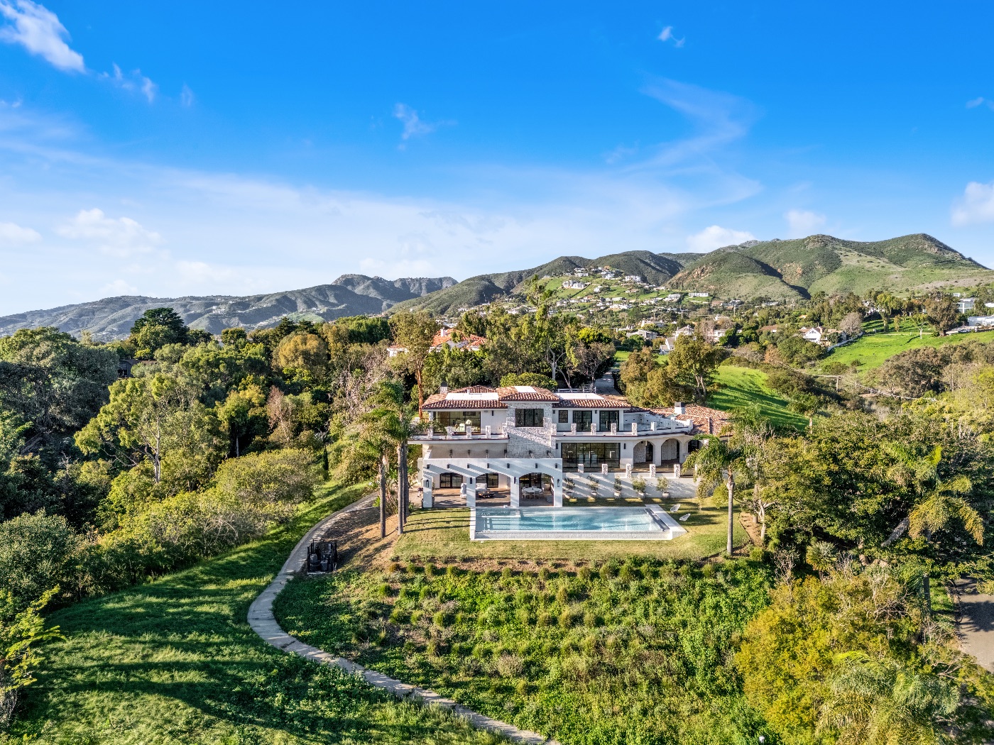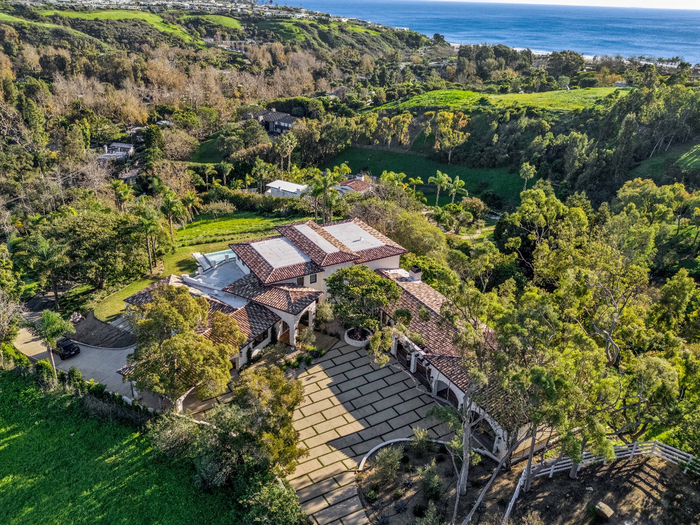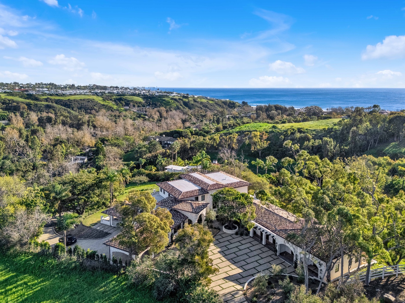 Perched above the iconic Malibu coastline, this newly built Mediterranean-inspired estate offers the rare balance of architectural warmth, estate-level privacy, and sweeping Pacific Ocean views. Conceived as a private compound rather than a traditional residence, the property unfolds around a grand motor court and tranquil central courtyard before revealing expansive terraces, manicured lawns, and a resort-style swimming pool overlooking canyon landscapes and the ocean horizon.