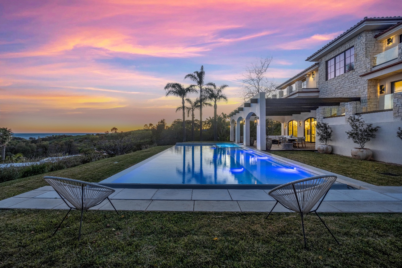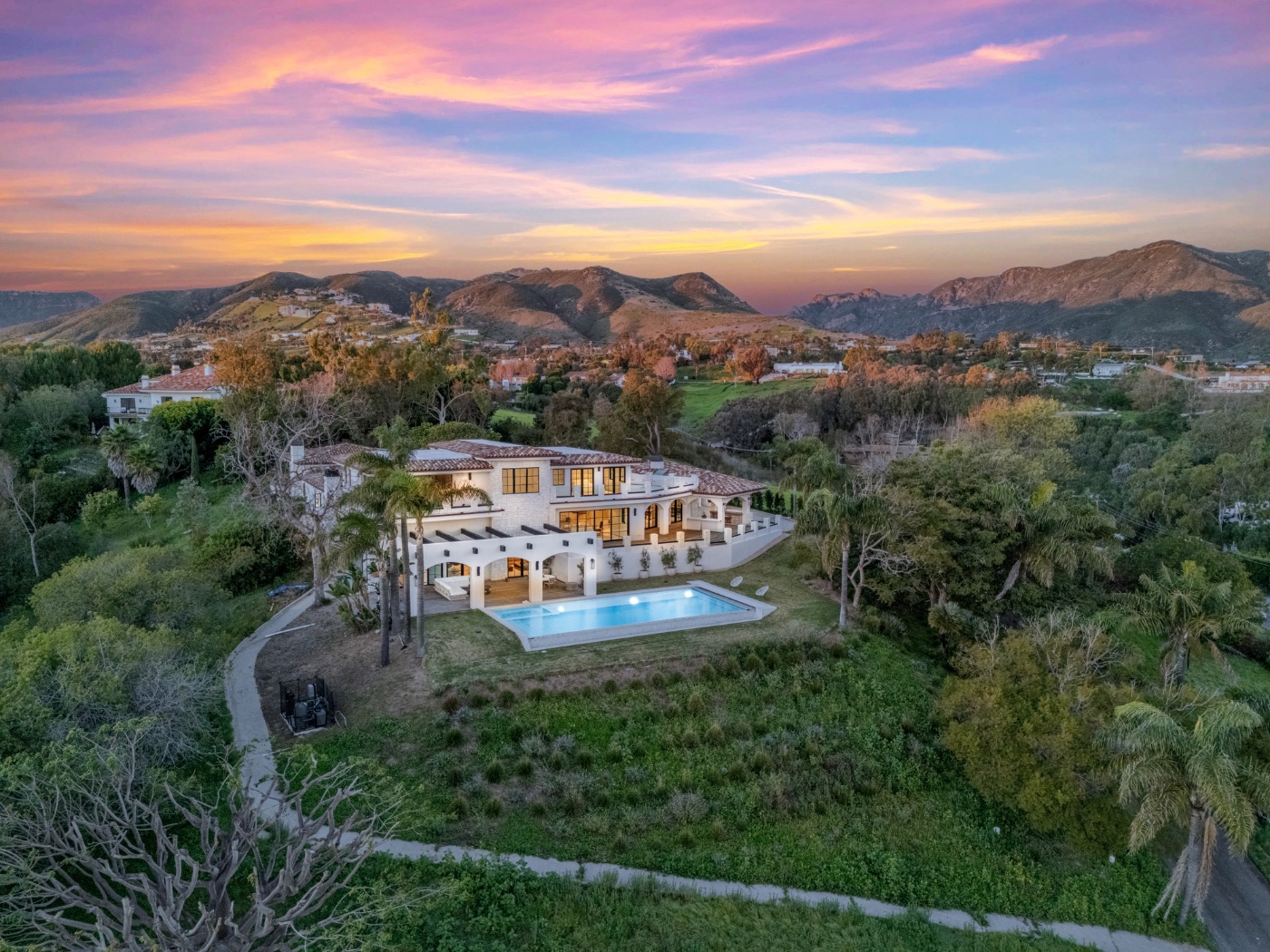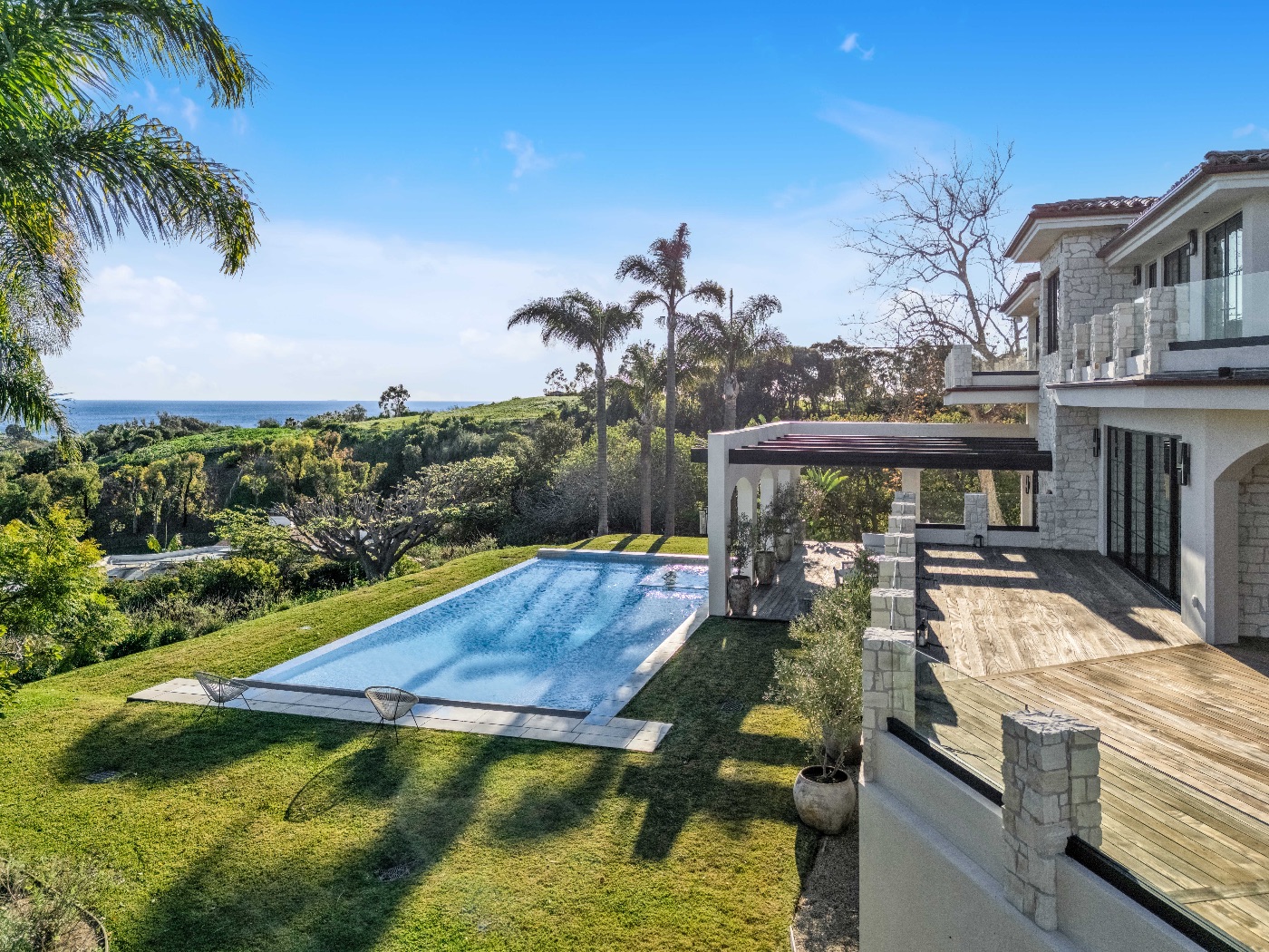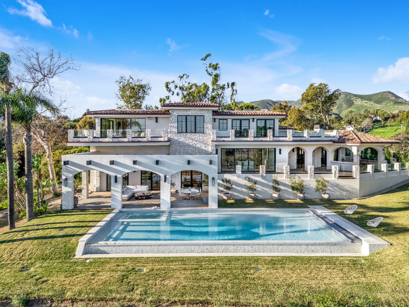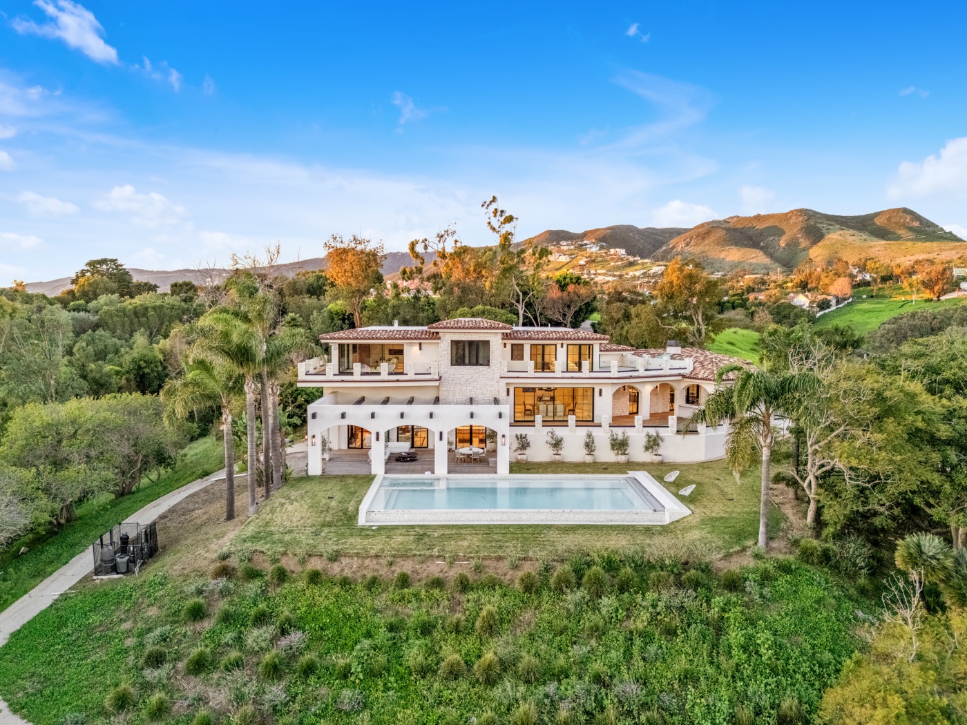 Perched above the iconic Malibu coastline, this newly built Mediterranean-inspired estate offers the rare balance of architectural warmth, estate-level privacy, and sweeping Pacific Ocean views. Conceived as a private compound rather than a traditional residence, the property unfolds around a grand motor court and tranquil central courtyard before revealing expansive terraces, manicured lawns, and a resort-style swimming pool overlooking canyon landscapes and the ocean horizon.