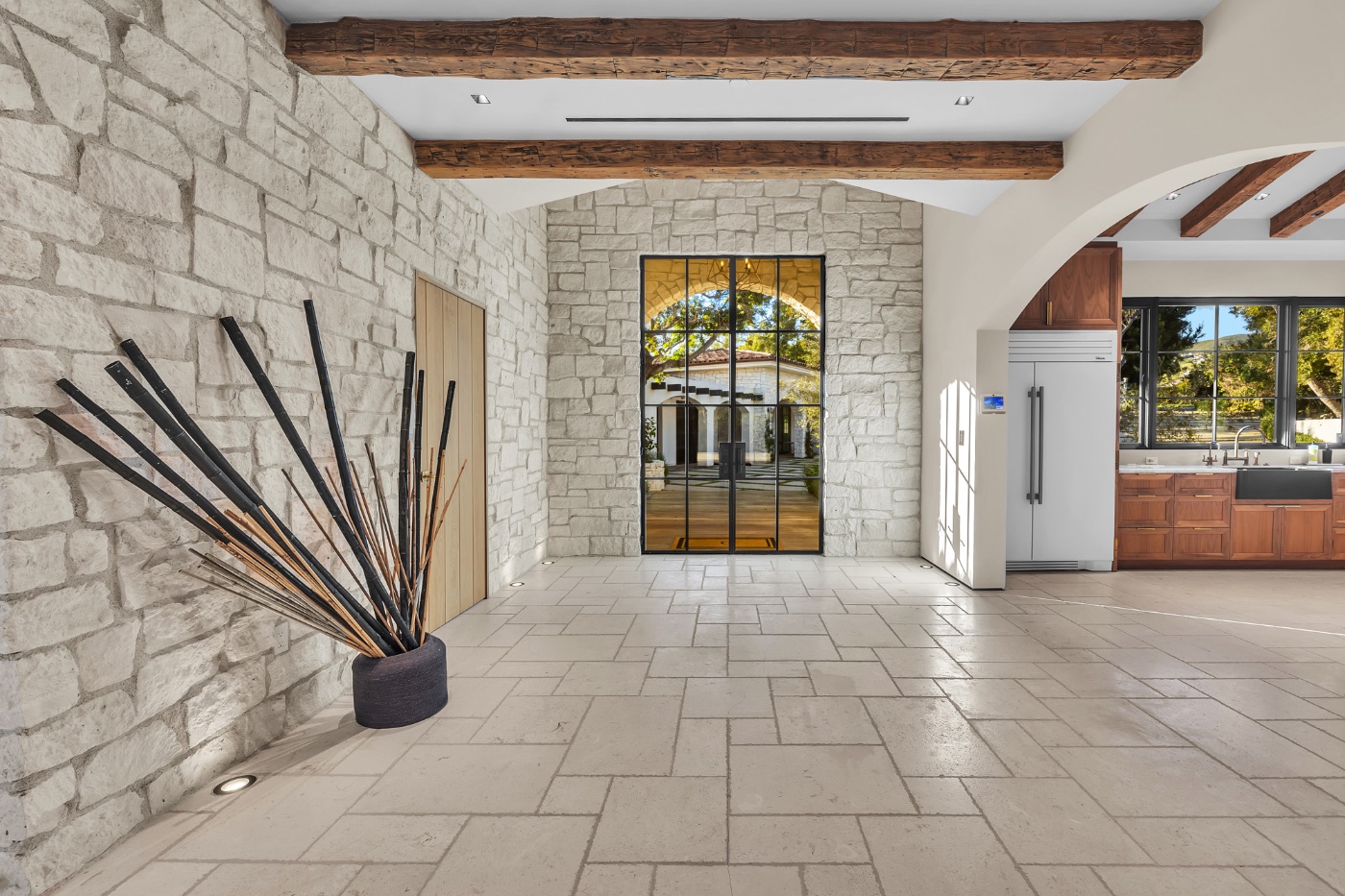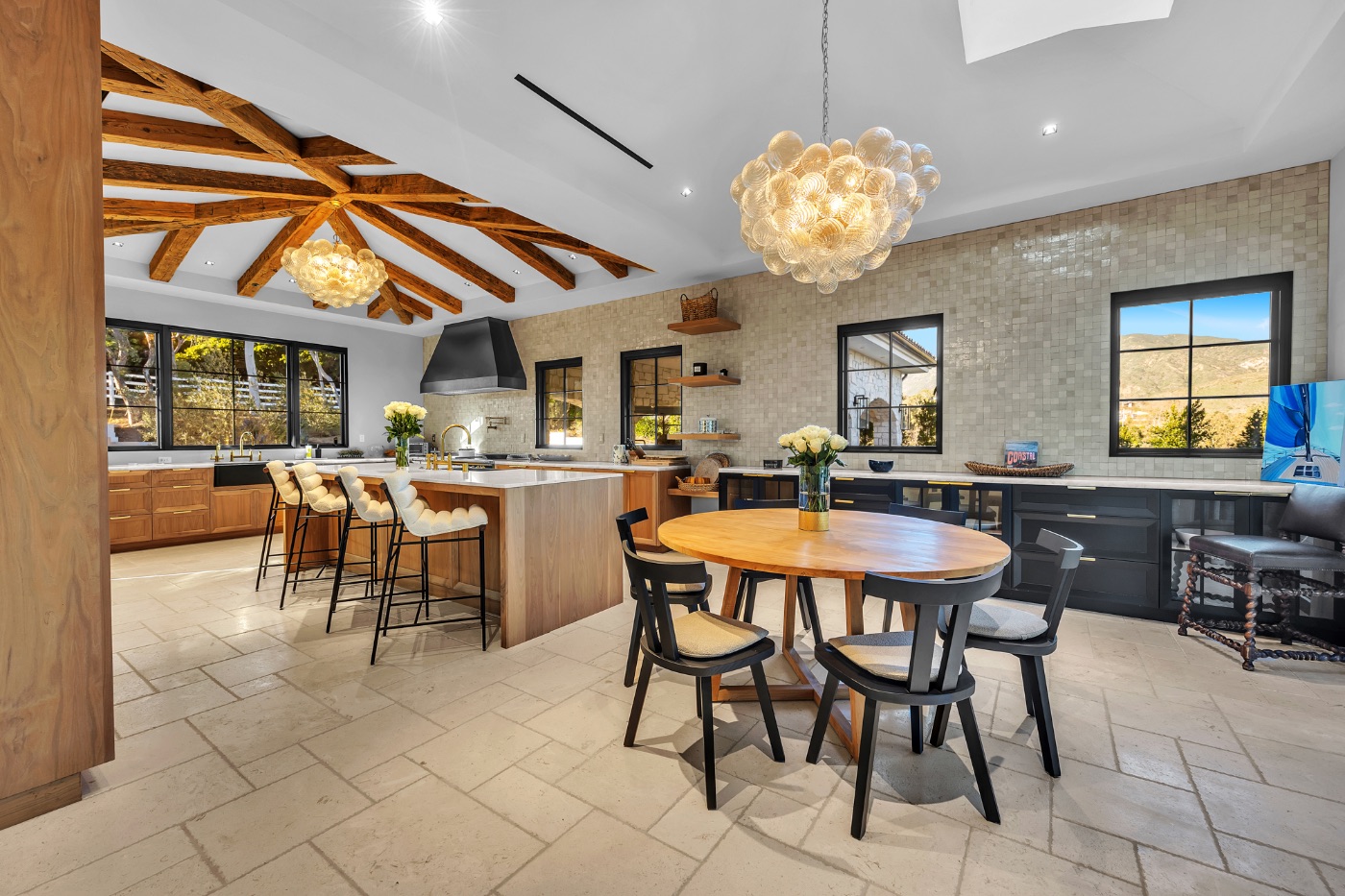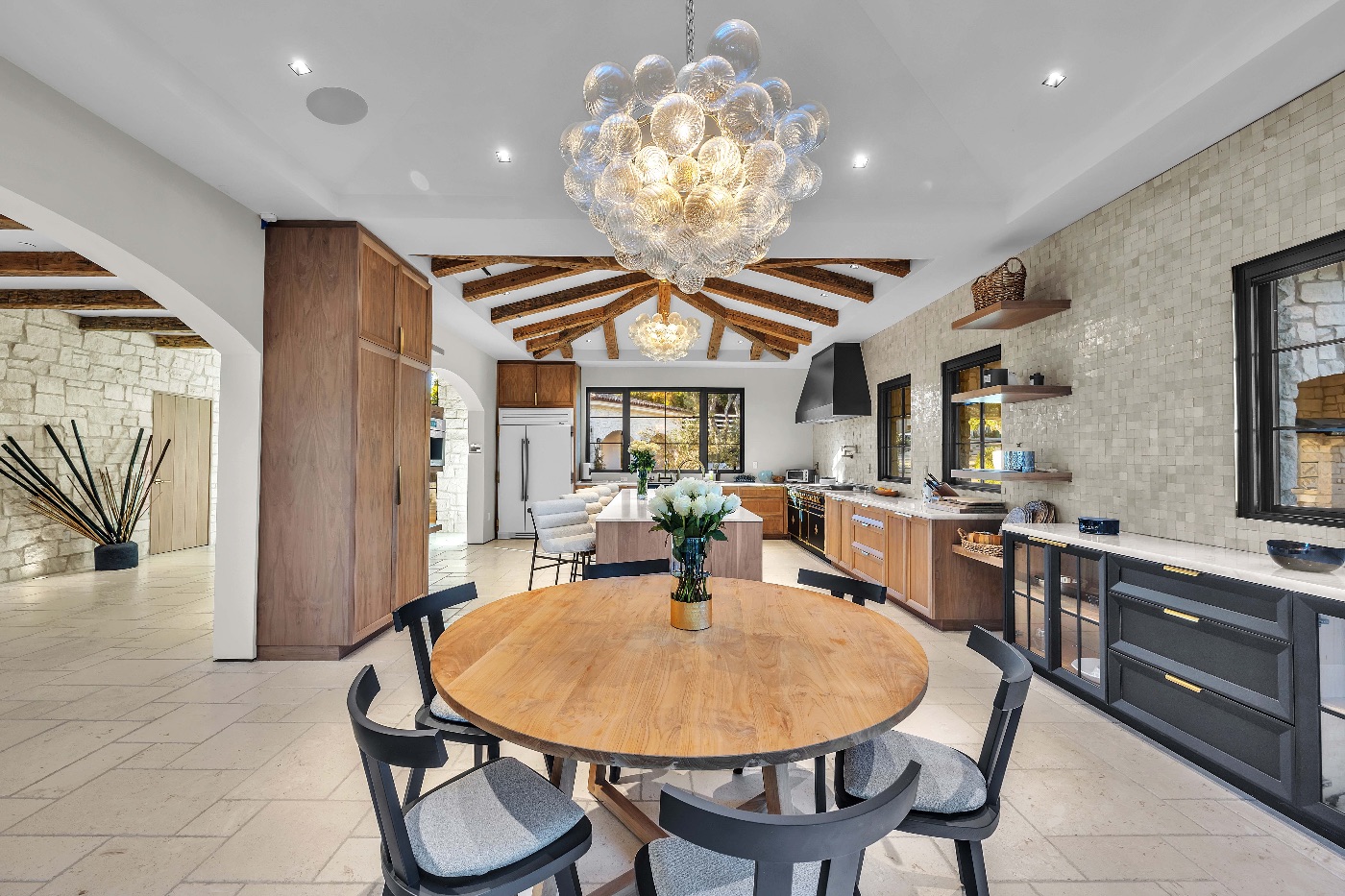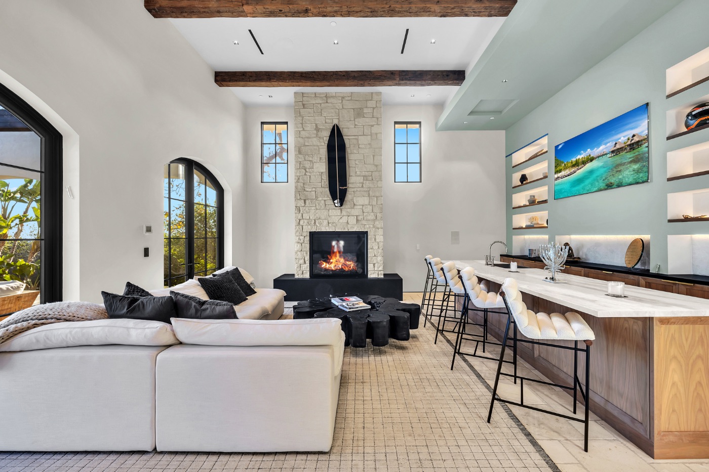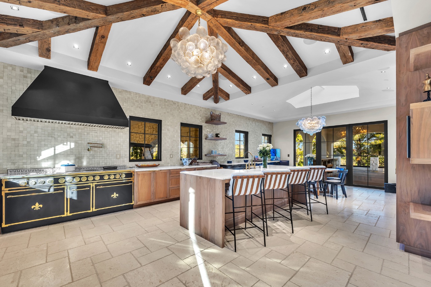 Inside, soaring ceilings with exposed reclaimed wood beams, hand-finished stone archways, and floor-to-ceiling glass doors create a refined yet relaxed environment. The chef’s kitchen, anchored by a professional-grade L’Atelier stove and gourmet appliances, flows seamlessly into multiple living and dining areas designed for entertaining or extended coastal stays.