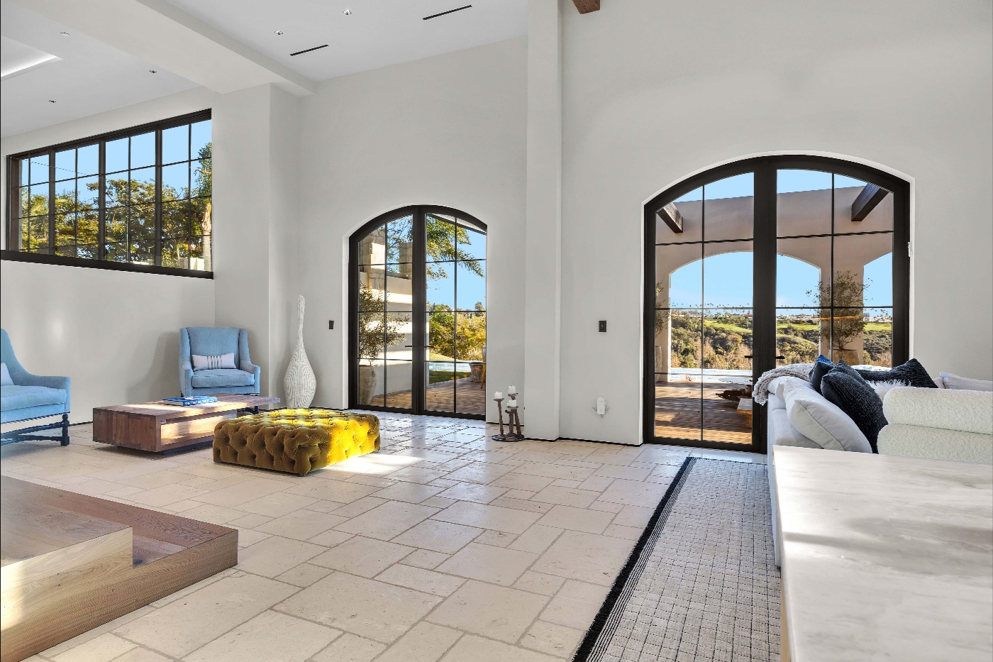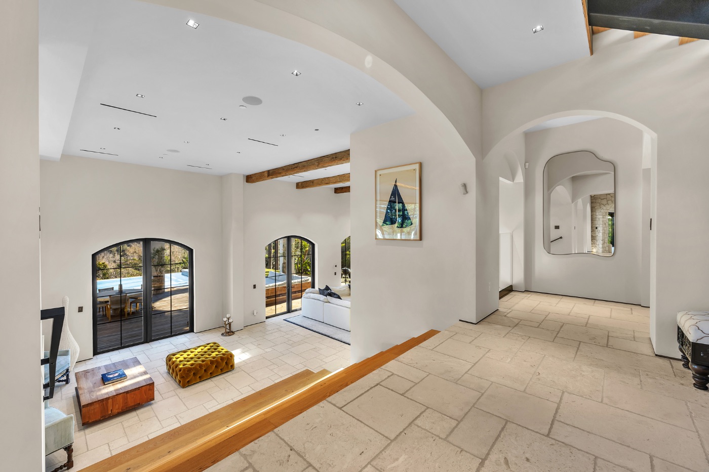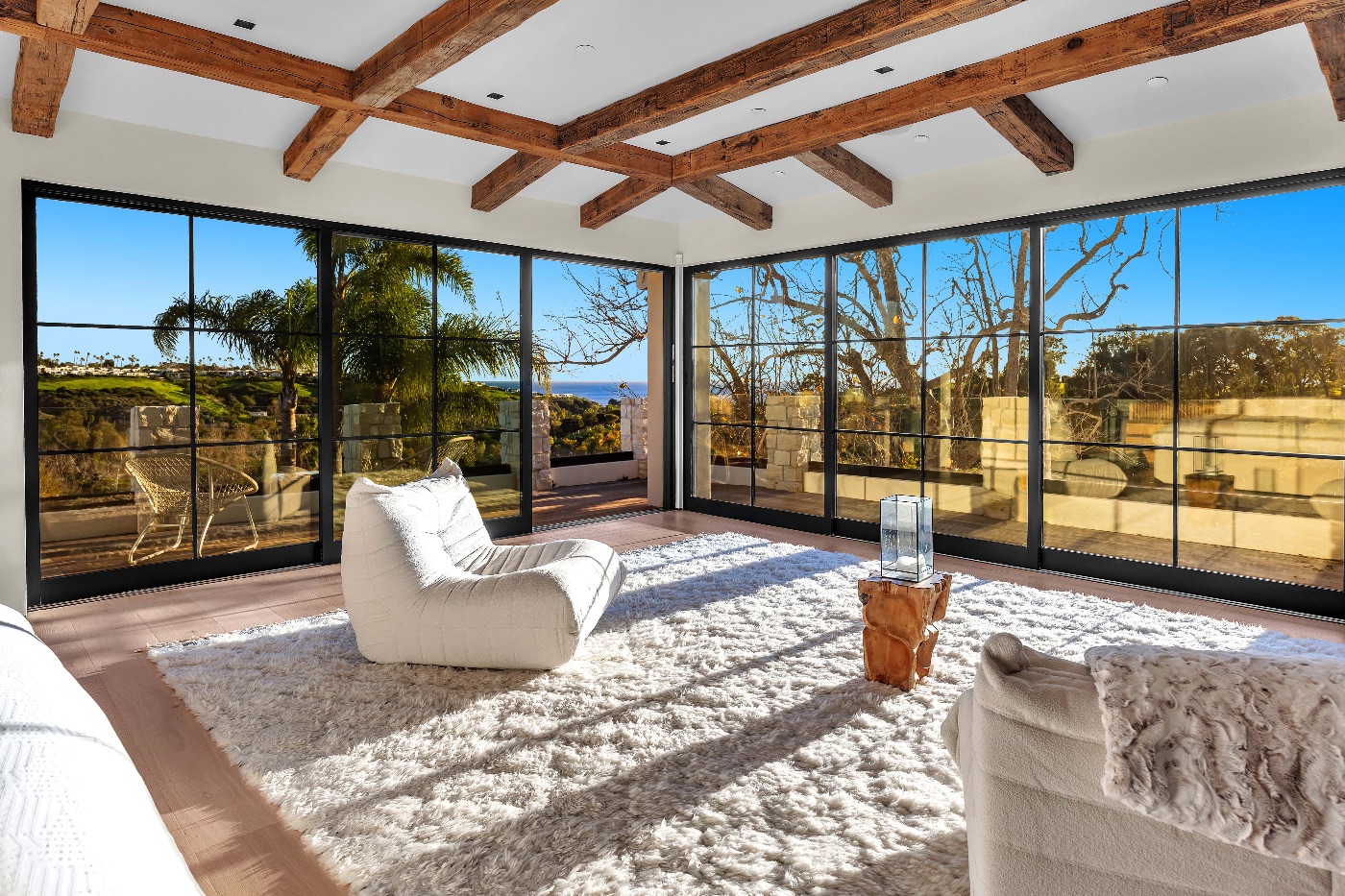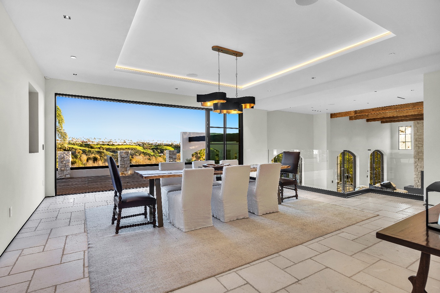 Inside, soaring ceilings with exposed reclaimed wood beams, hand-finished stone archways, and floor-to-ceiling glass doors create a refined yet relaxed environment. The chef’s kitchen, anchored by a professional-grade L’Atelier stove and gourmet appliances, flows seamlessly into multiple living and dining areas designed for entertaining or extended coastal stays.