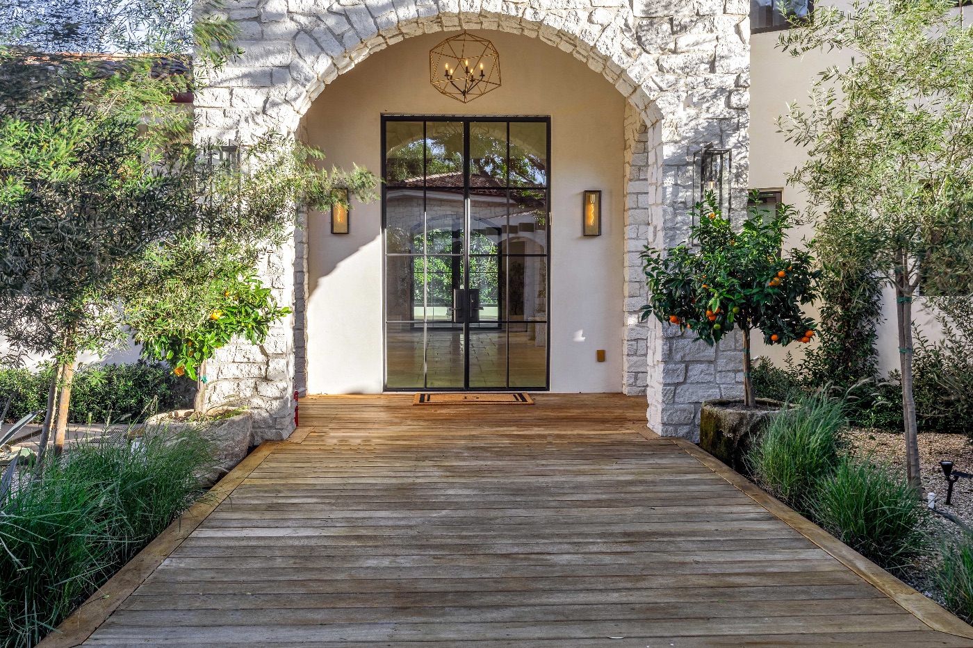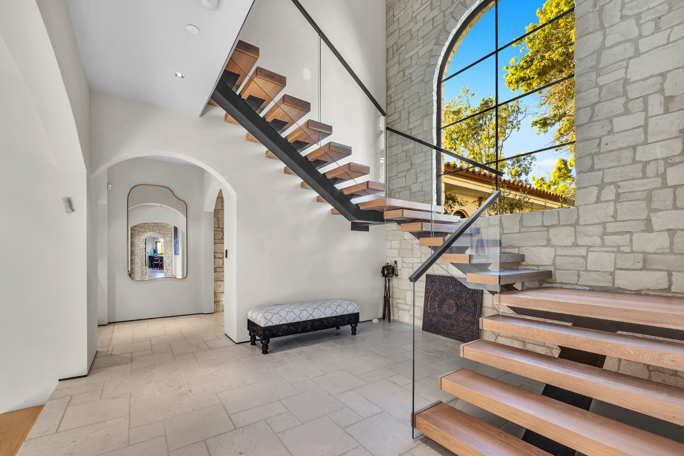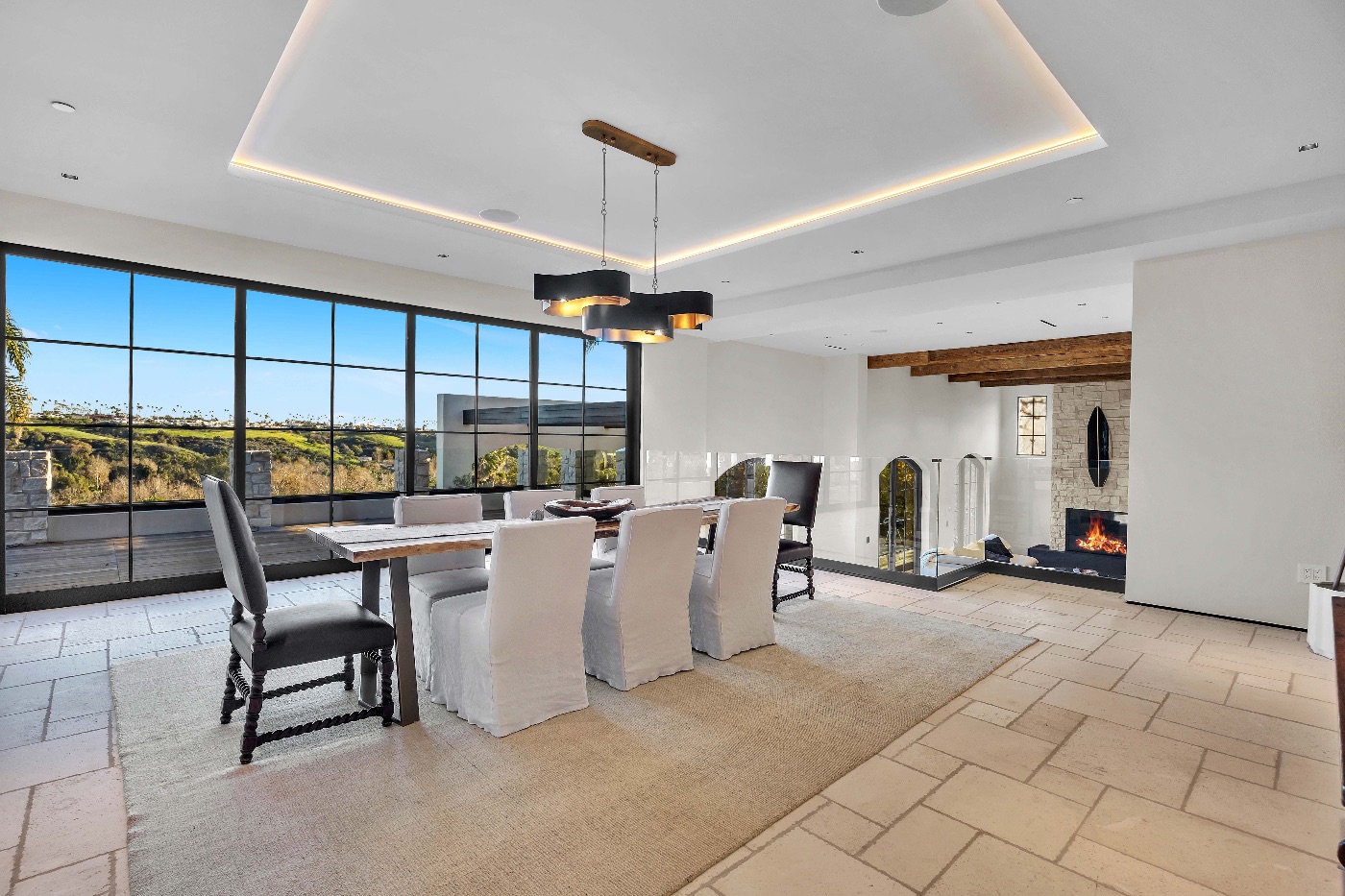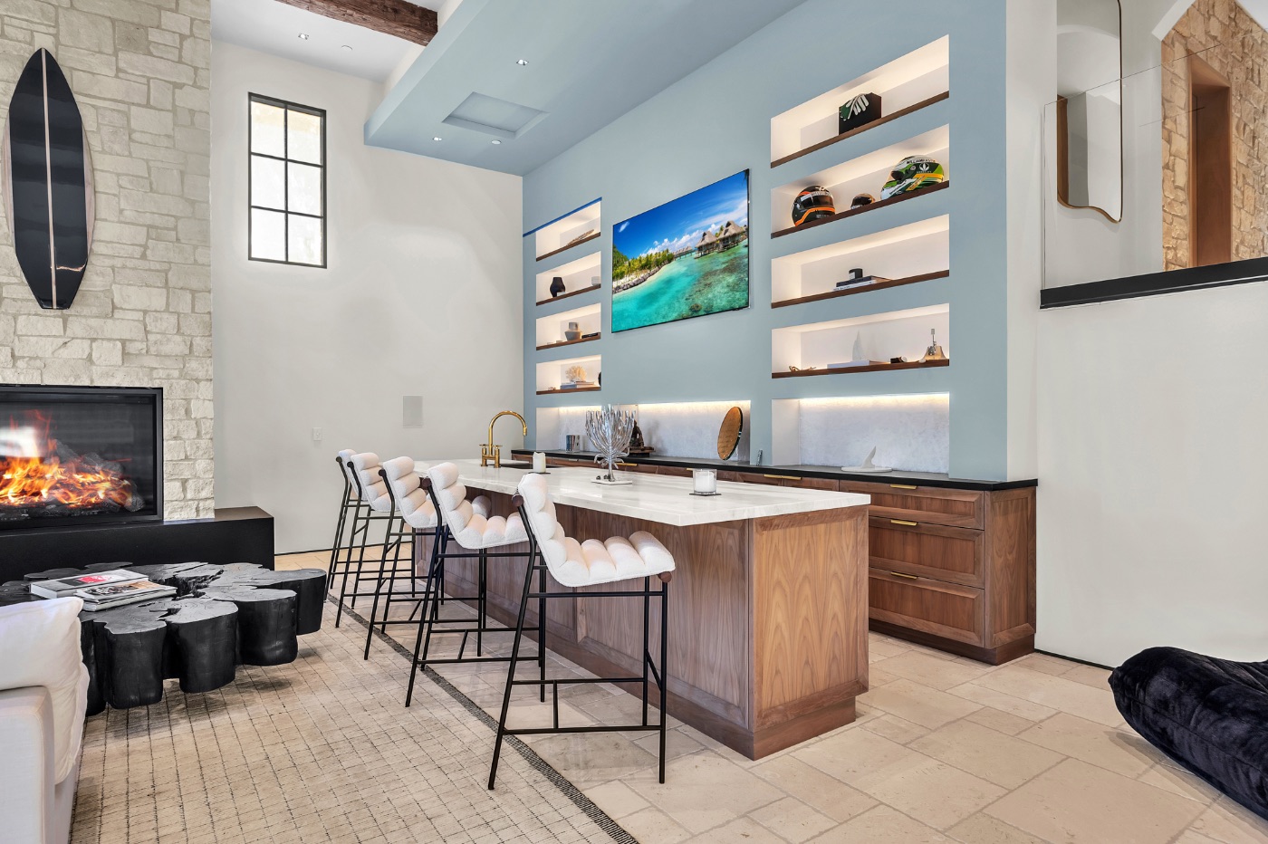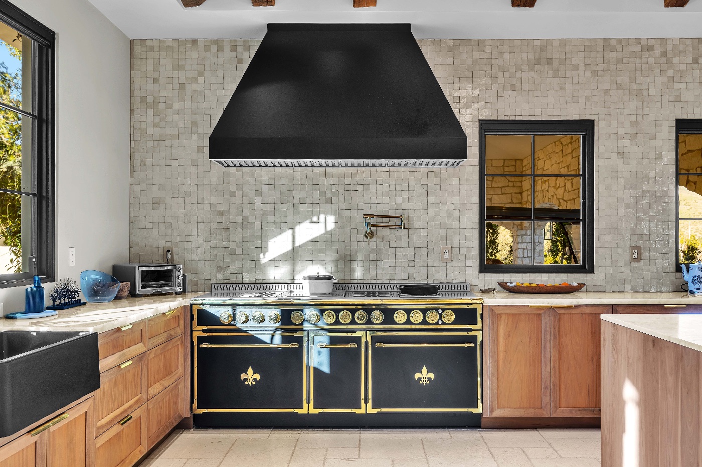 Inside, soaring ceilings with exposed reclaimed wood beams, hand-finished stone archways, and floor-to-ceiling glass doors create a refined yet relaxed environment. The chef’s kitchen, anchored by a professional-grade L’Atelier stove and gourmet appliances, flows seamlessly into multiple living and dining areas designed for entertaining or extended coastal stays.