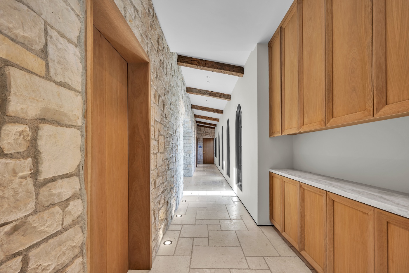 Exposed beams and stone architectural detailing