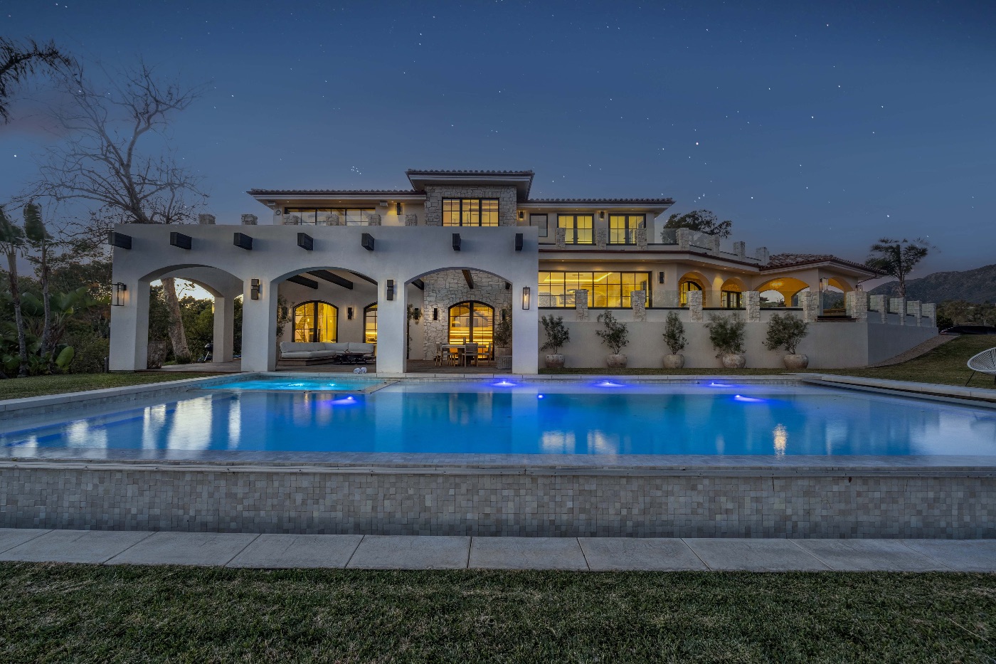 Resort-style pool with ambient evening lighting