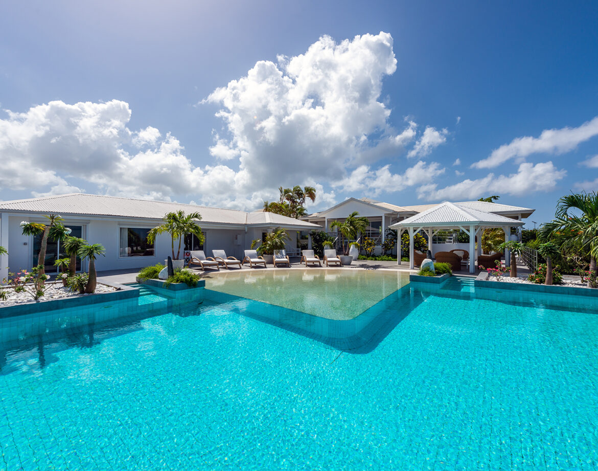From the entrance doors, flanked by oriental figurines, a reception area with glass walls and ornamental garden opens into the main L-shaped living area and its beautiful view over the ocean and the pool area below. The cooling gray and white interior of the living room features contemporary furnishings in natural wood, a TV viewing area with a cream-colored linen couch, and a large Samsung Smart TV. There is indoor dining with a large table and seating for ten adjacent to the open–plan modern kitchen with Bosch and Smeg appliances and long gray stone countertops. A second refrigerator and further storage space can be found to the rear of the kitchen and an intimate outdoor terrace, perfect for breakfast or for brunch, can be accessed via glass sliding doors. Further covered terraces leading from the living room provide ample space for outside living and dining and for enjoying the beautiful Caribbean sunsets.