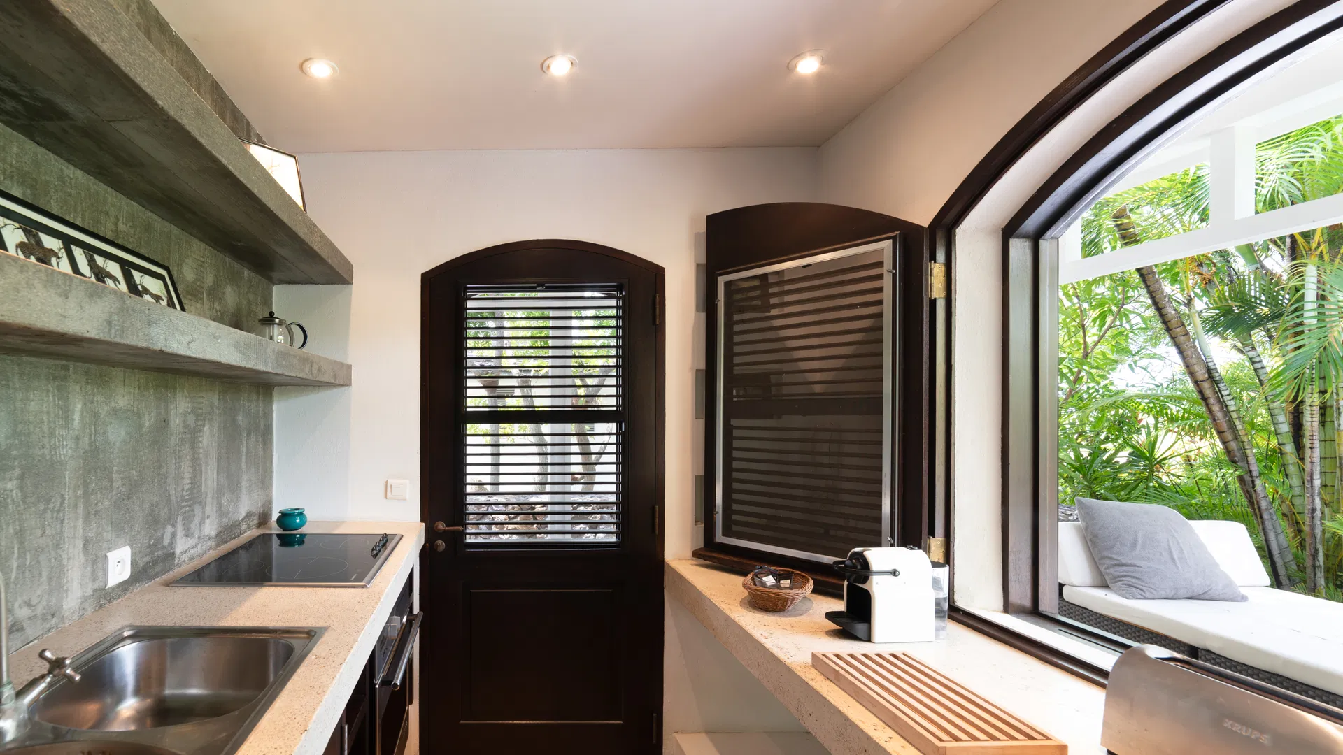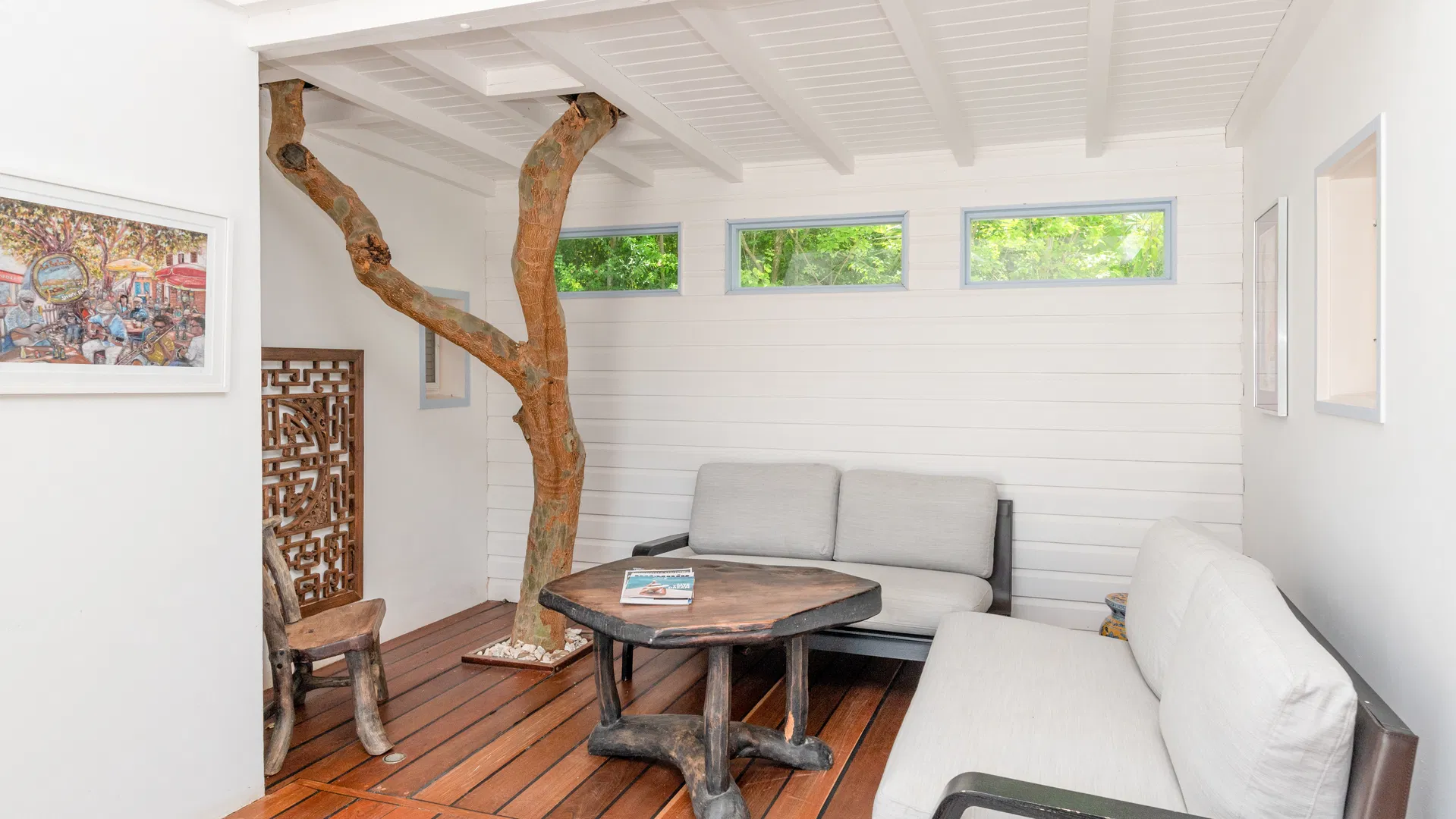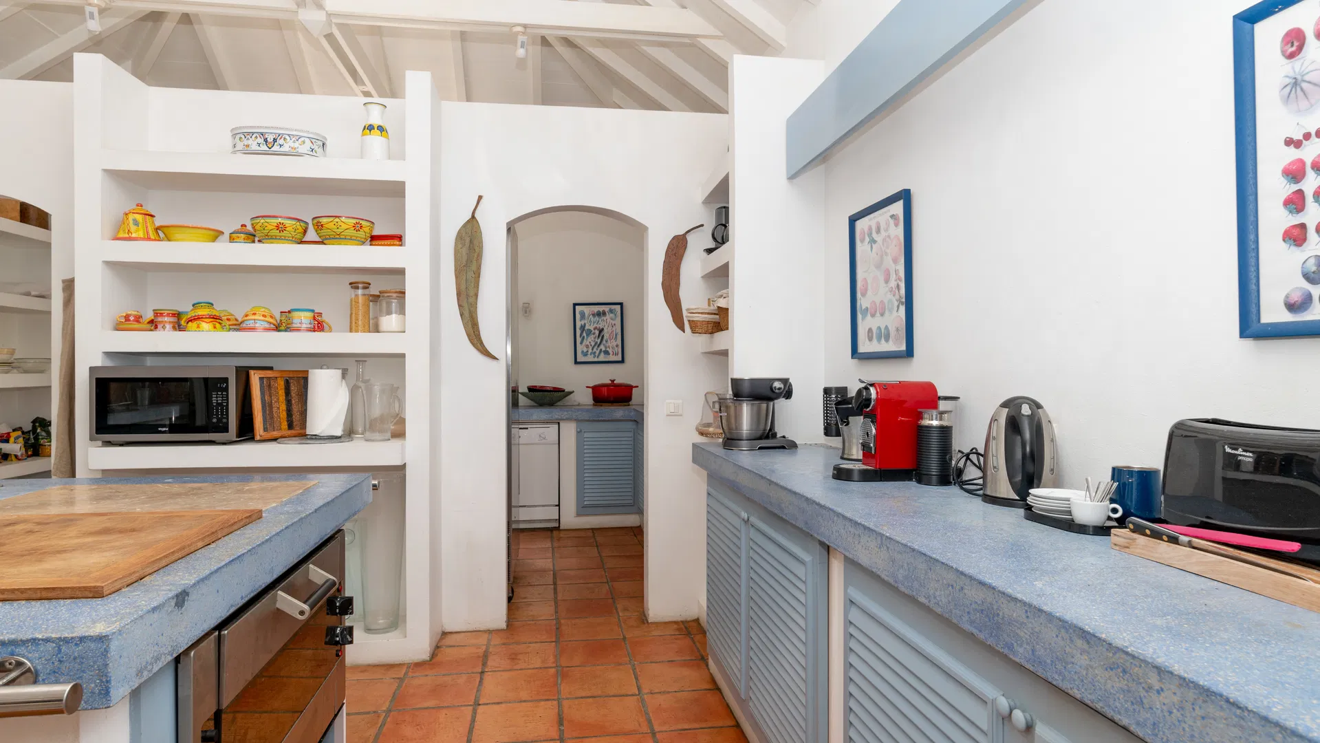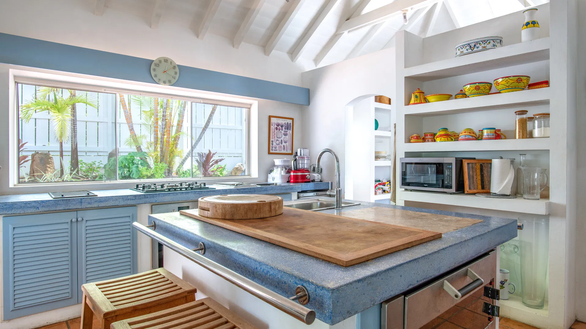 Cozy seating areas on the covered terrace are ideal for a final drink under the stars or coffee in the morning. There are eight seats at the dining table, which is close enough to the spacious, fully furnished kitchen to allow for uninterrupted conversation while plates and platters are being brought in and taken out. Do you like the breeze? The garden serves as the backdrop for the terrace dining area, which is situated in the gentle wash of the trade winds.