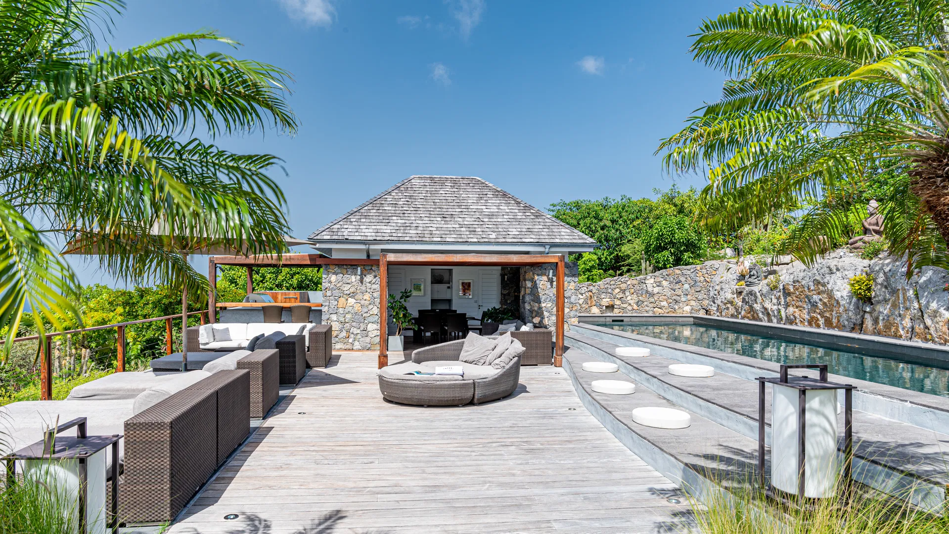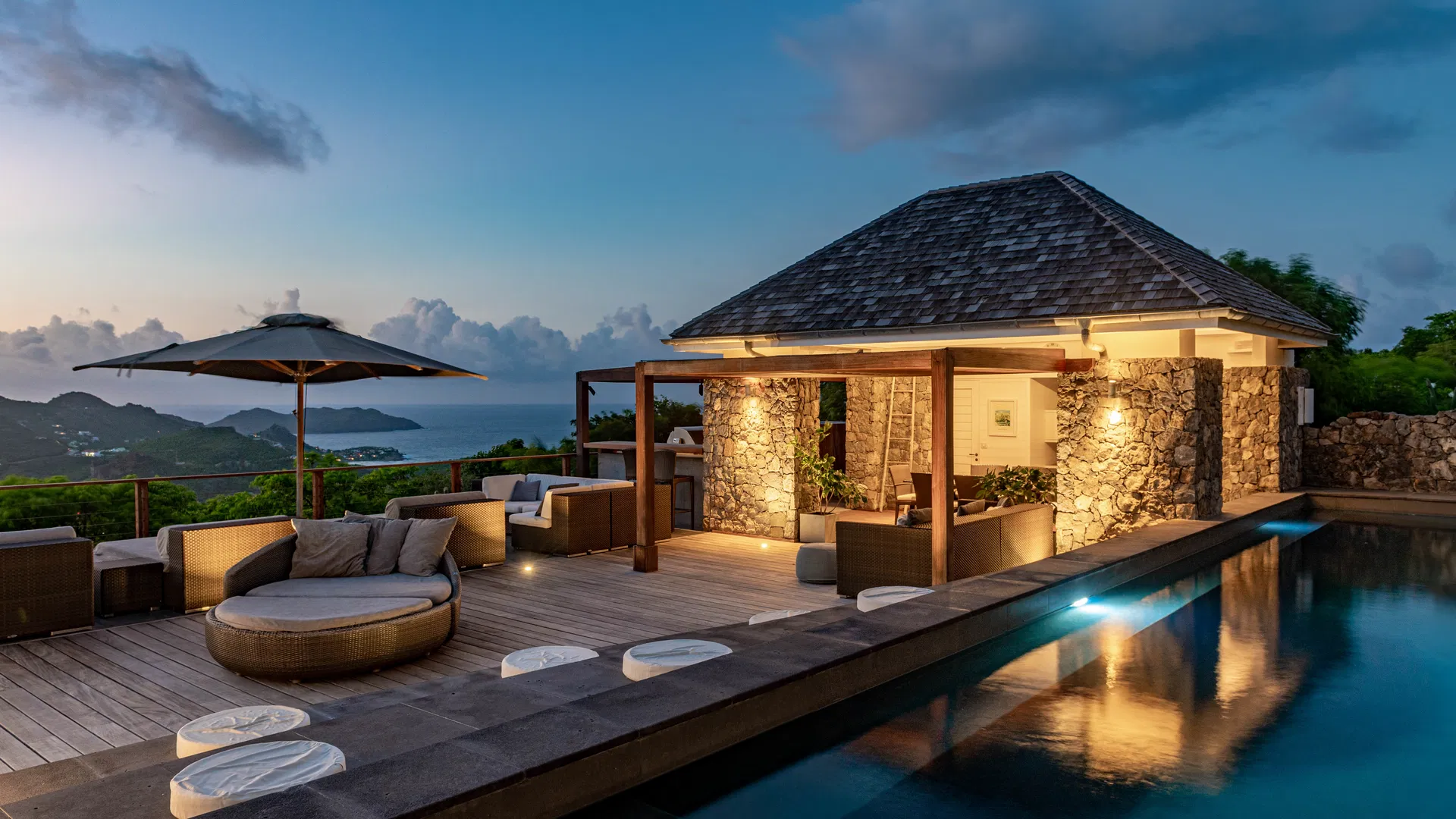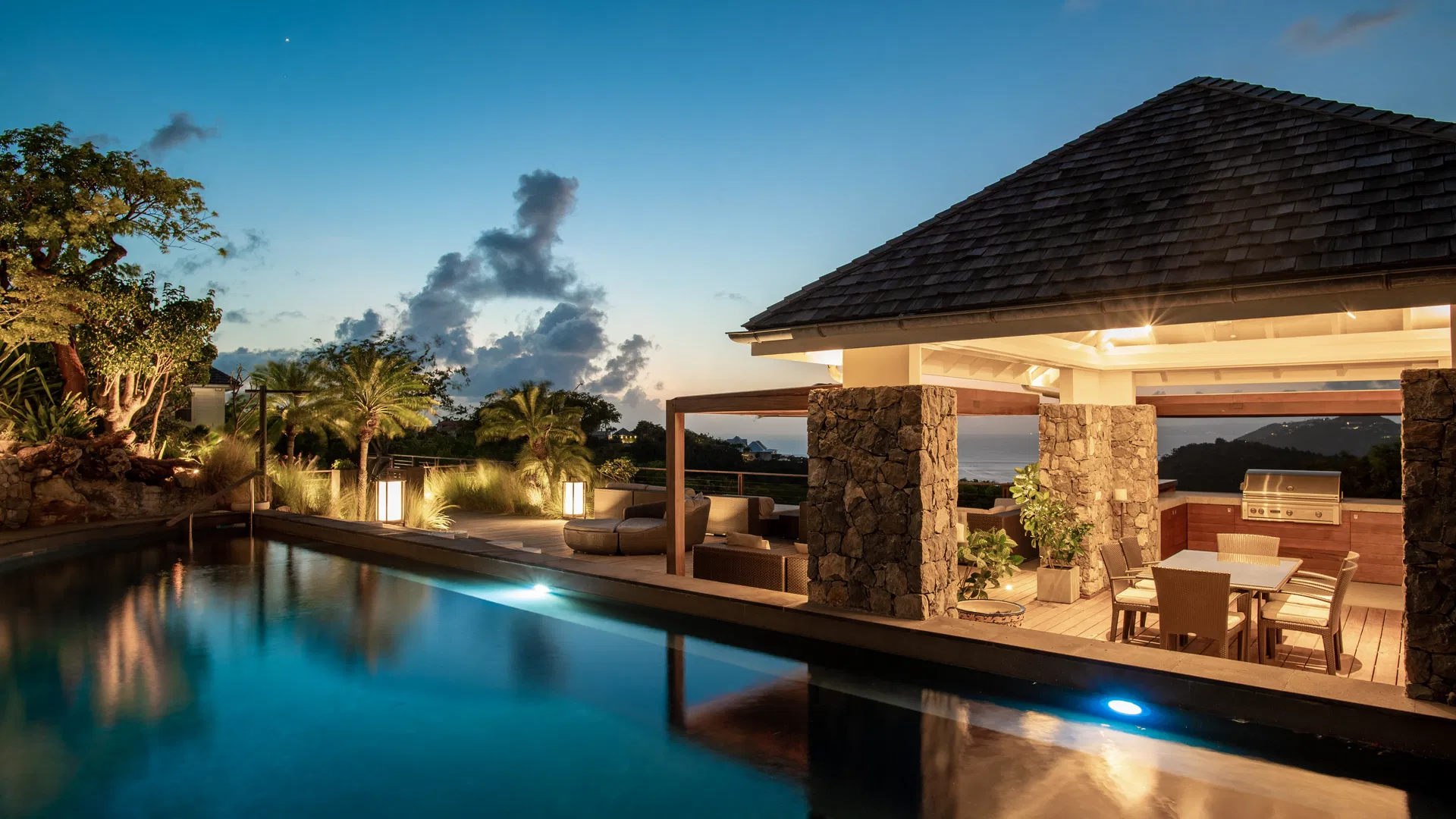 Mornings start with a stroll across dew-cool grass to check the sea and the aroma of frangipani. The billiards cue clicks, the grill warms, someone sets the terrace table as the sky tilts toward apricot, and afternoons drift between the heated pool and the shaded verandas. With so many pavilions, finding peace and quiet is effortless. Take a nap here, read there, and then gather in the gazebo for sunset while St. Jean’s lights flicker below.