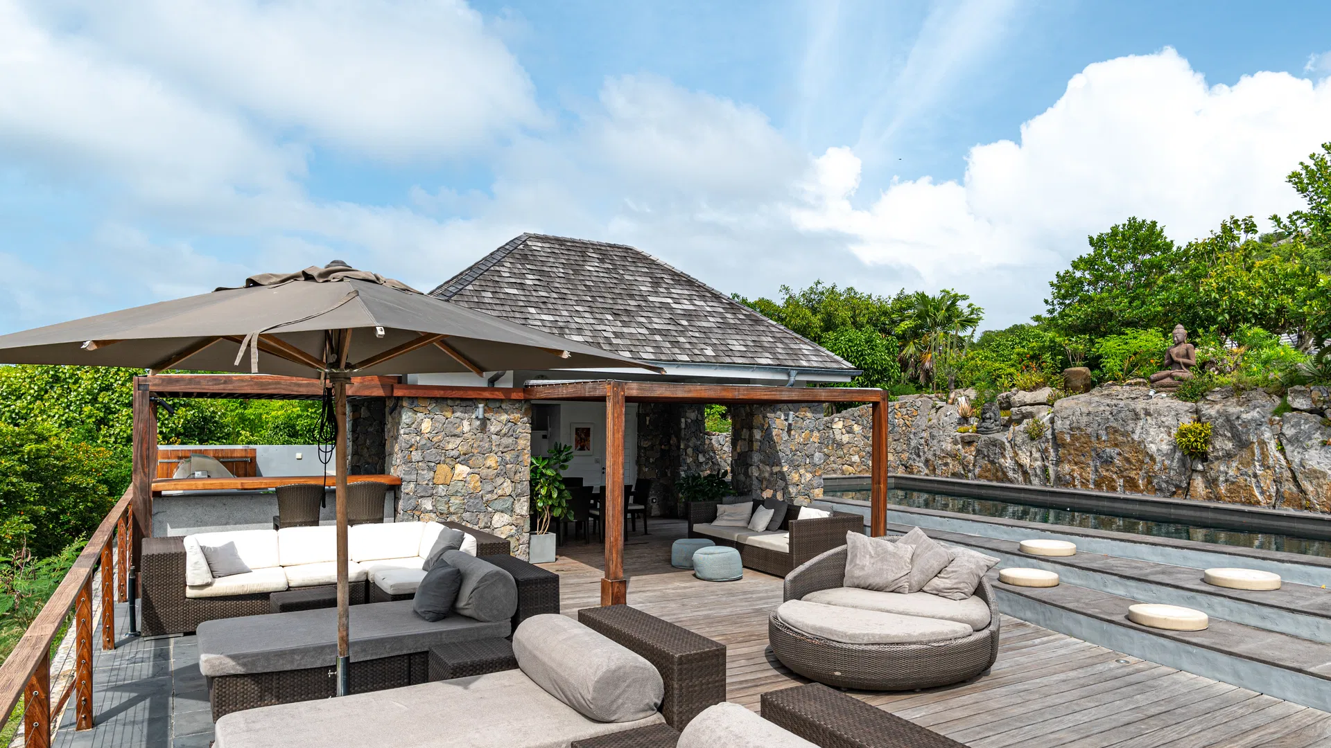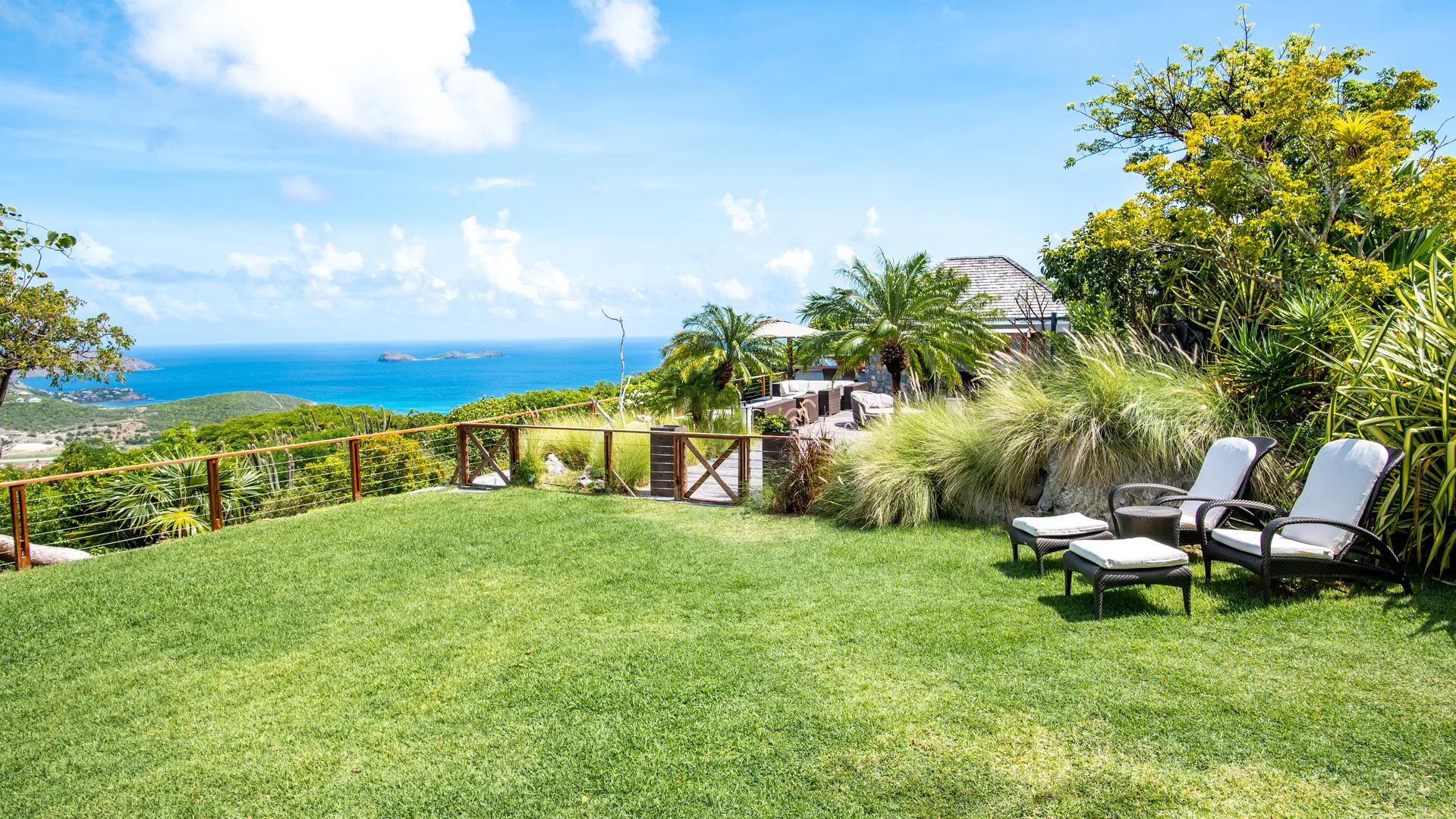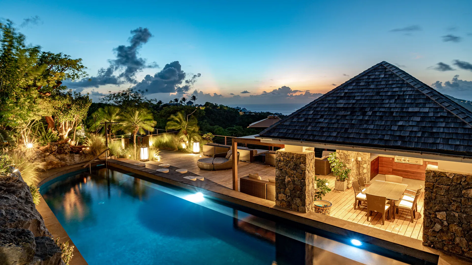 Mornings start with a stroll across dew-cool grass to check the sea and the aroma of frangipani. The billiards cue clicks, the grill warms, someone sets the terrace table as the sky tilts toward apricot, and afternoons drift between the heated pool and the shaded verandas. With so many pavilions, finding peace and quiet is effortless. Take a nap here, read there, and then gather in the gazebo for sunset while St. Jean’s lights flicker below.