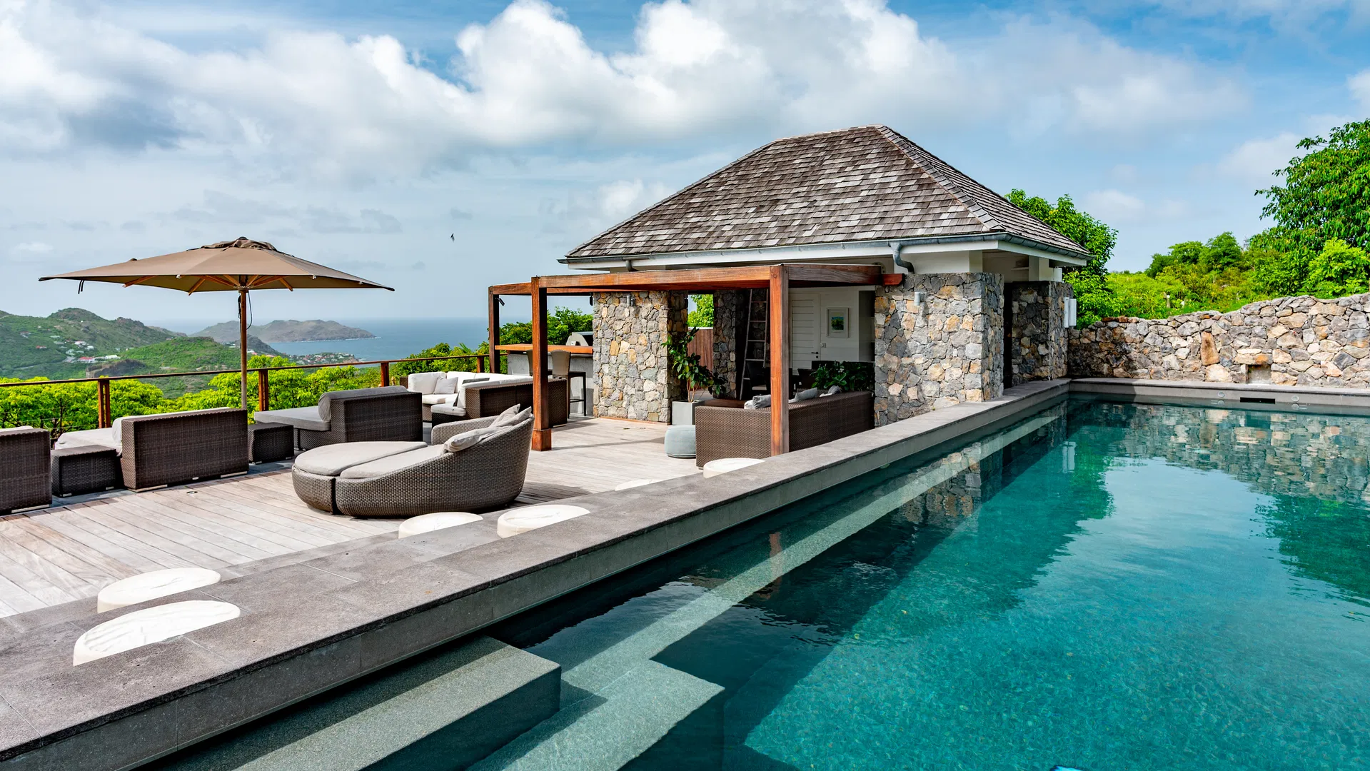 The island unfolds in front of you as you stroll across the lawn to the end of the garden. A front-row seat to color and light throughout the day, the heated pool overlooks St-Jean Bay and the surrounding hills. For lazy reading sessions, sprawl out on sunbeds or take a nap in the grass. Since the poolside gazebo has a summer kitchen and barbecue, grilled lobster, colorful salads, and clinking glasses can all take place there without obtruding the view as evening draws near.