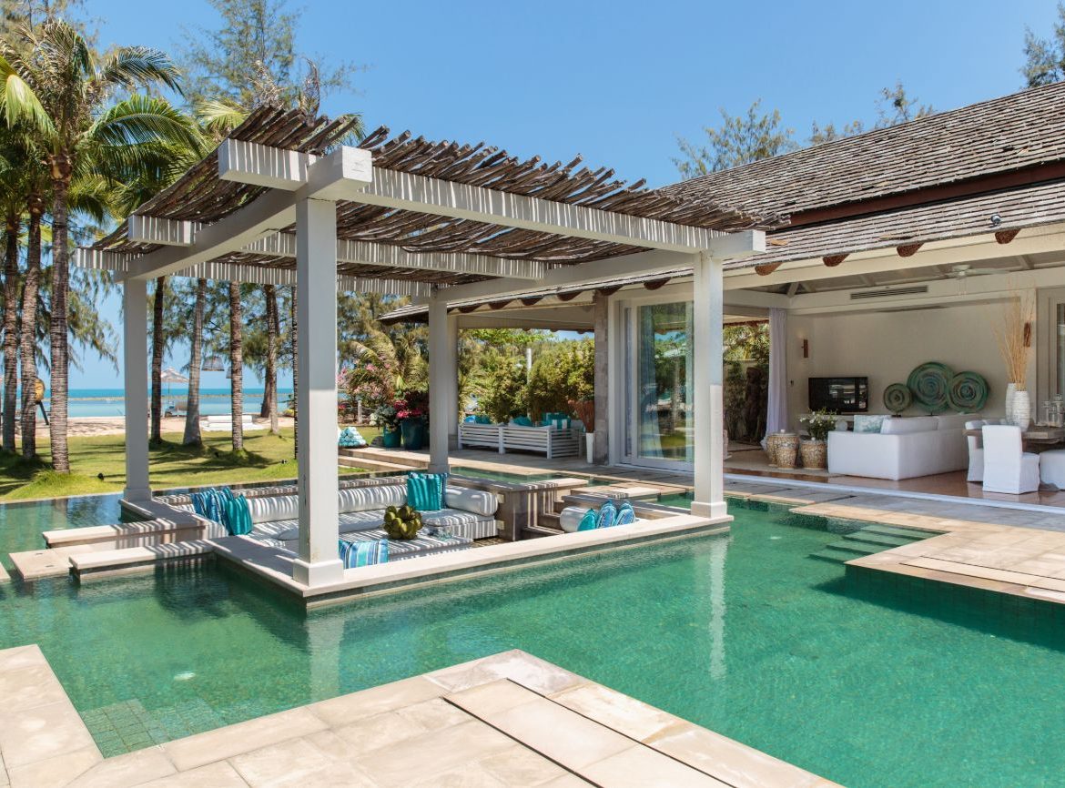 The spacious open-plan living area is dominated by comfortable long white sofas and features a large flat screen TV. The fully equipped kitchen is defined by a long floating island feature, which has a built-in wine cooler and subtle black hobs while the dining table can seat ten. Beyond the kitchen is a covered Thaistyle kitchen with BBQ.