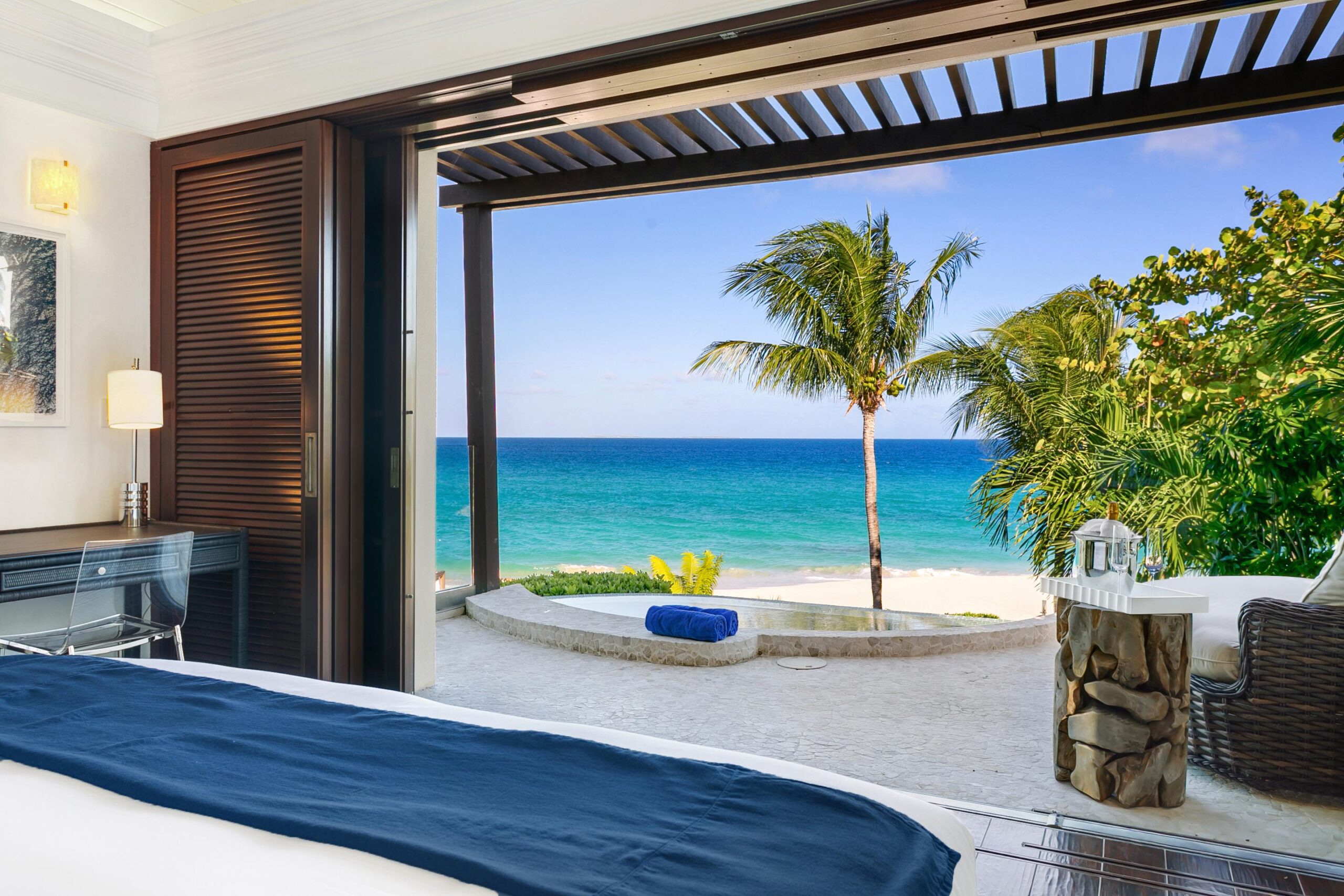 For a Caribbean beach dream, Nevaeh places you on Long Bay Beach, among Anguilla‘s most private and beautiful. Practice on the golf simulator before exploring gourmet dining spots on Meads Bay Beach. As your journey concludes, depart from Blowing Point Ferry Terminal (6.5 km away) or Clayton J. Lloyd International Airport (10 km away).